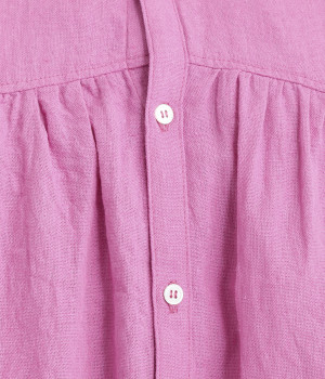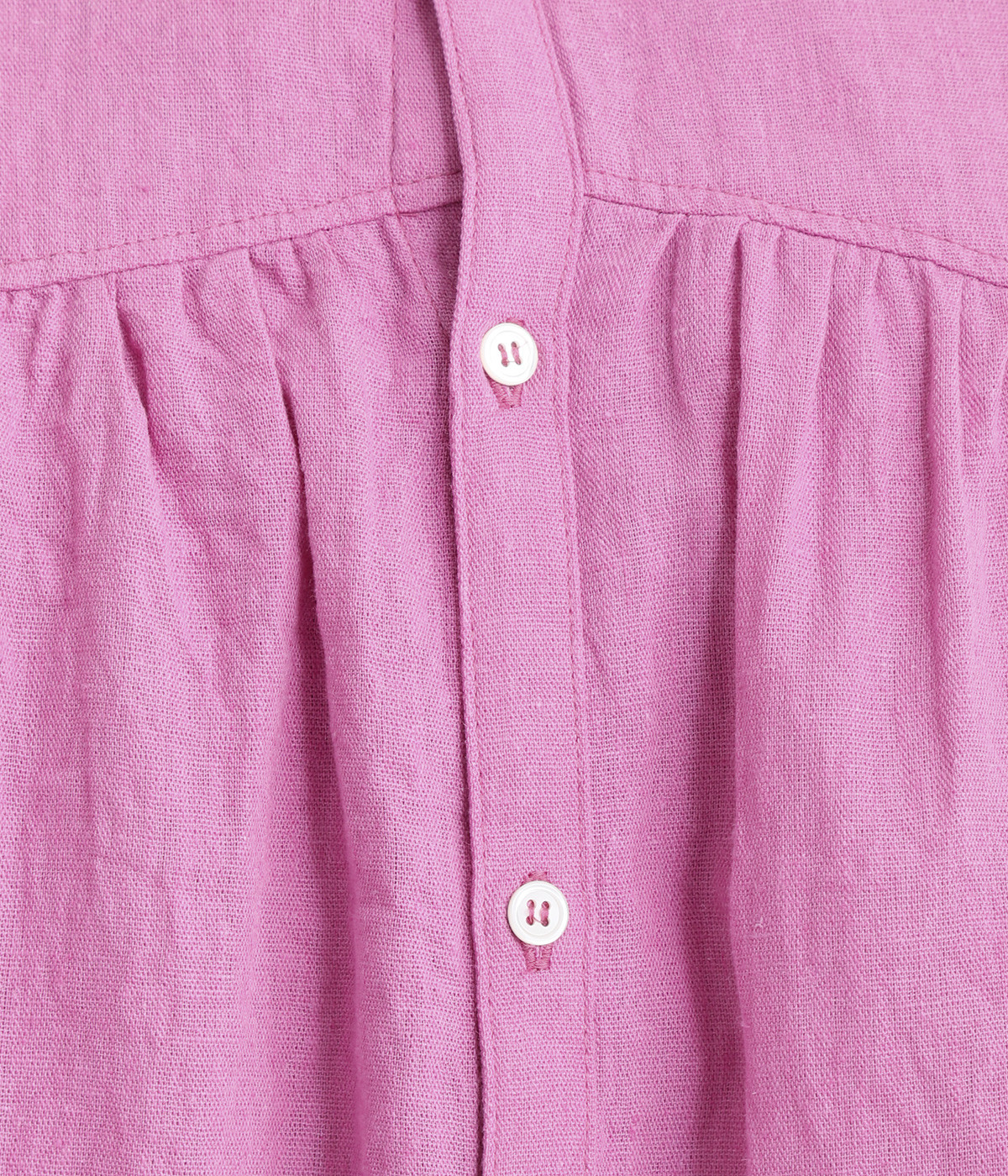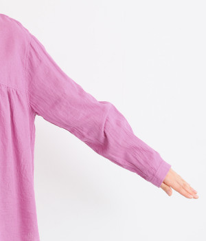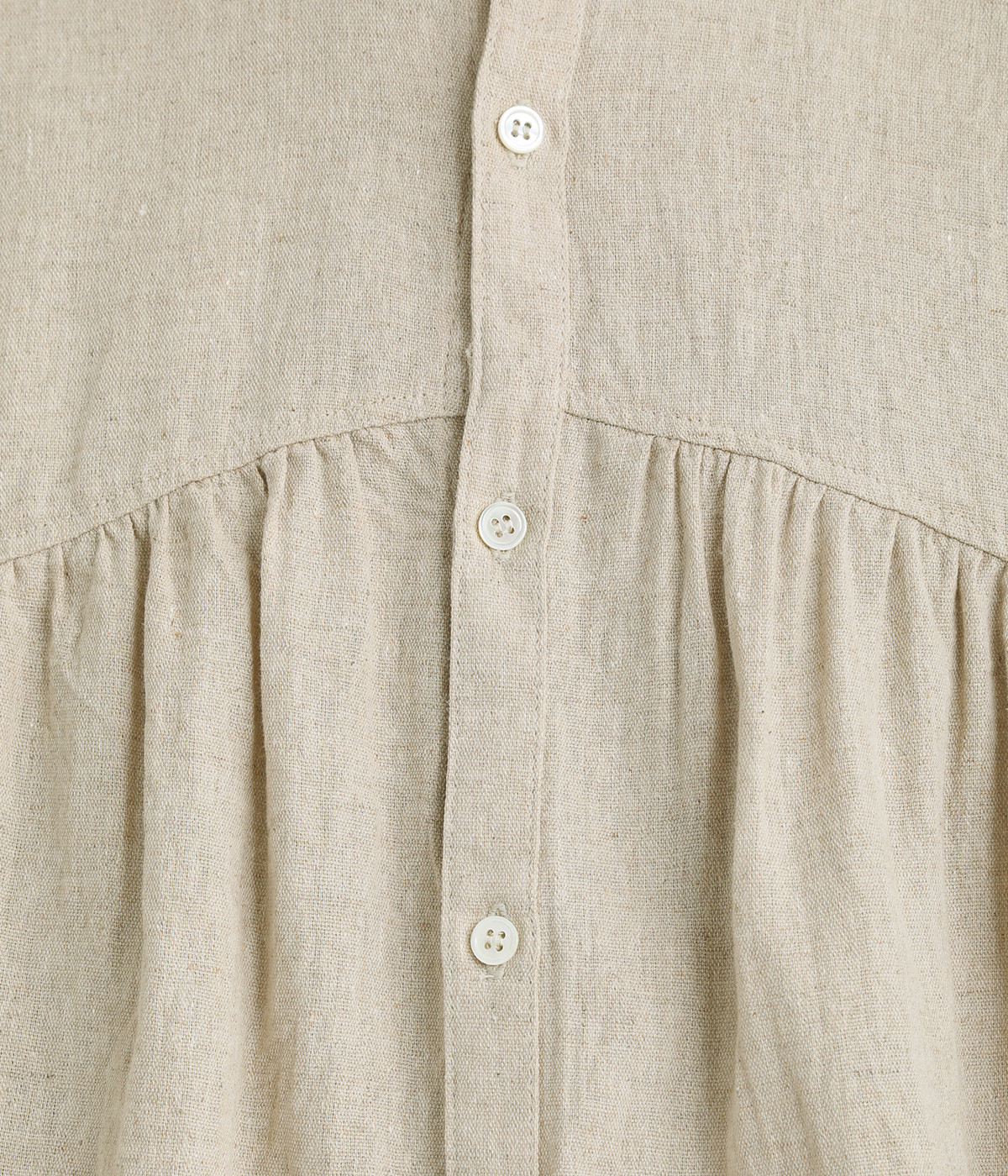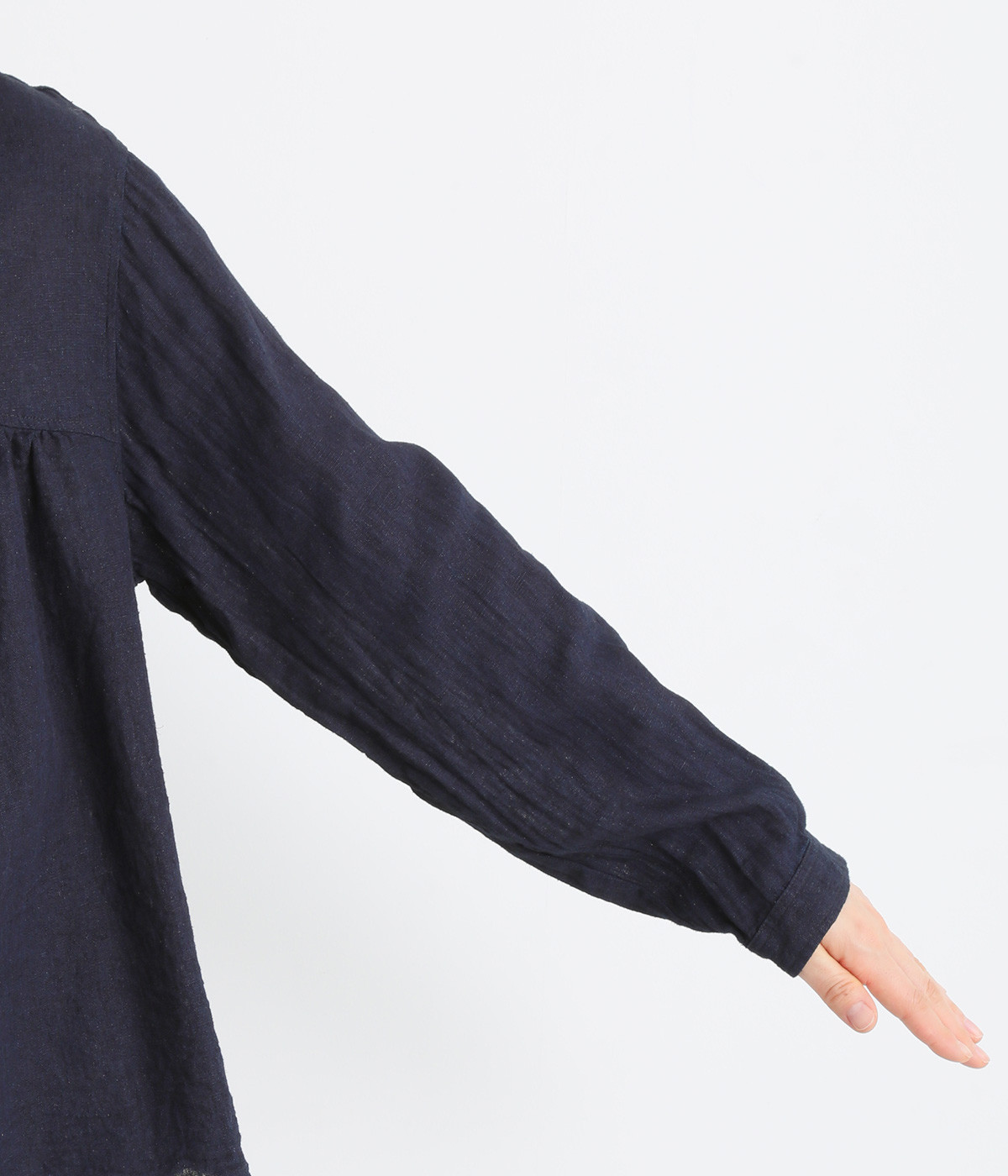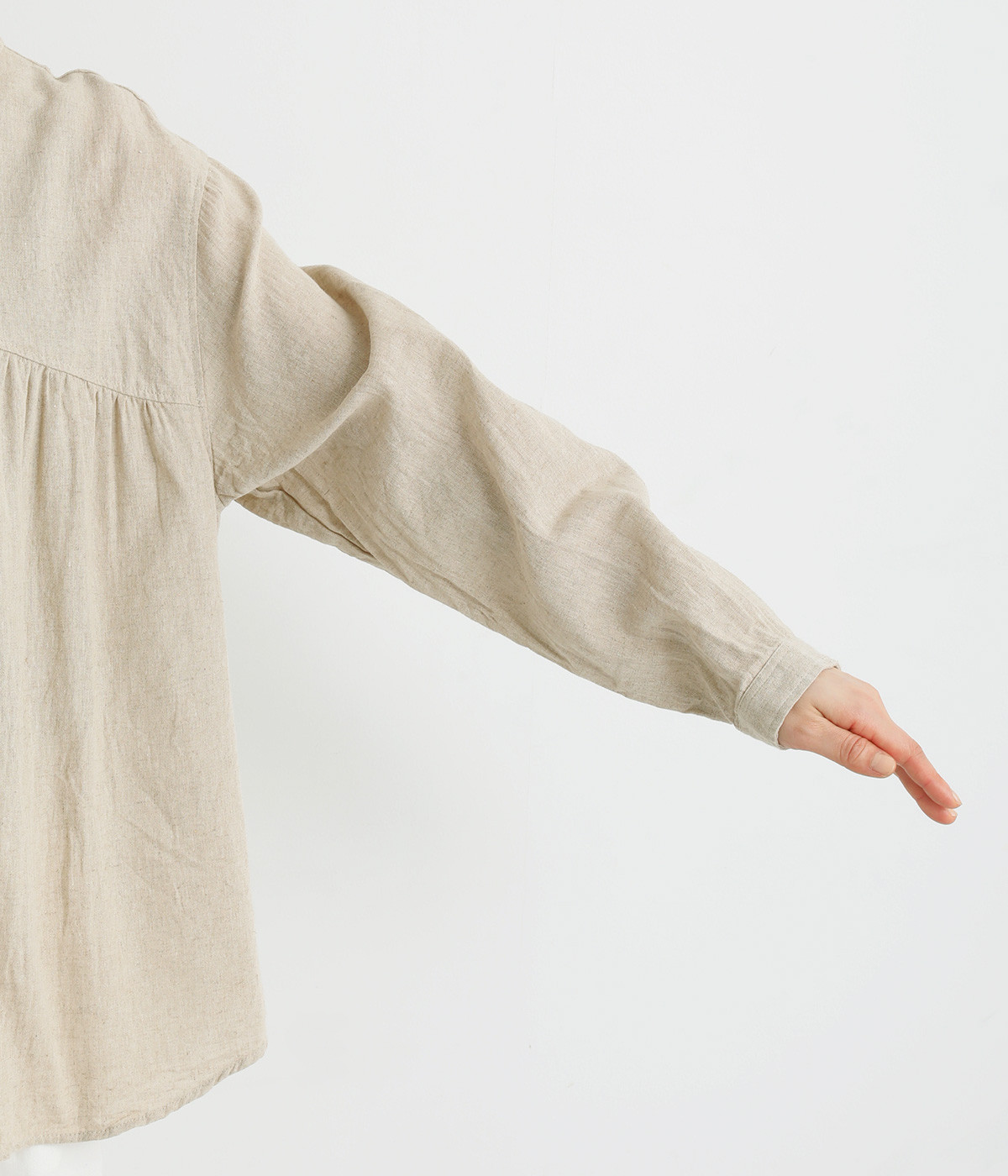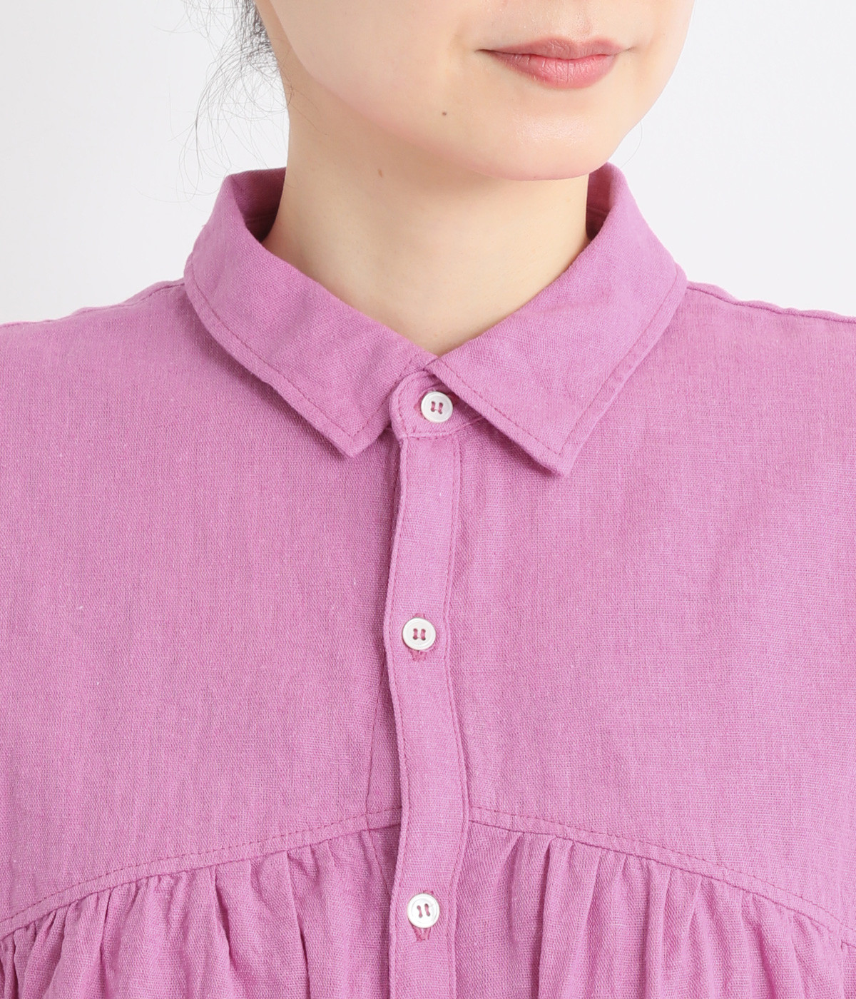 前後のヨークにギャザーを入れてふんわりとやさし気に。肩のラインをなめらかに見せるドロップショルダーや、たっぷりと体が泳ぐワイドシルエットでくつろぎムードを演出します。襟つきなのできちんと感はしっかりキープ。