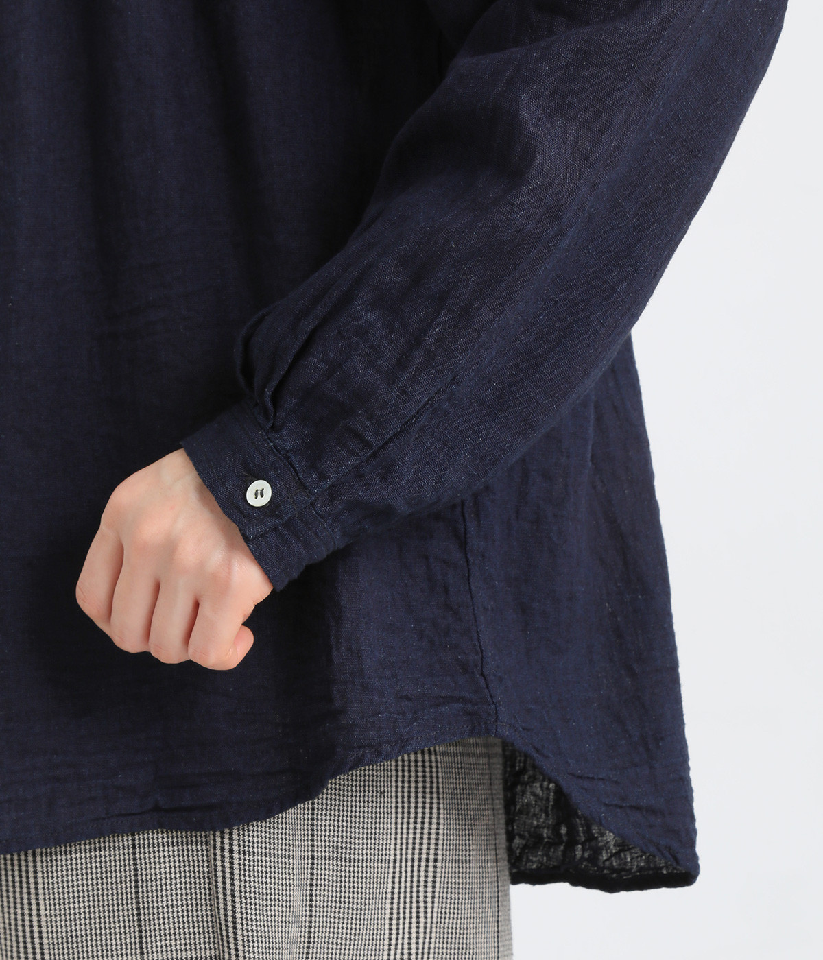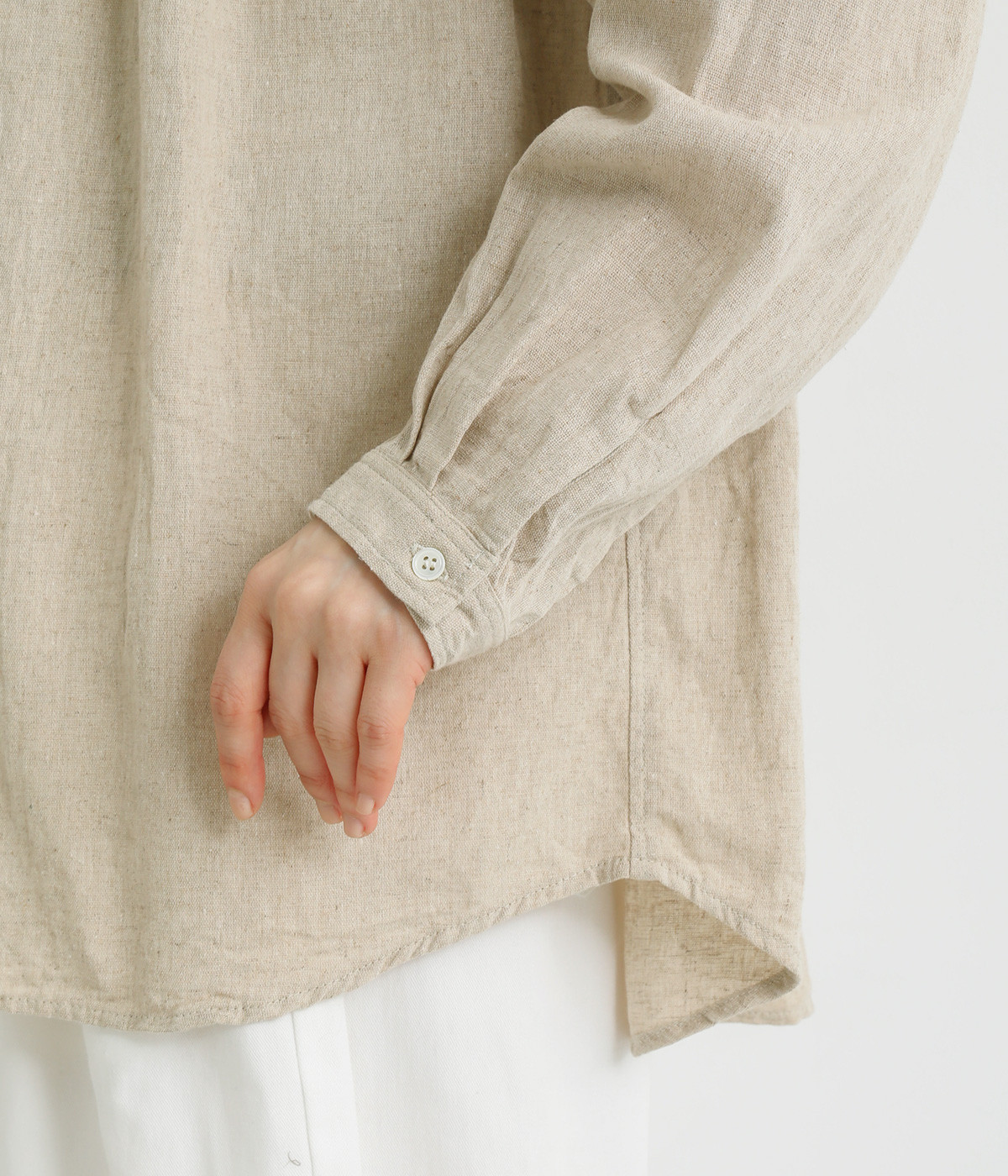 麻と綿を混紡した素朴な雰囲気あふれるナチュラルな生地感がお気に入り。ネップが指先に触れる豊かな生地表情が着こなしのニュアンスを高めます。さわやかな着こなしを演出する素材に仕上げました。