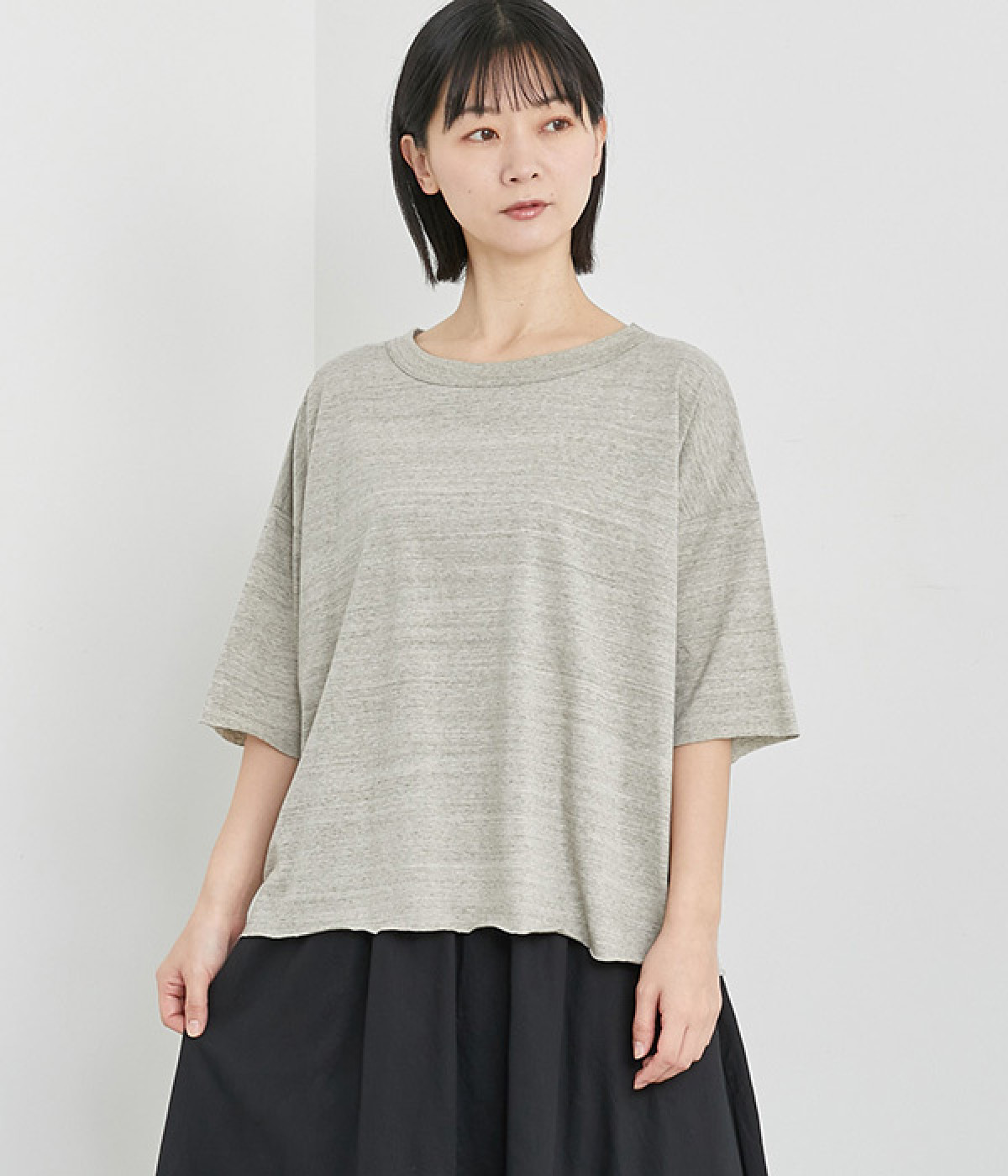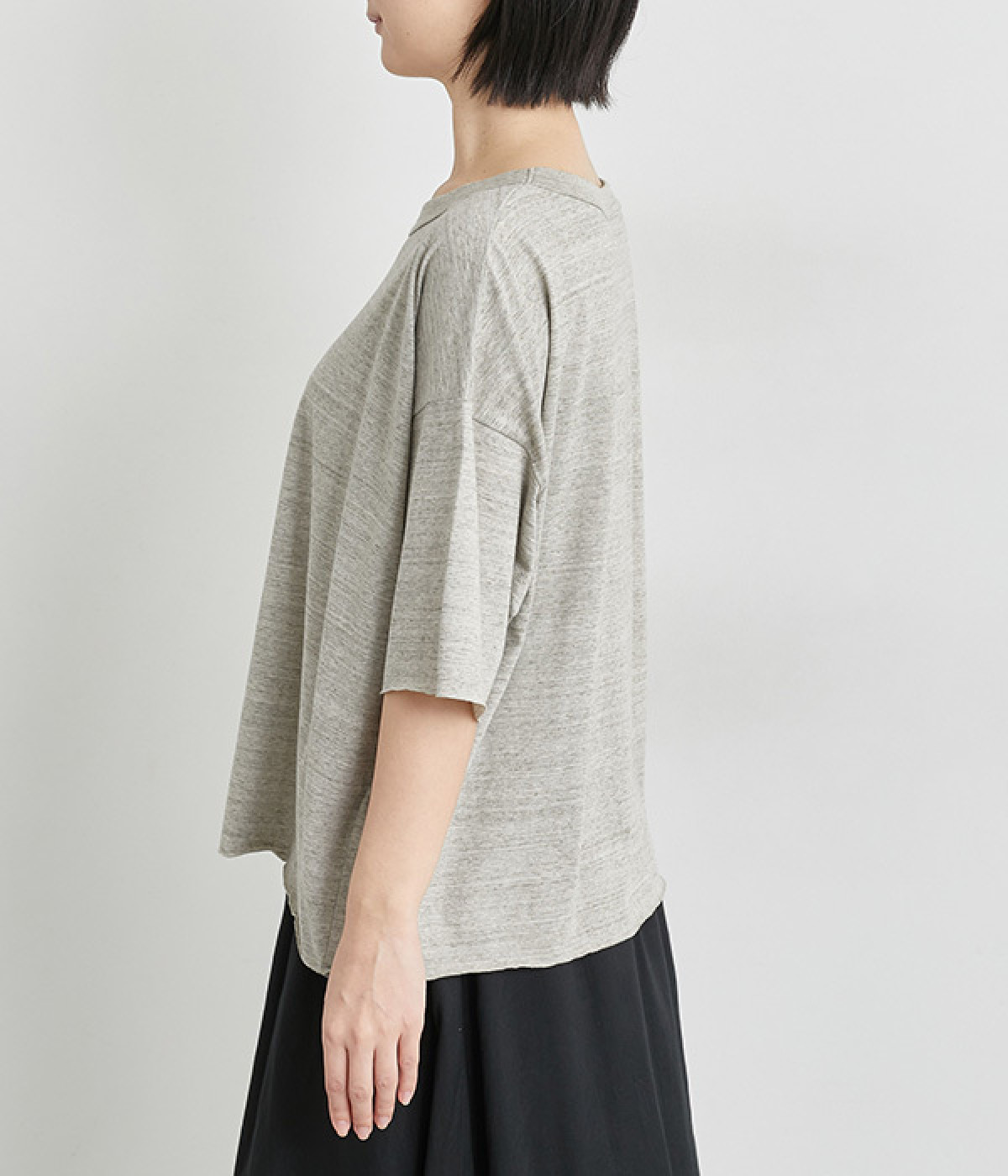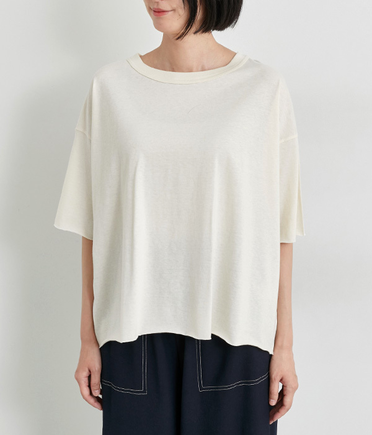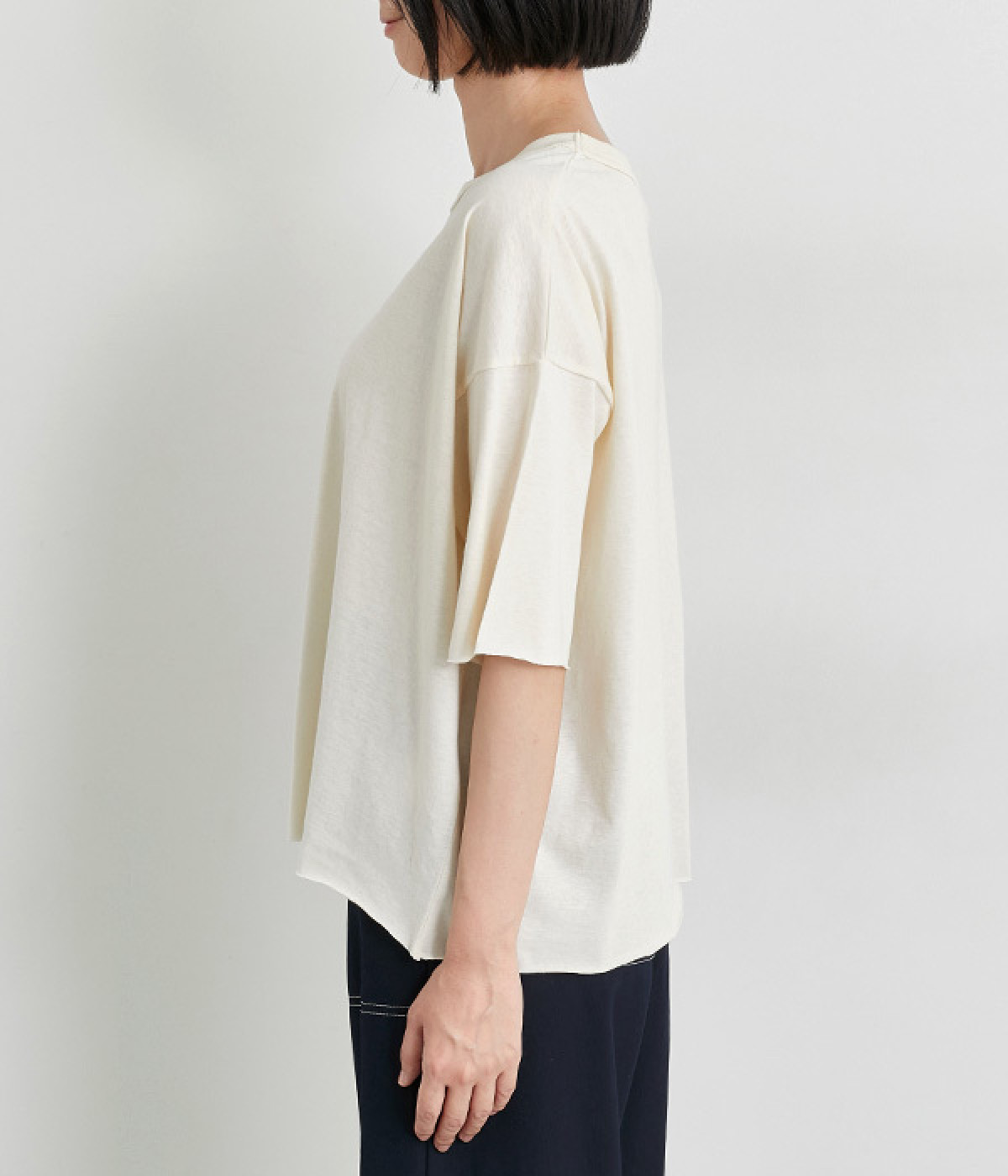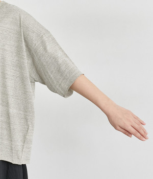 リラックス感のある着こなしがお似合いなドロップショルダーのワイドシルエットに仕上げました。カットオフしたラフさも雰囲気にマッチしています。無地でボトム合わせしやすく、シンプルな装いもサマになる一枚です。