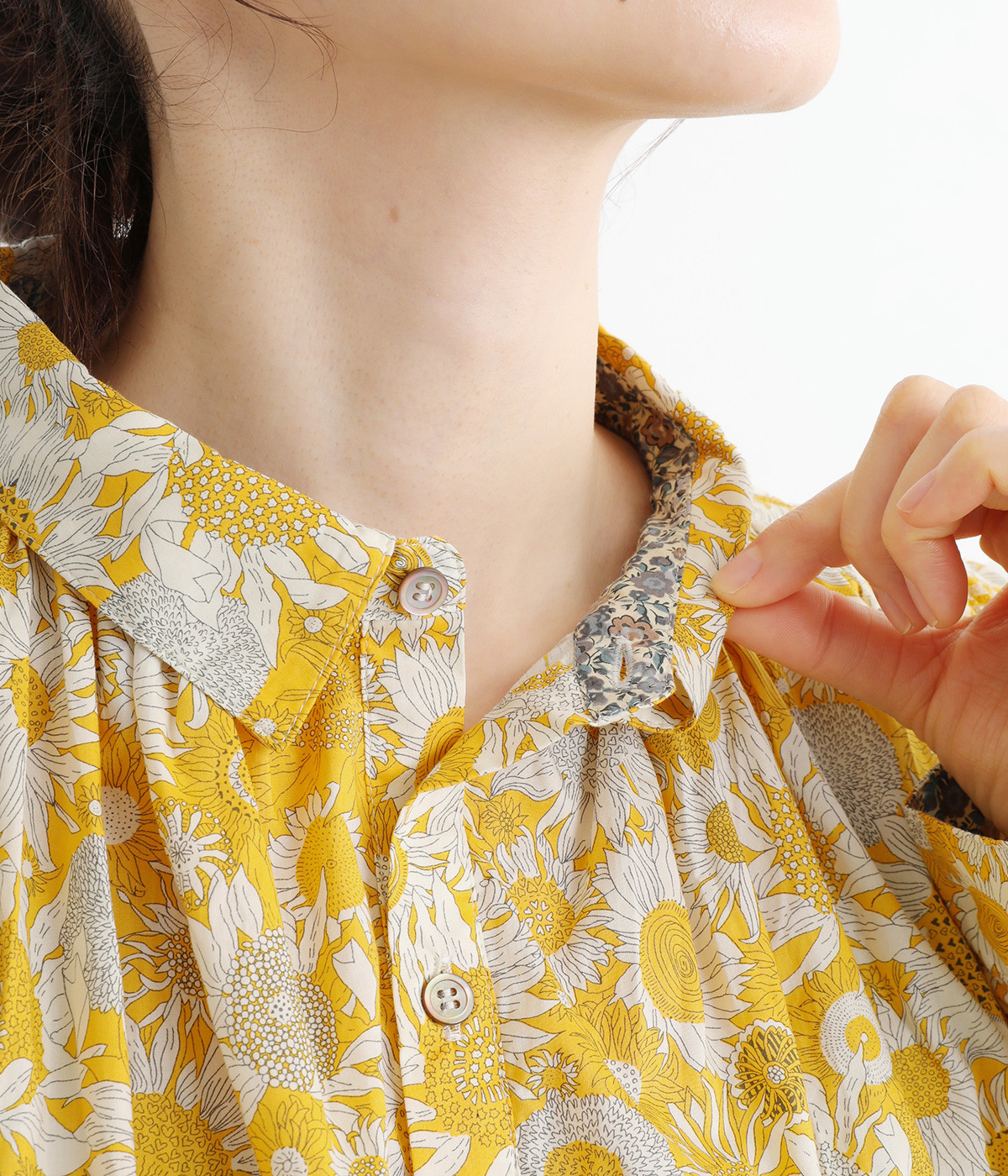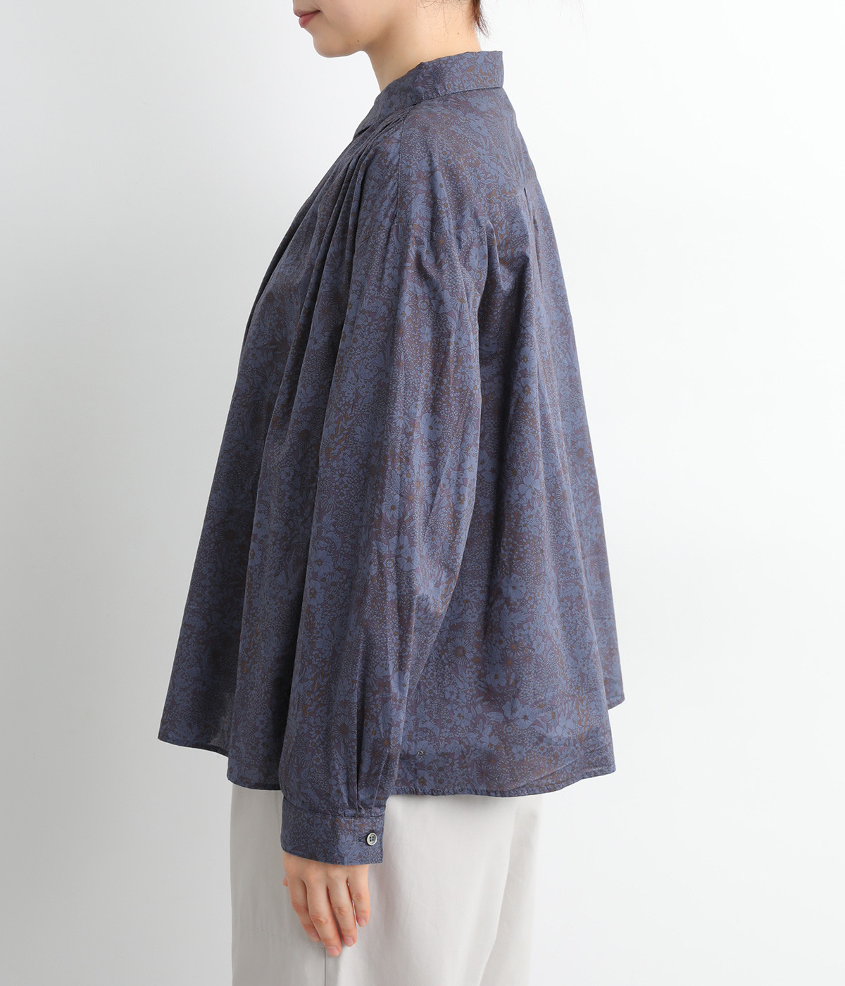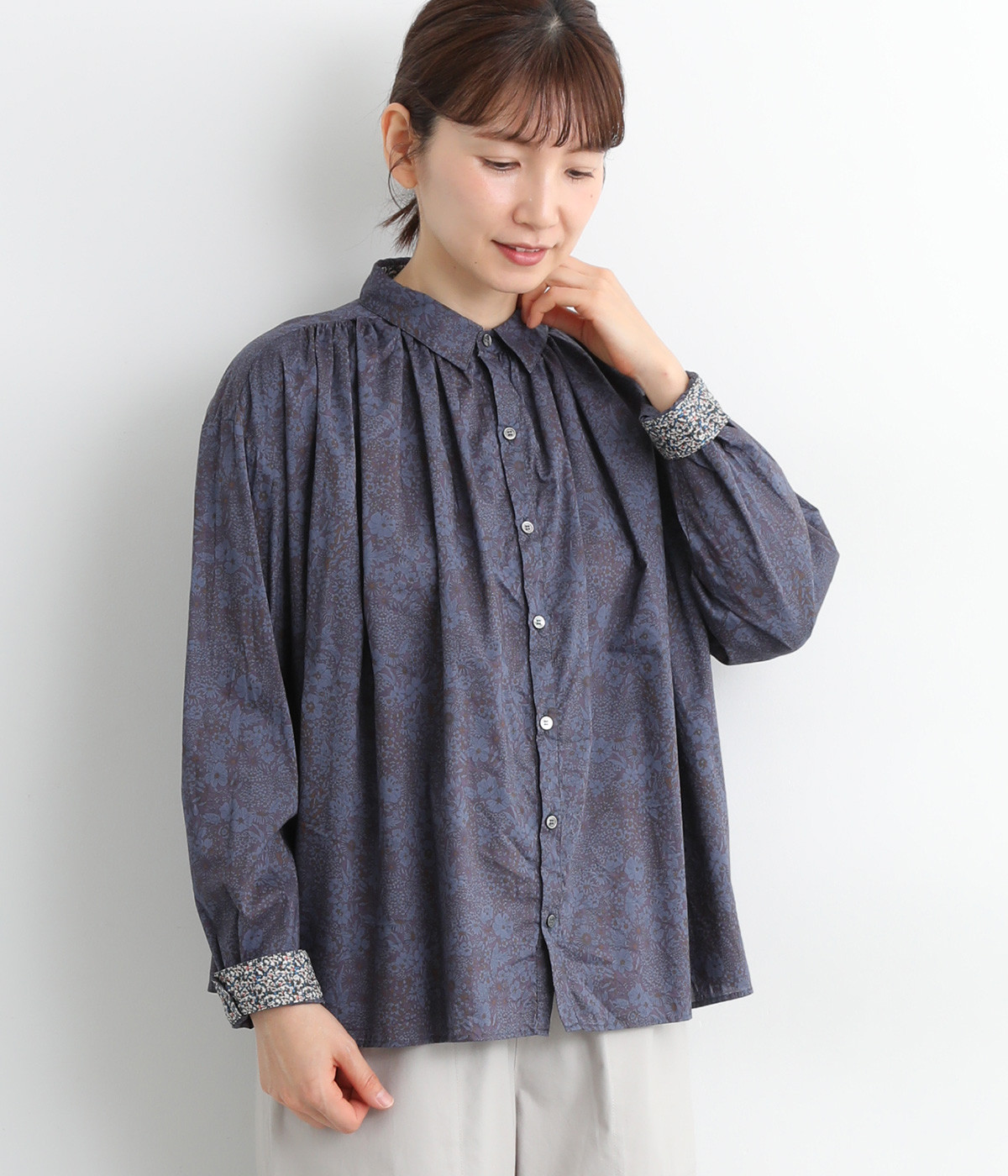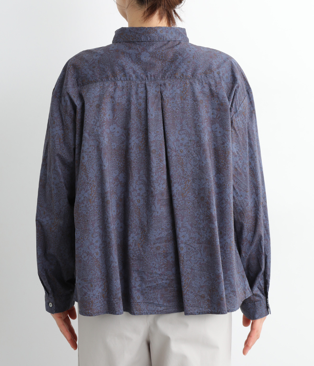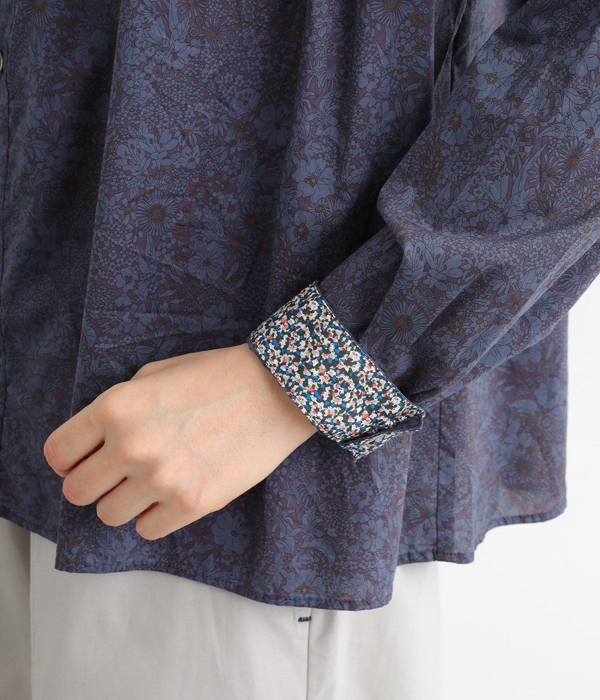 リバティ生地を活かしたシンプルなデザインのシャツです。適度に分量を持たせたフレア感のあるシルエットで着映え力を高めるポイントに。ほんのりきらめく小ぶりなボタンも優雅な雰囲気にマッチしています。