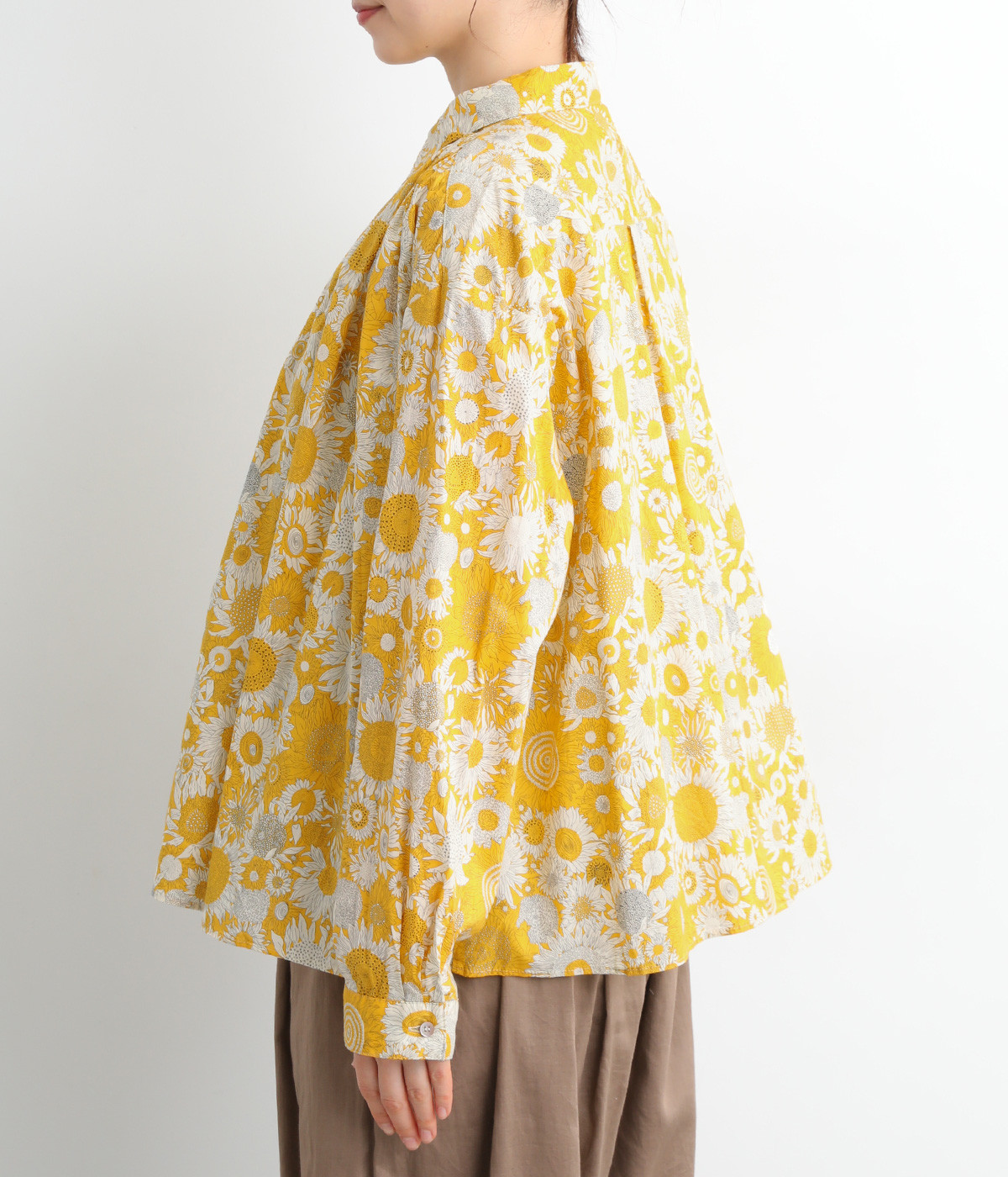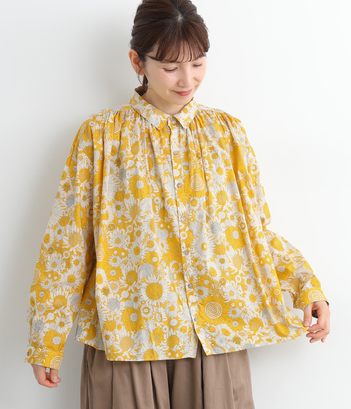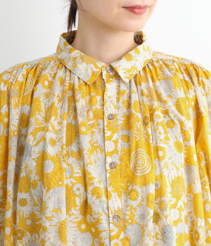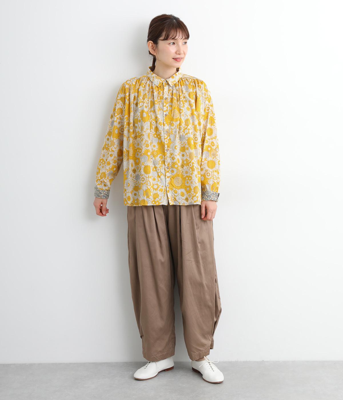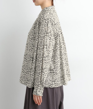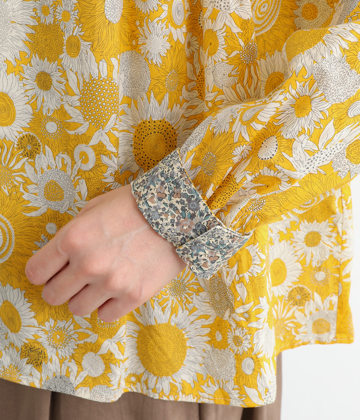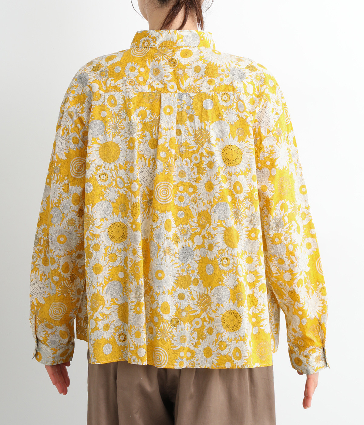 リバティ生地を活かしたシンプルなデザインのシャツです。適度に分量を持たせたフレア感のあるシルエットで着映え力を高めるポイントに。ほんのりきらめく小ぶりなボタンも優雅な雰囲気にマッチしています。