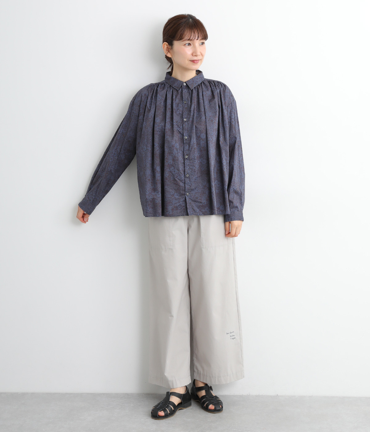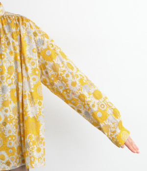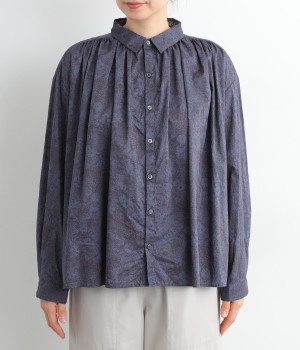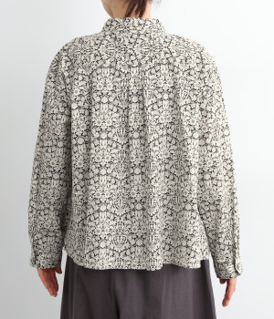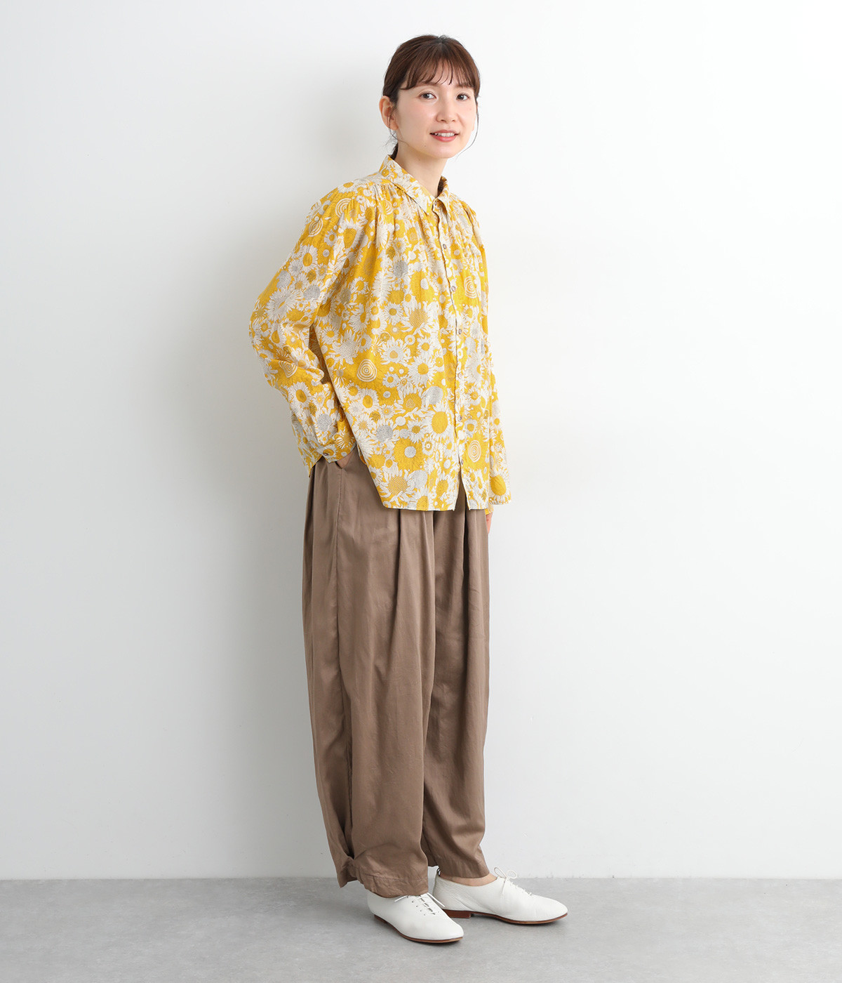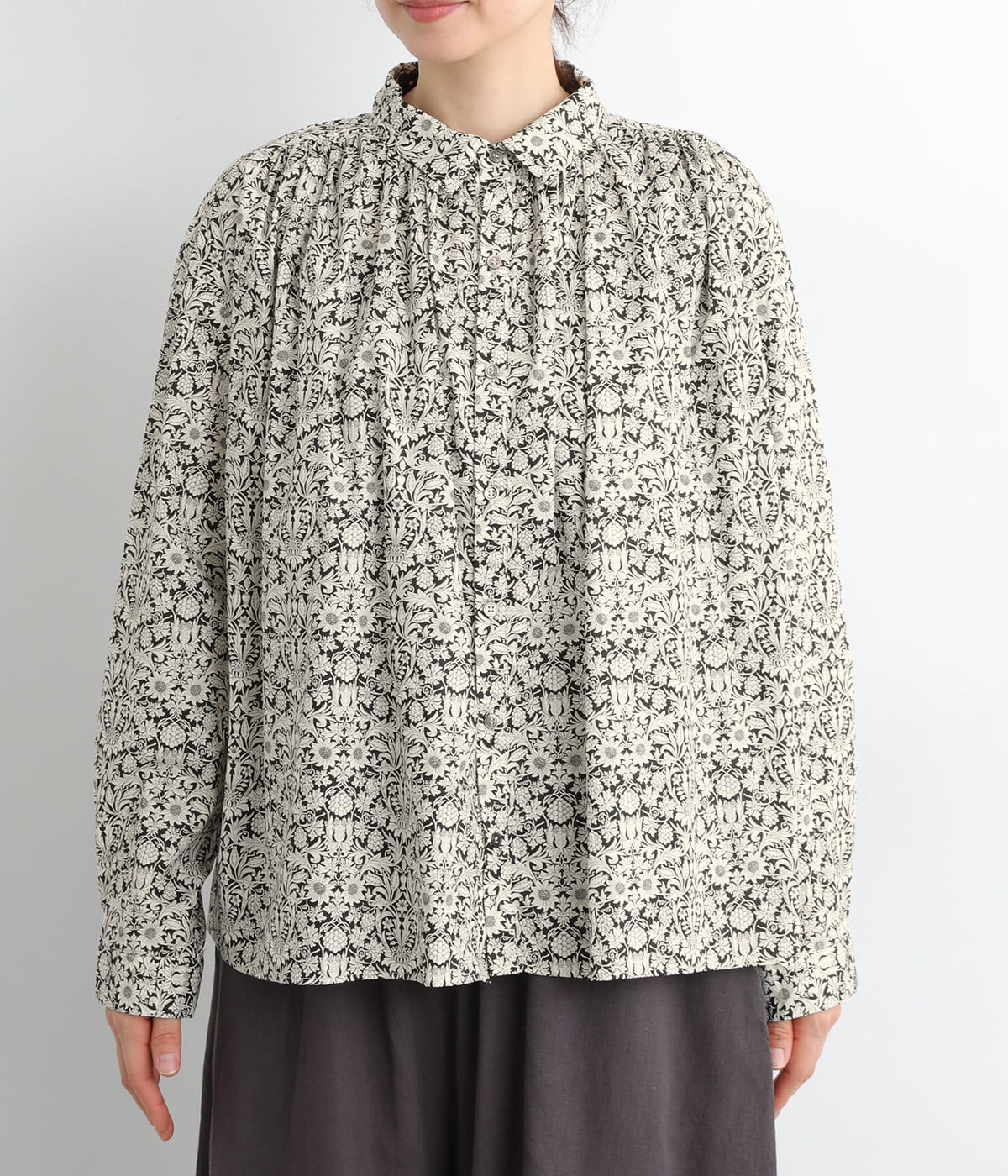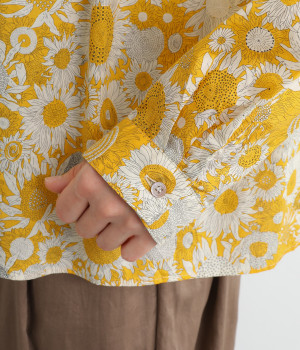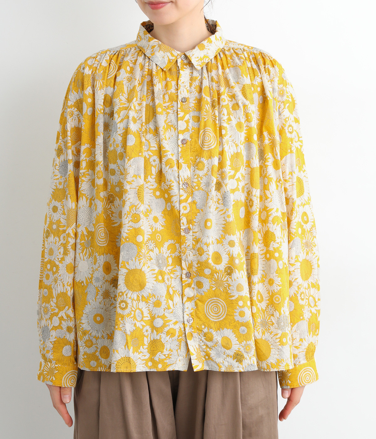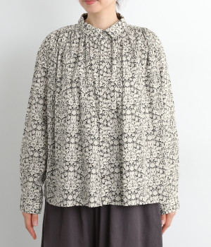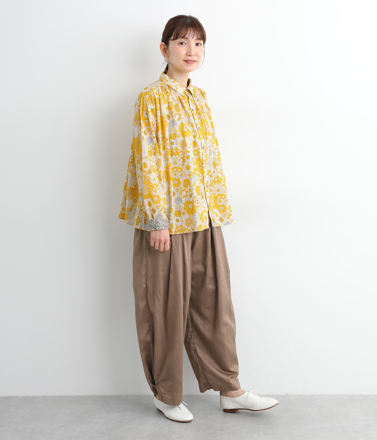 リバティ生地を活かしたシンプルなデザインのシャツです。適度に分量を持たせたフレア感のあるシルエットで着映え力を高めるポイントに。ほんのりきらめく小ぶりなボタンも優雅な雰囲気にマッチしています。