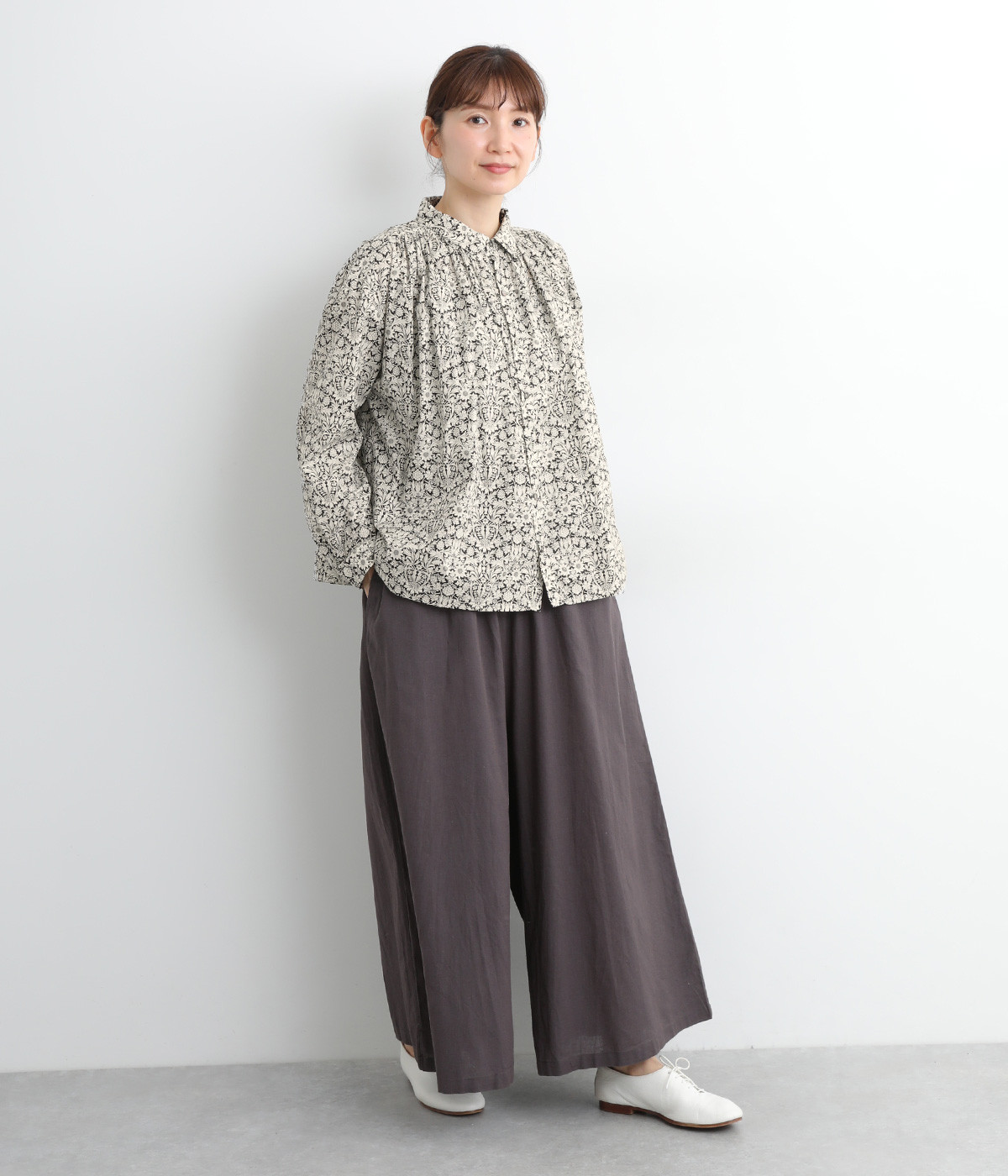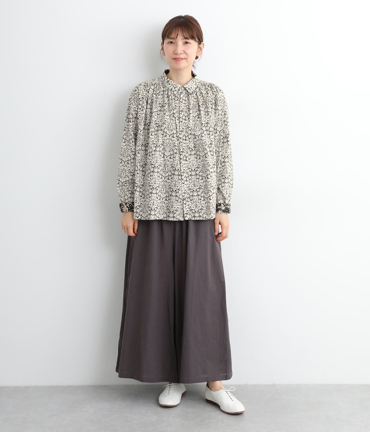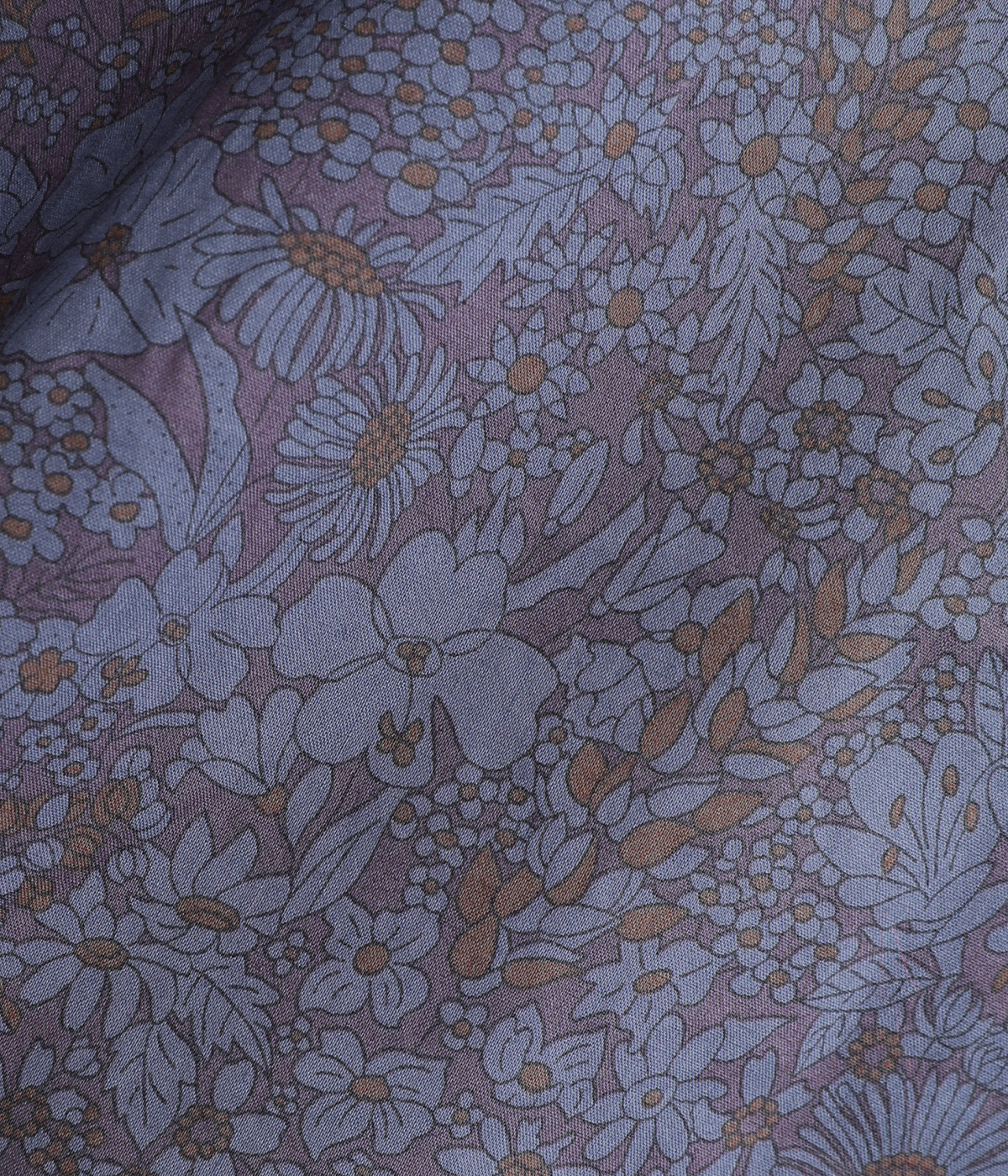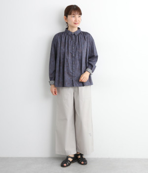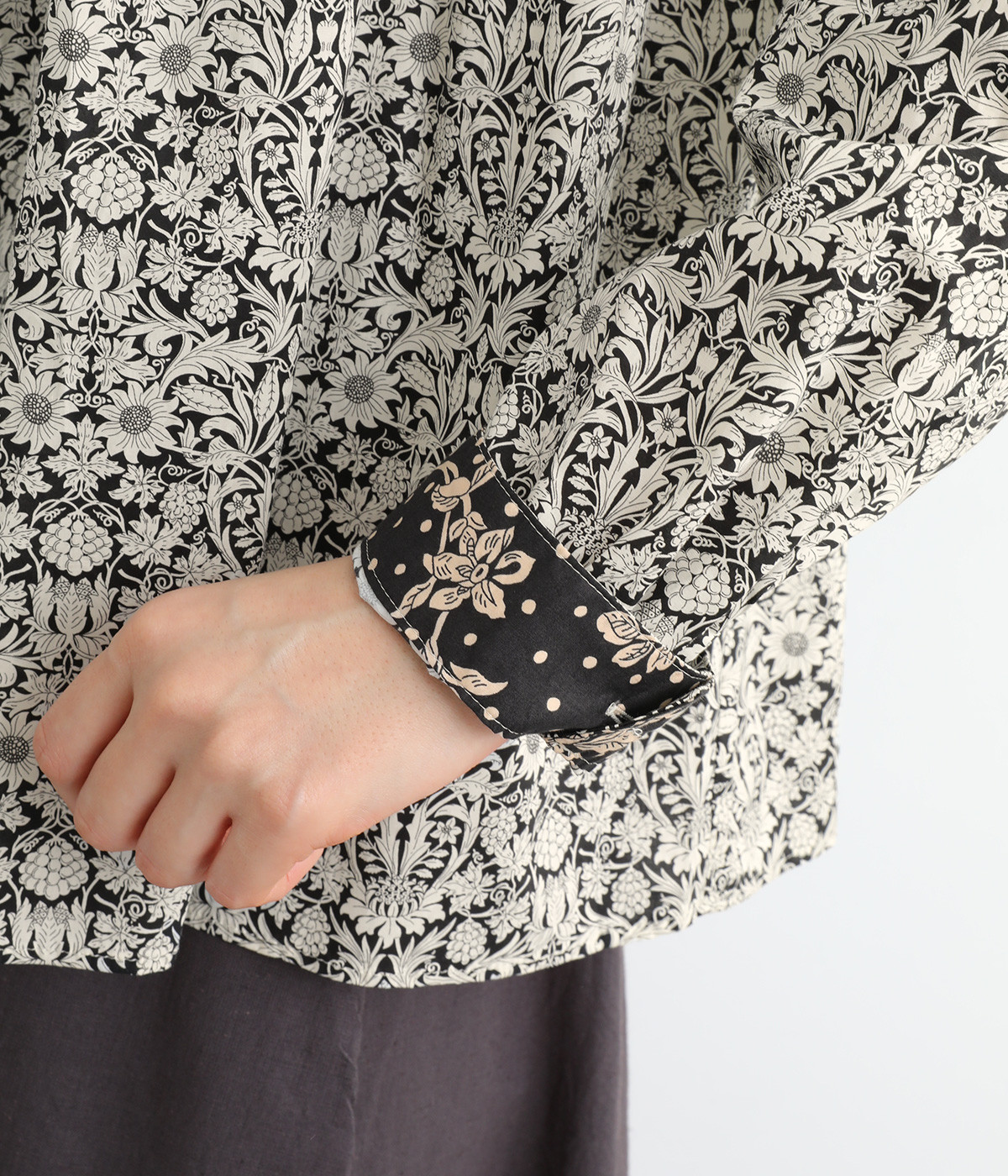 なめらかな肌触りにきれいな表面感が品のいいコットン生地に、華やかなリバティプリントをのせました。薄手で肌離れが良く季節をまたいで着まわせます。