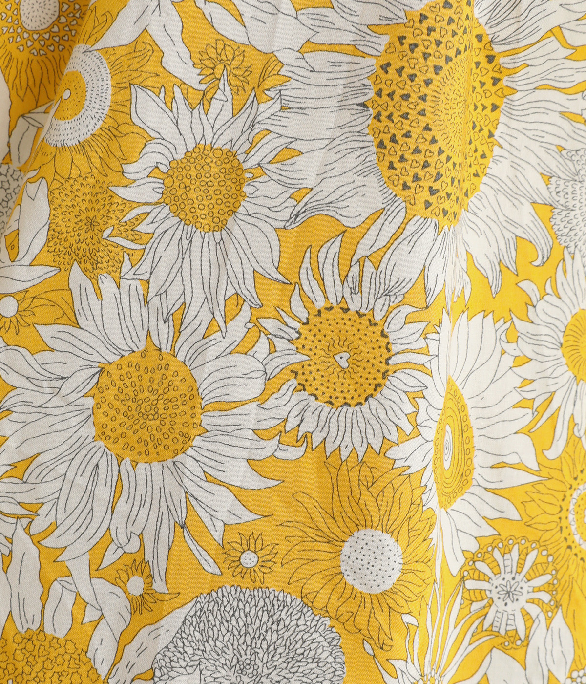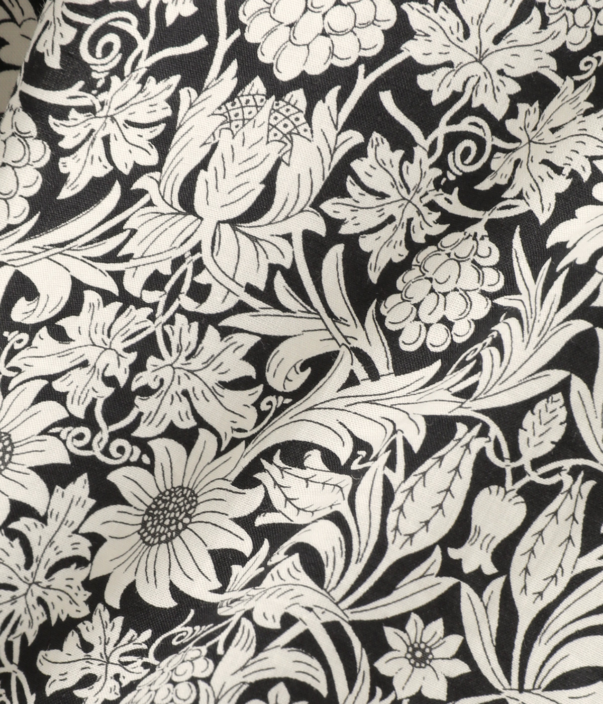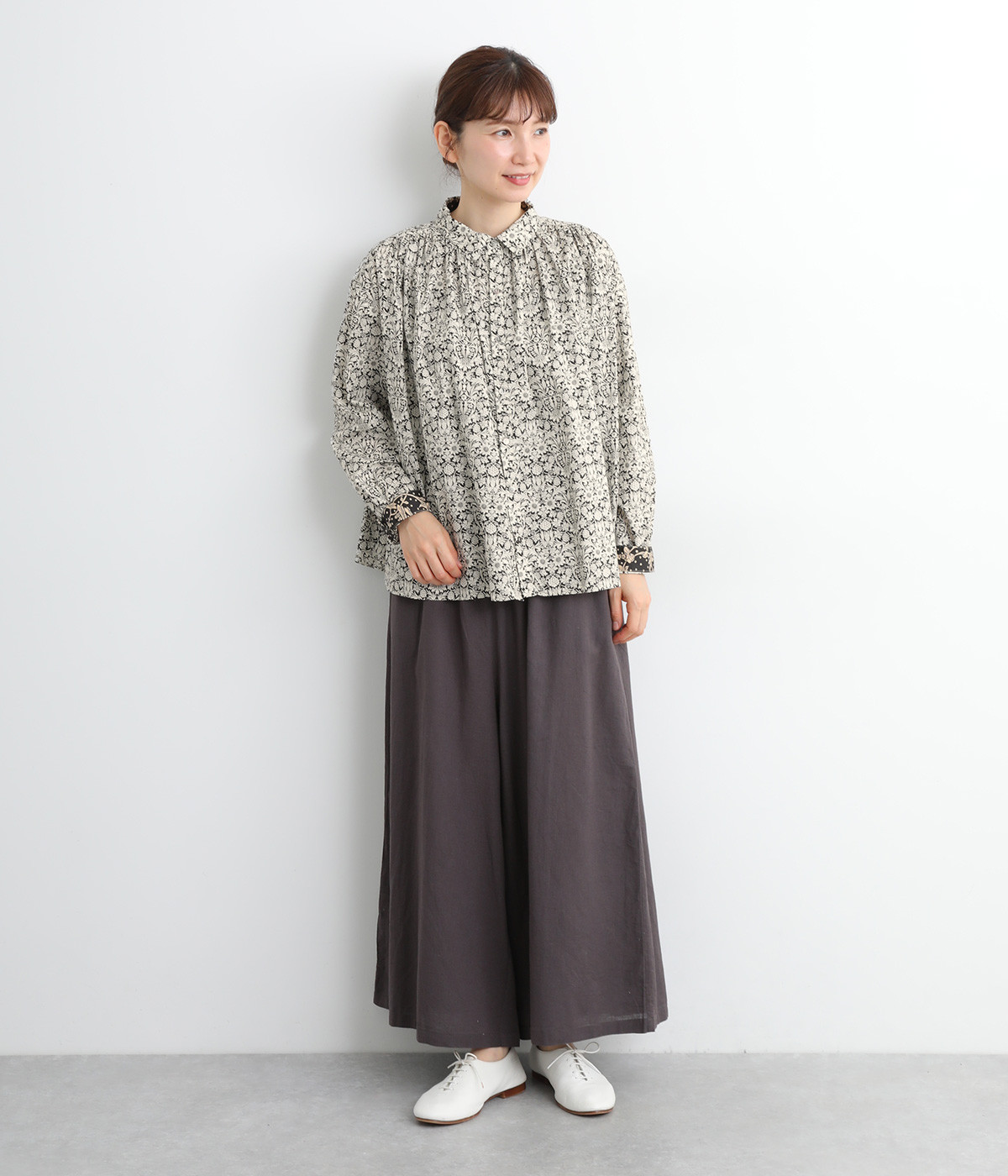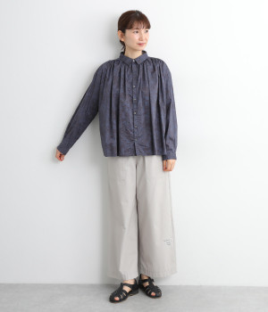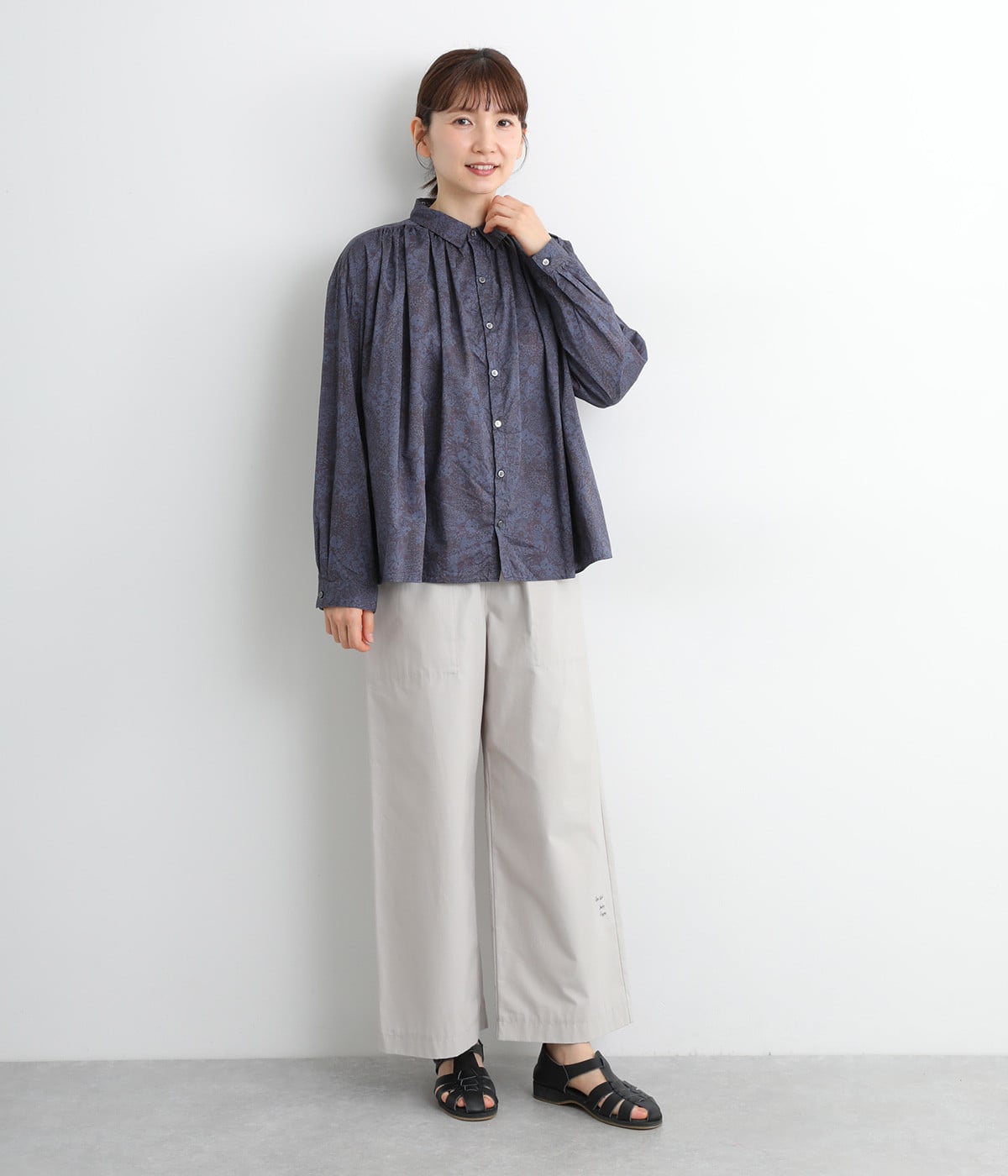 なめらかな肌触りにきれいな表面感が品のいいコットン生地に、華やかなリバティプリントをのせました。薄手で肌離れが良く季節をまたいで着まわせます。
