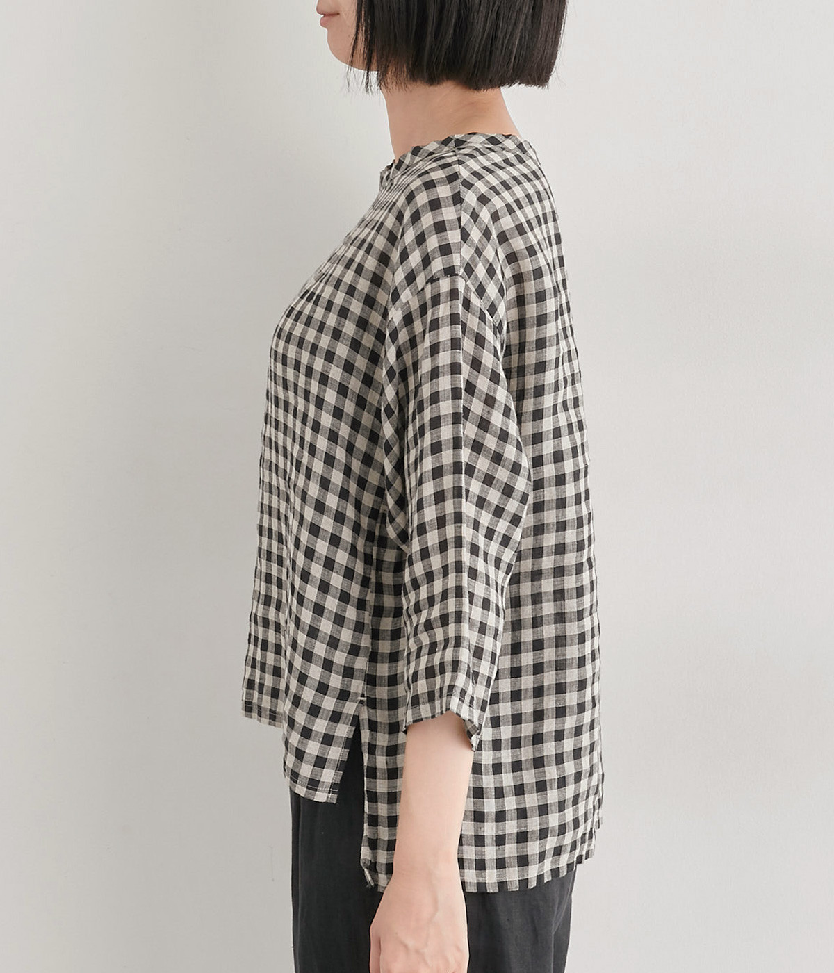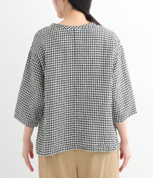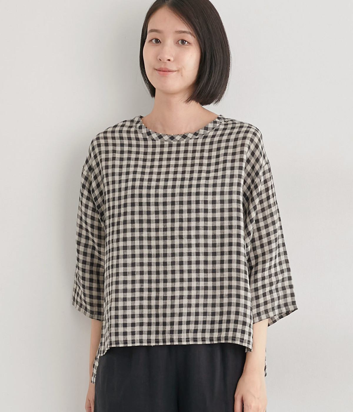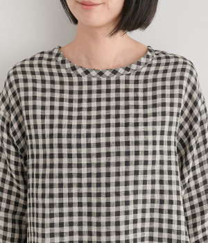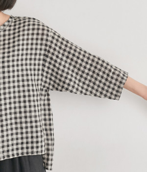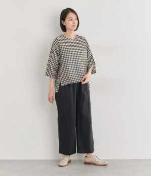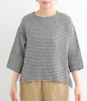 Tシャツ感覚で気軽に着られる、シンプルな仕立てのプルオーバー。リラクシーなワイドシルエットに、スリット入りの前後差ヘムで、さまざまなボトムと好バランス。かわいらしいギンガムチェックが、コーディネートにさりげないアクセントを添えます。