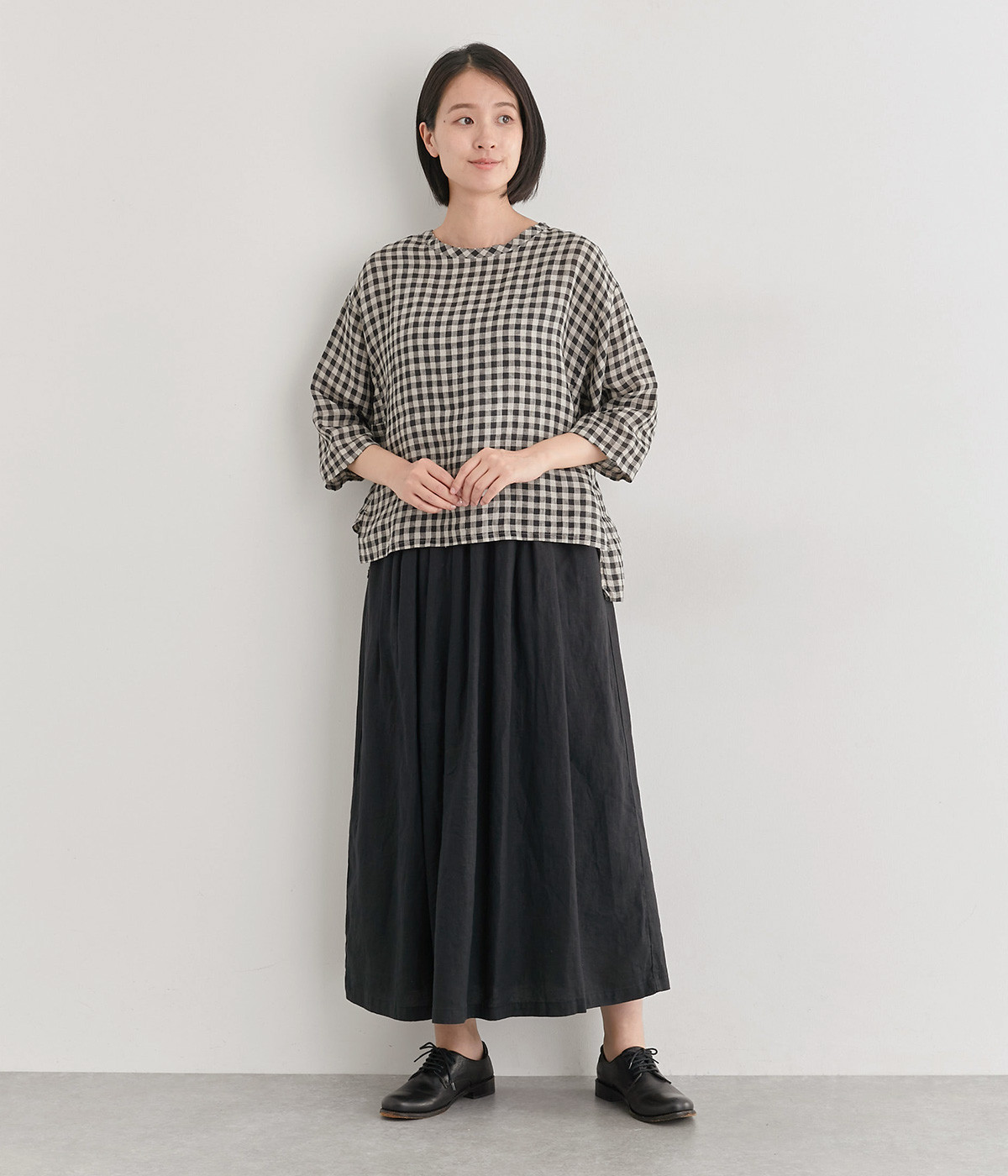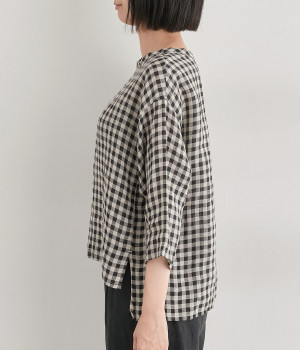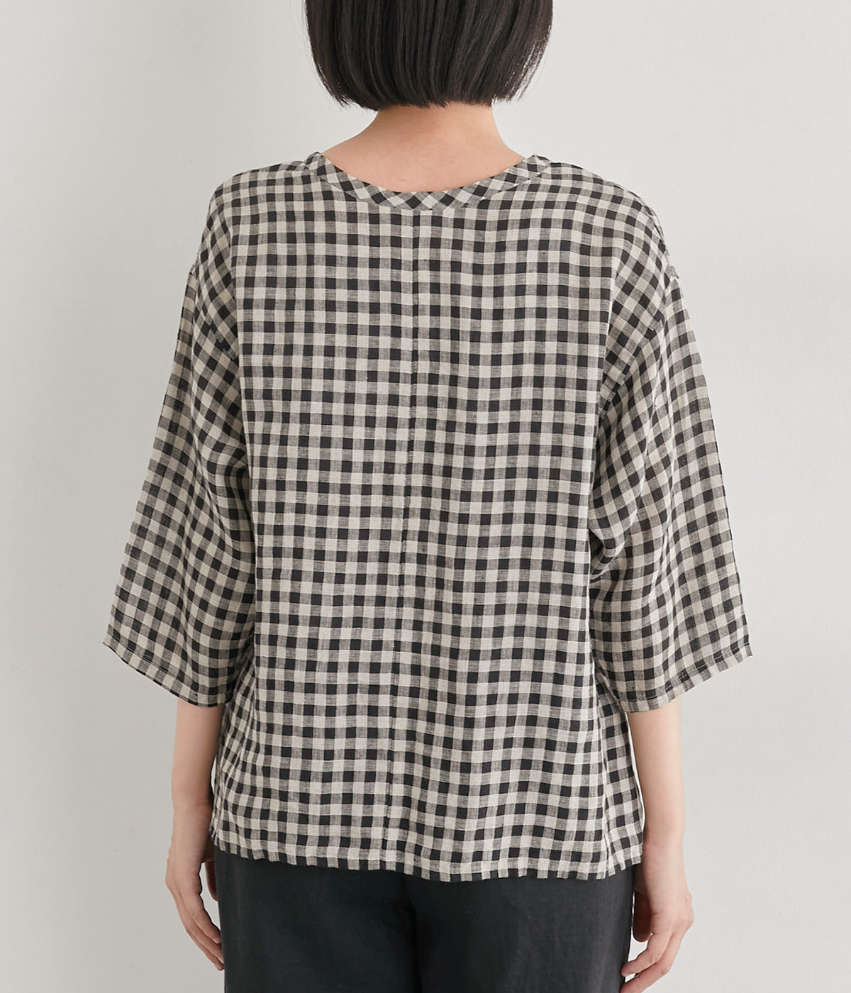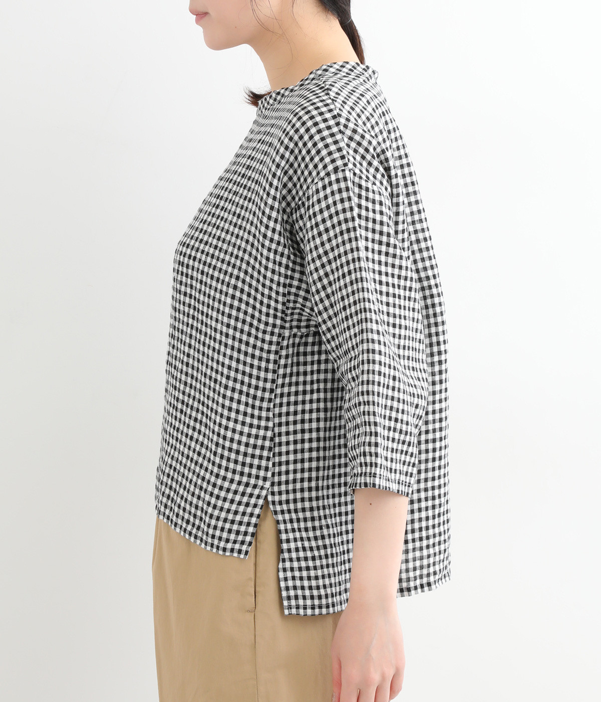 Tシャツ感覚で気軽に着られる、シンプルな仕立てのプルオーバー。リラクシーなワイドシルエットに、スリット入りの前後差ヘムで、さまざまなボトムと好バランス。かわいらしいギンガムチェックが、コーディネートにさりげないアクセントを添えます。