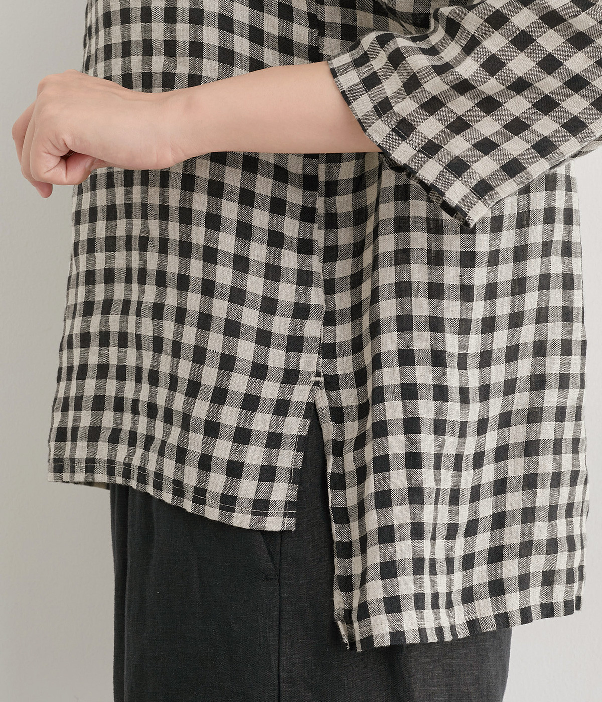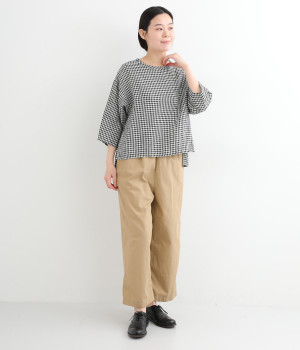 甘く織り上げた薄手素材で、独特のハリ感を持つリネン生地を使用しました。通気性が高く、暑い季節も爽やかな着心地を叶えます。