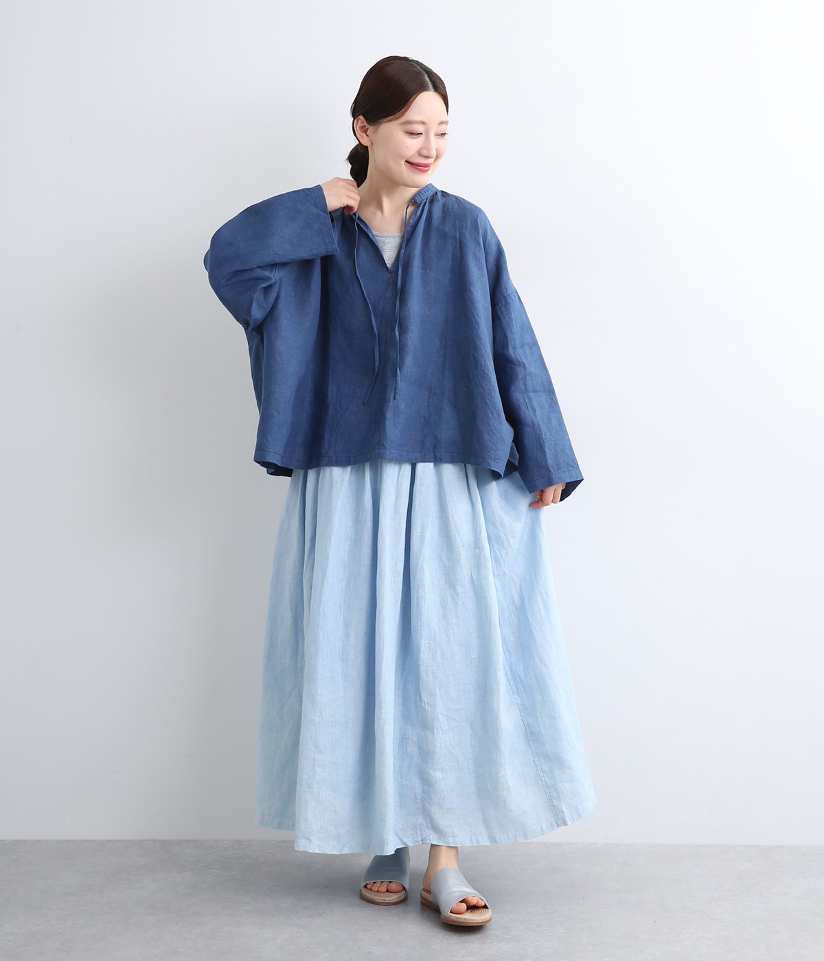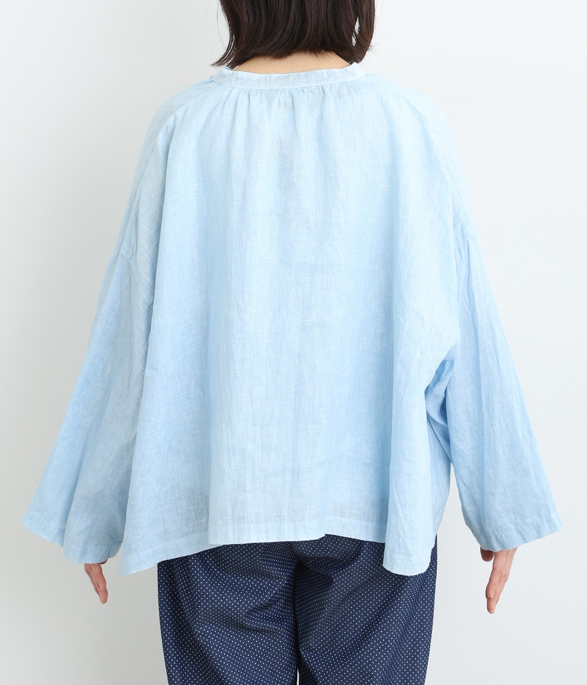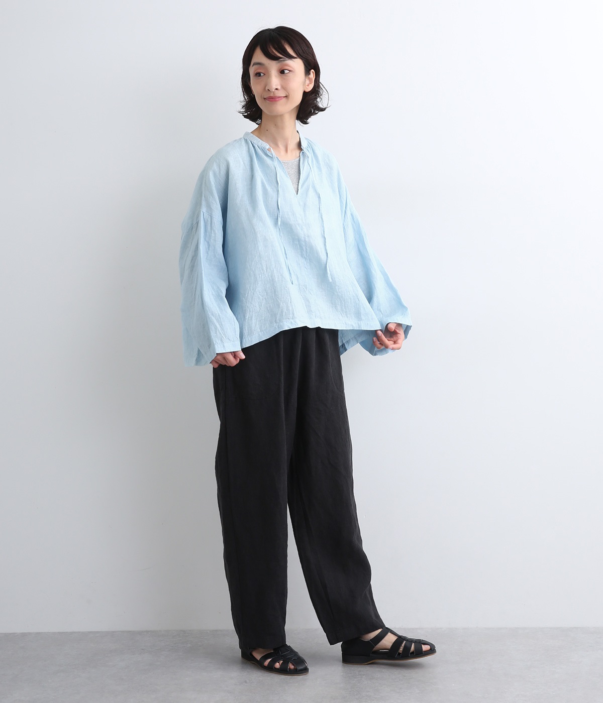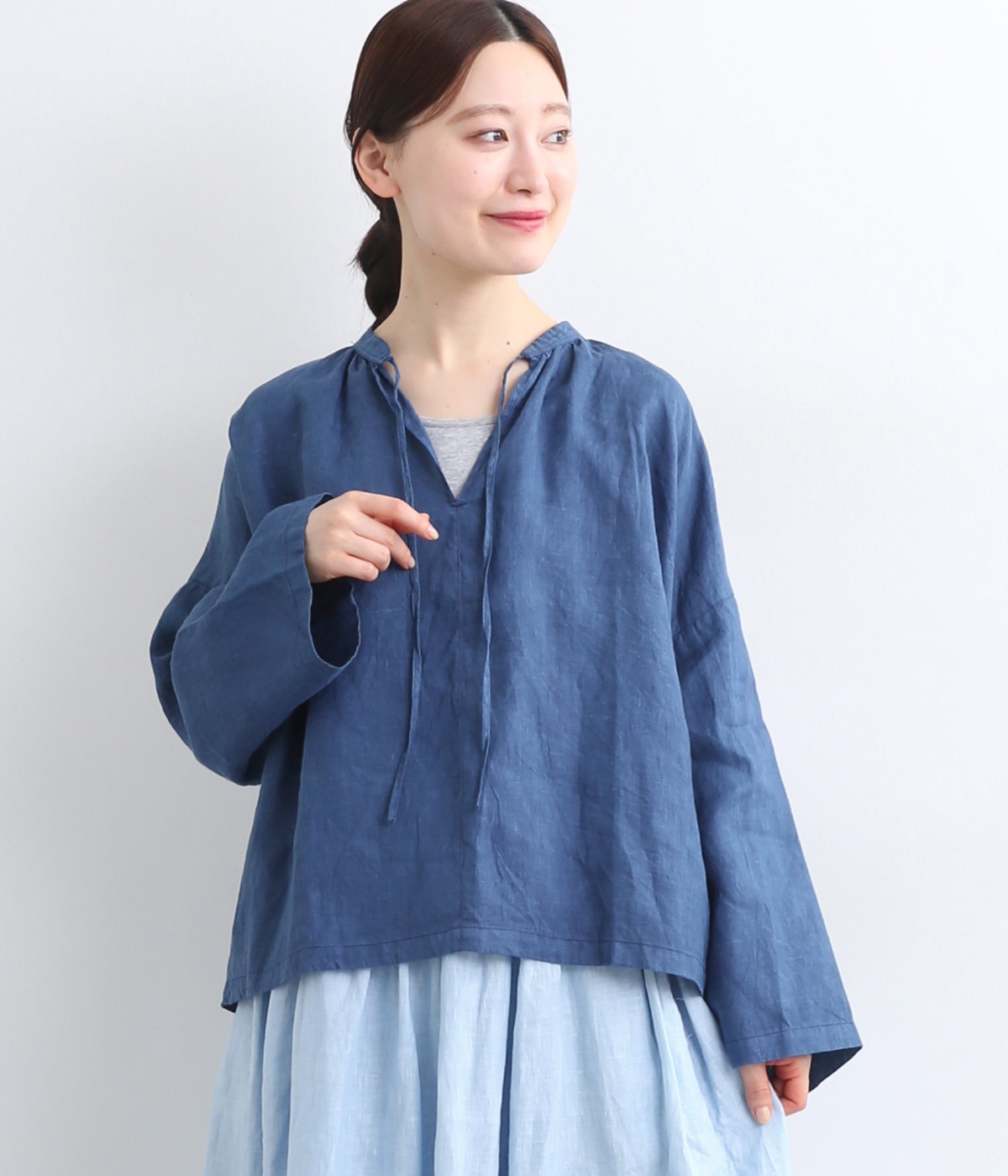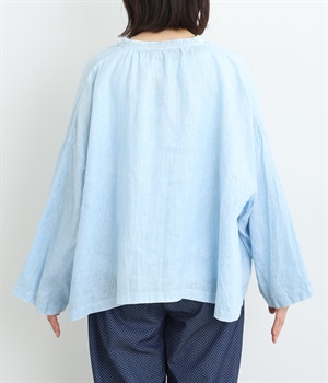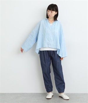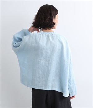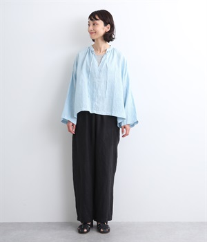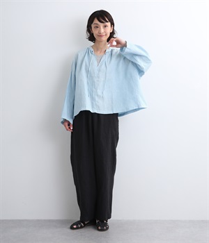身幅をたっぷりと取ったオーバーシルエットのプルオーバーブラウスです。首元のスキッパーネックはほどよい抜け感を出し、顔まわりをすっきりと見せます。袖を軽くまくってラフに着用するのも◎。
