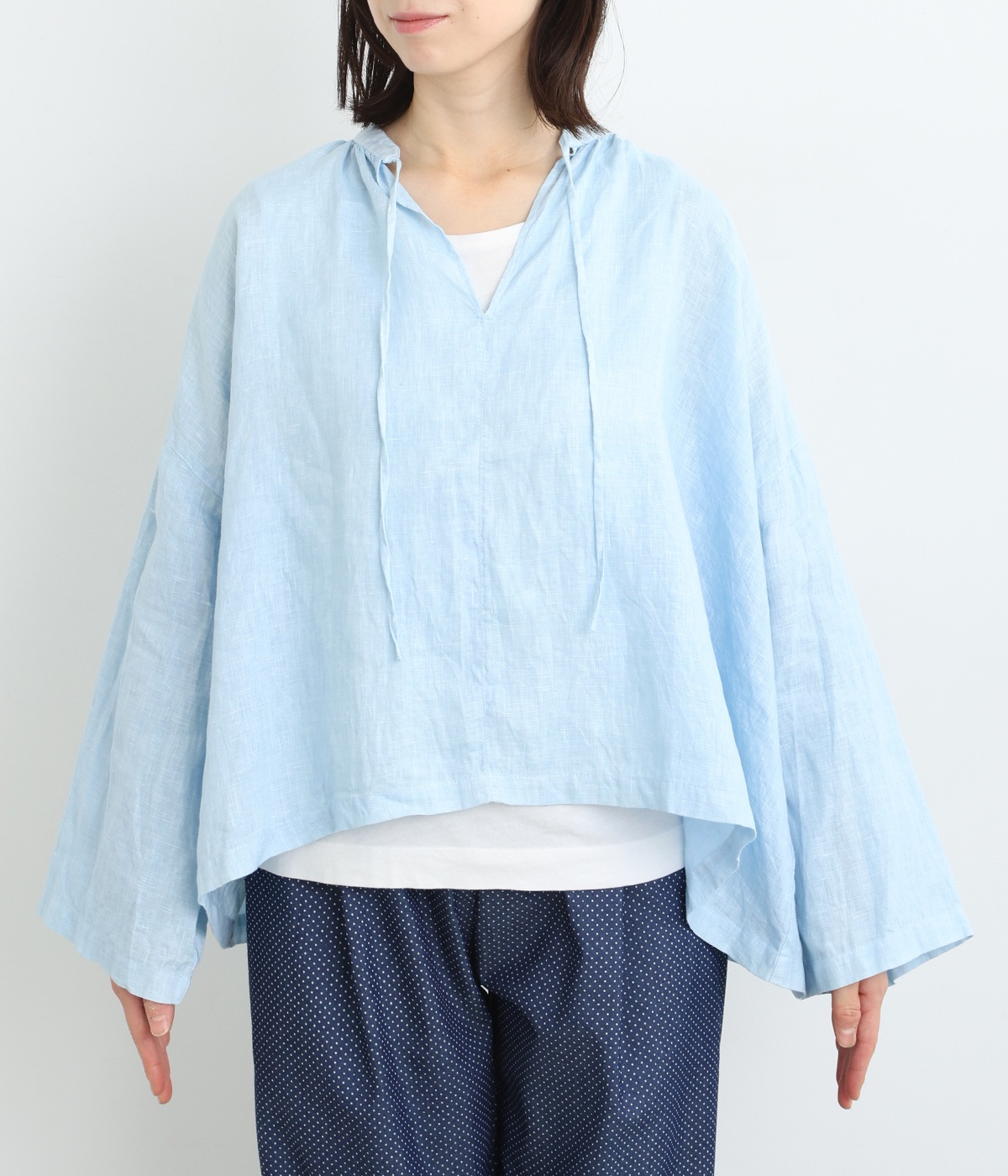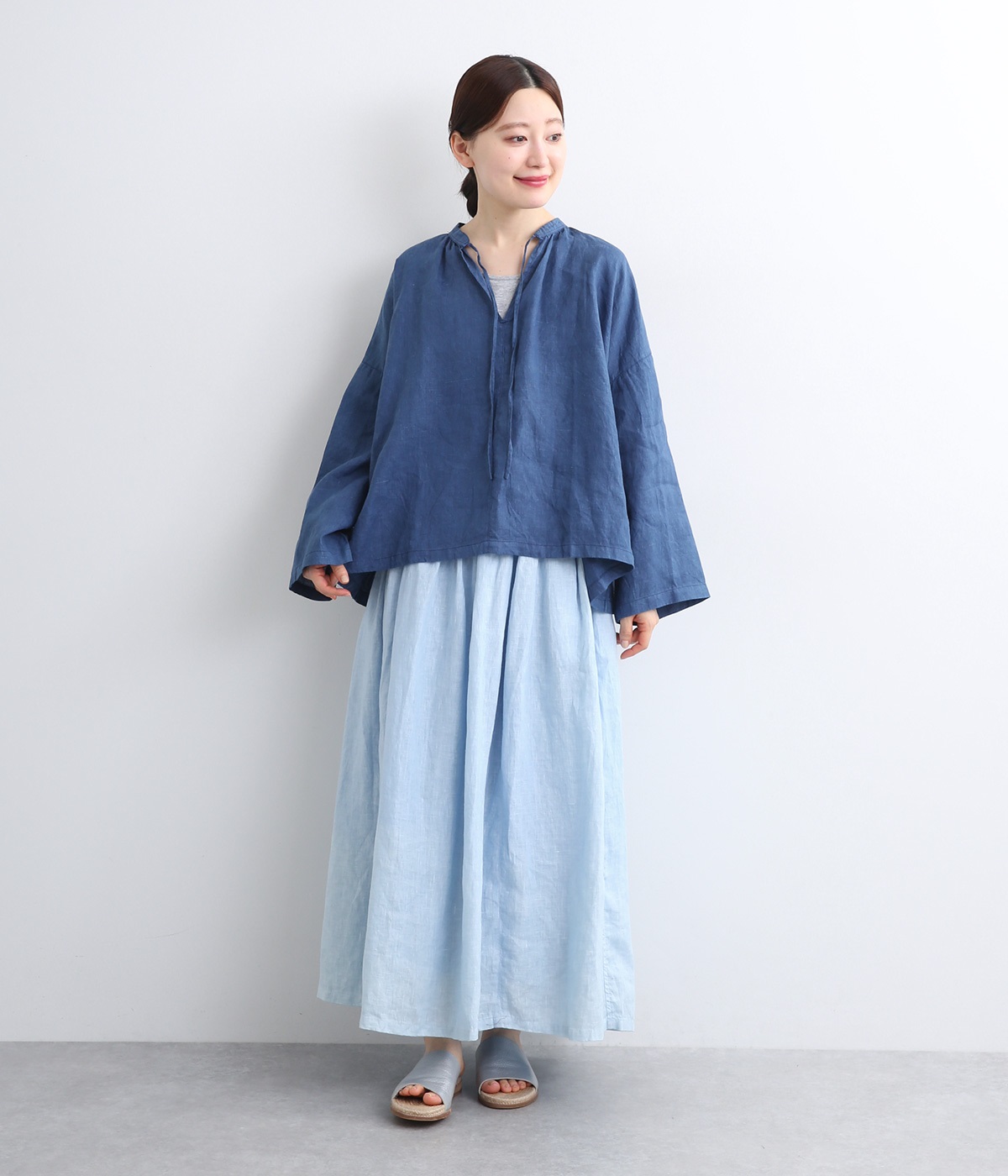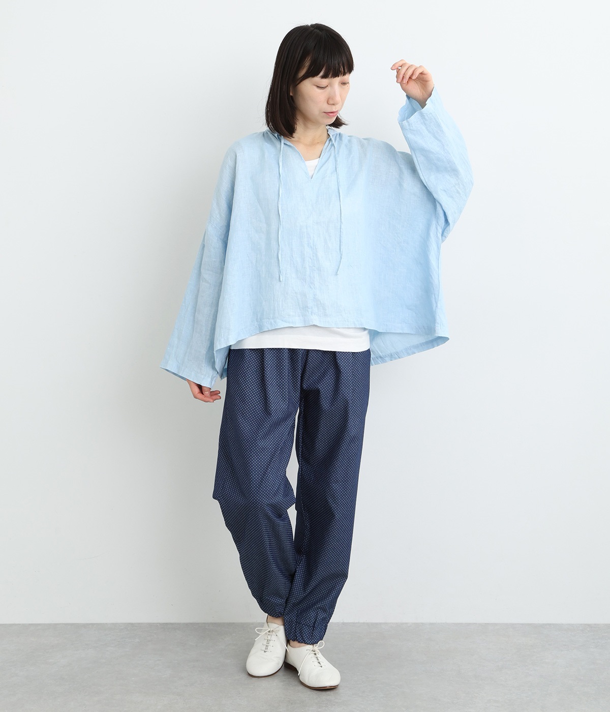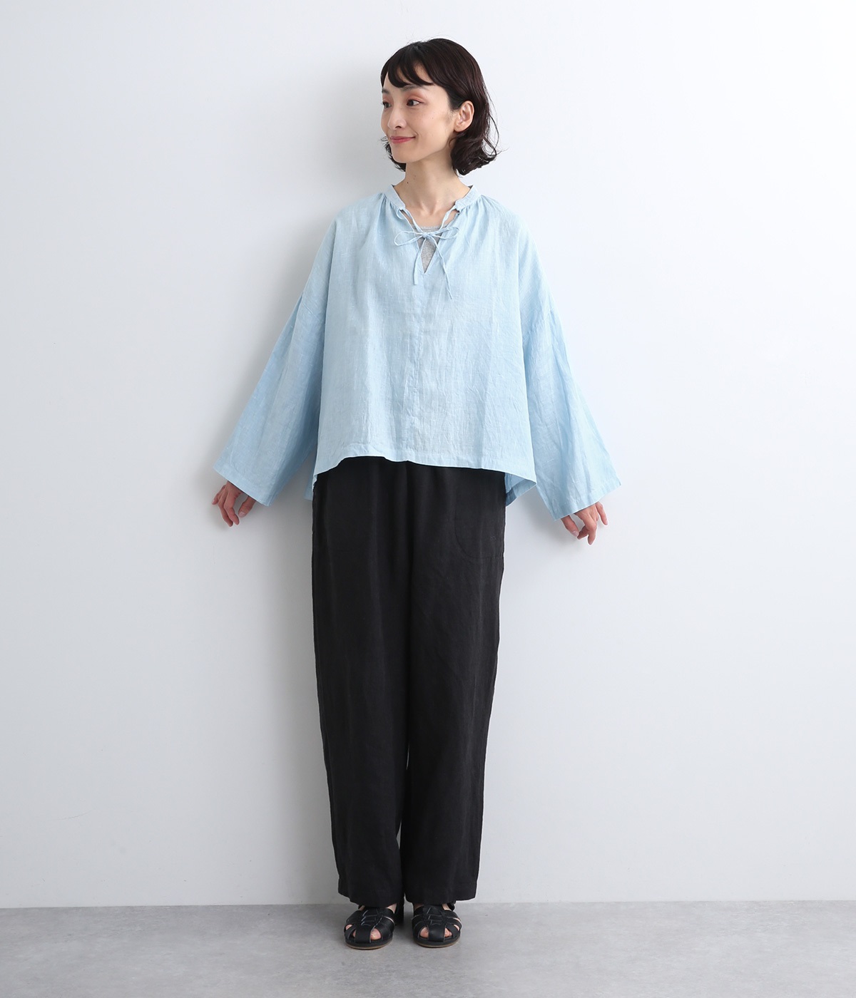 身幅をたっぷりと取ったオーバーシルエットのプルオーバーブラウスです。首元のスキッパーネックはほどよい抜け感を出し、顔まわりをすっきりと見せます。袖を軽くまくってラフに着用するのも◎。