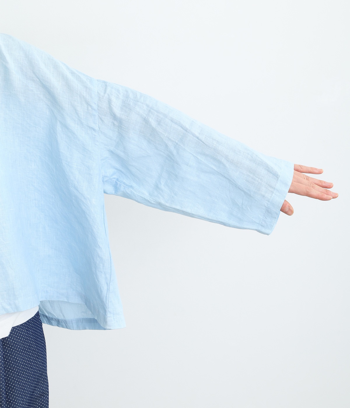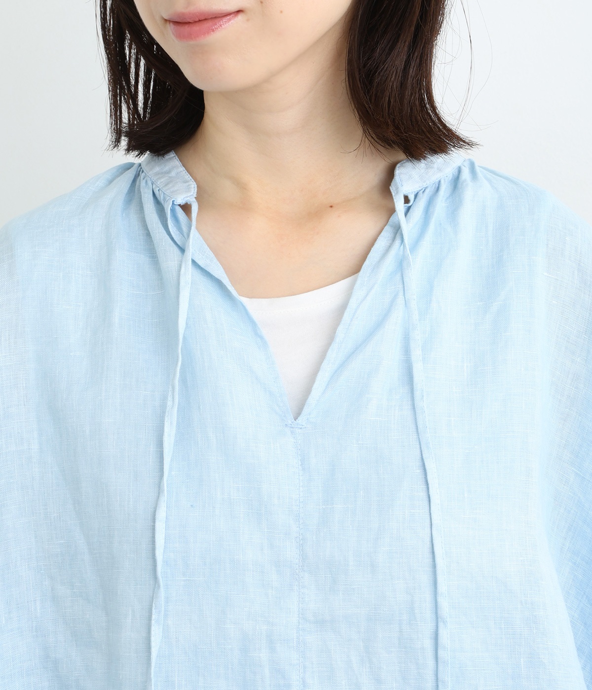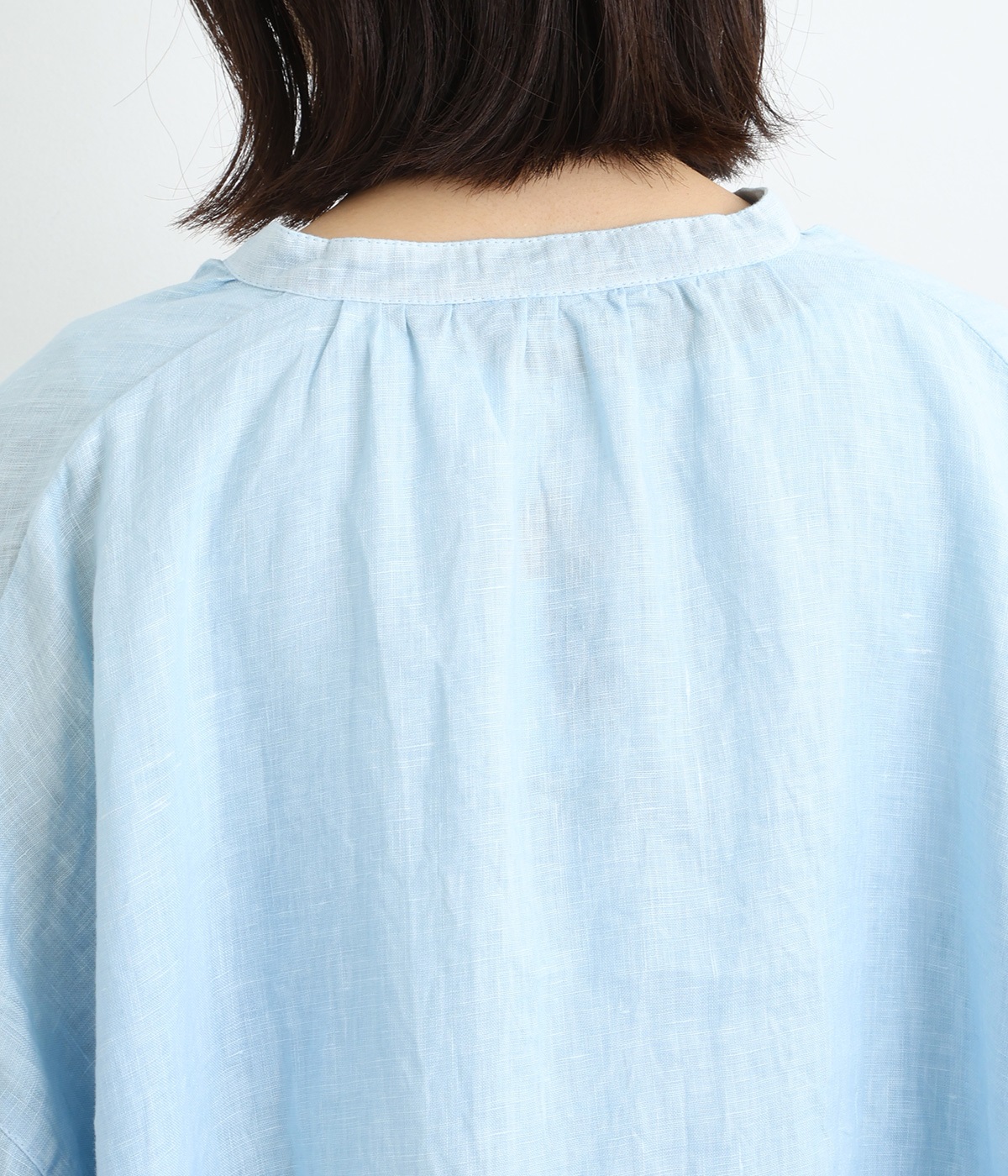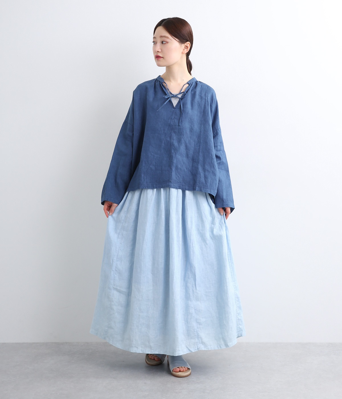 身幅をたっぷりと取ったオーバーシルエットのプルオーバーブラウスです。首元のスキッパーネックはほどよい抜け感を出し、顔まわりをすっきりと見せます。袖を軽くまくってラフに着用するのも◎。