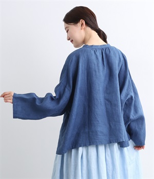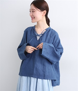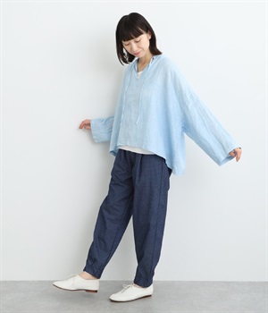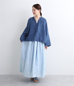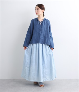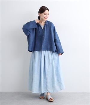 シャリ感のあるさらっとしたリネン素材をインディゴで染め上げました。年月とともに変化していく風合いや色合いも魅力の一つです。