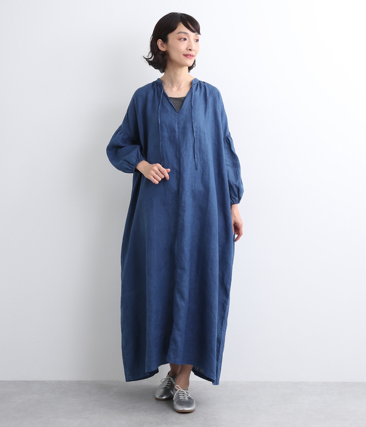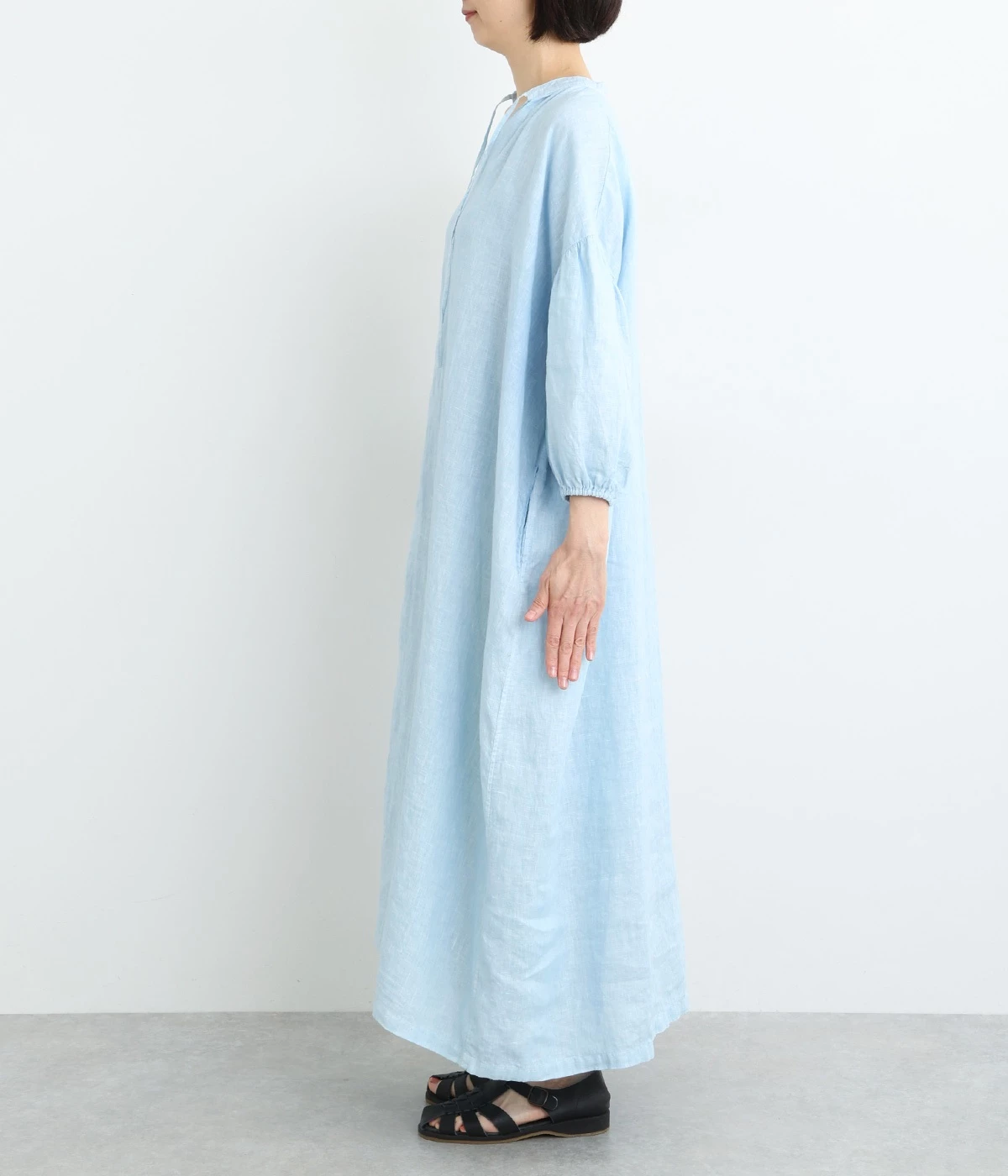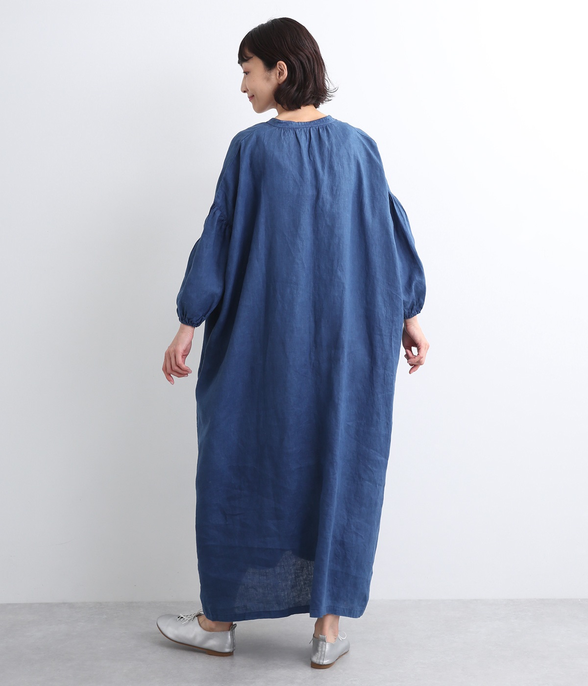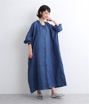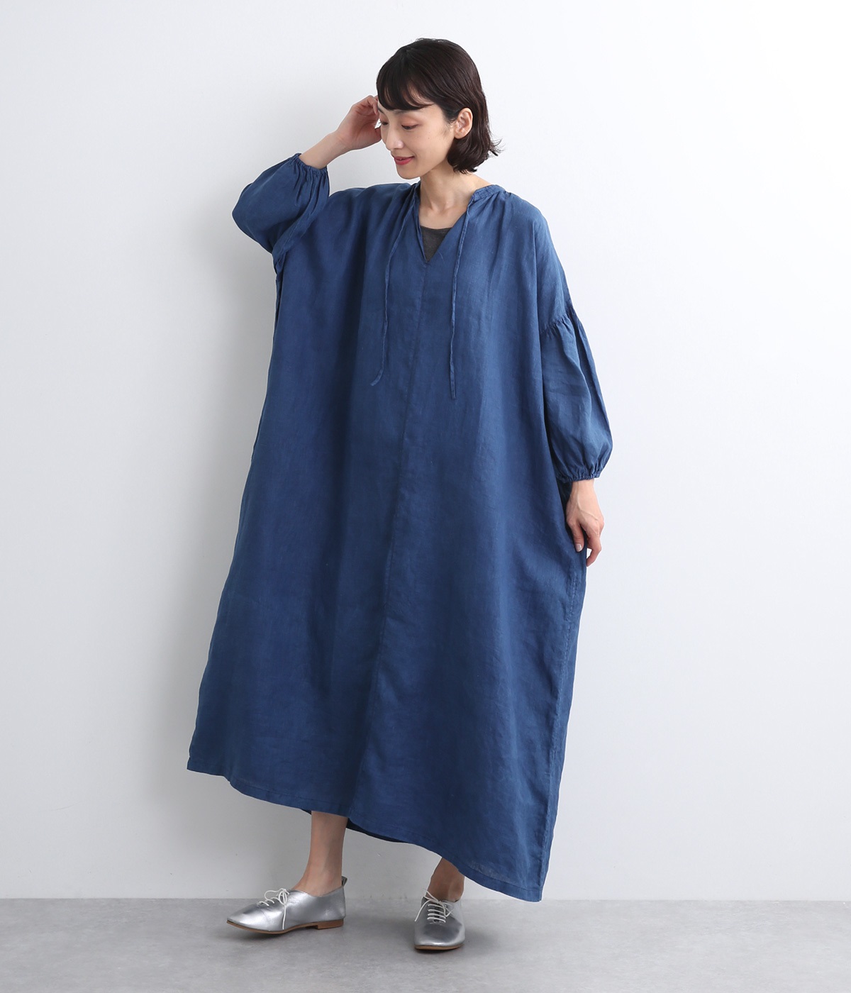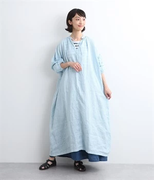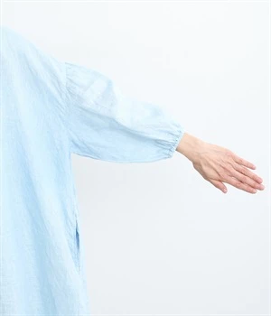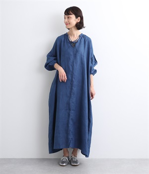 体からほどよく離れたシルエットと、すっきりとした胸元のデザインが特徴的なマキシ丈ワンピースです。袖口はゴム仕様になっているので、伸ばしたまま着たり少したくし上げてきたりとお好みの袖丈で着用できます。