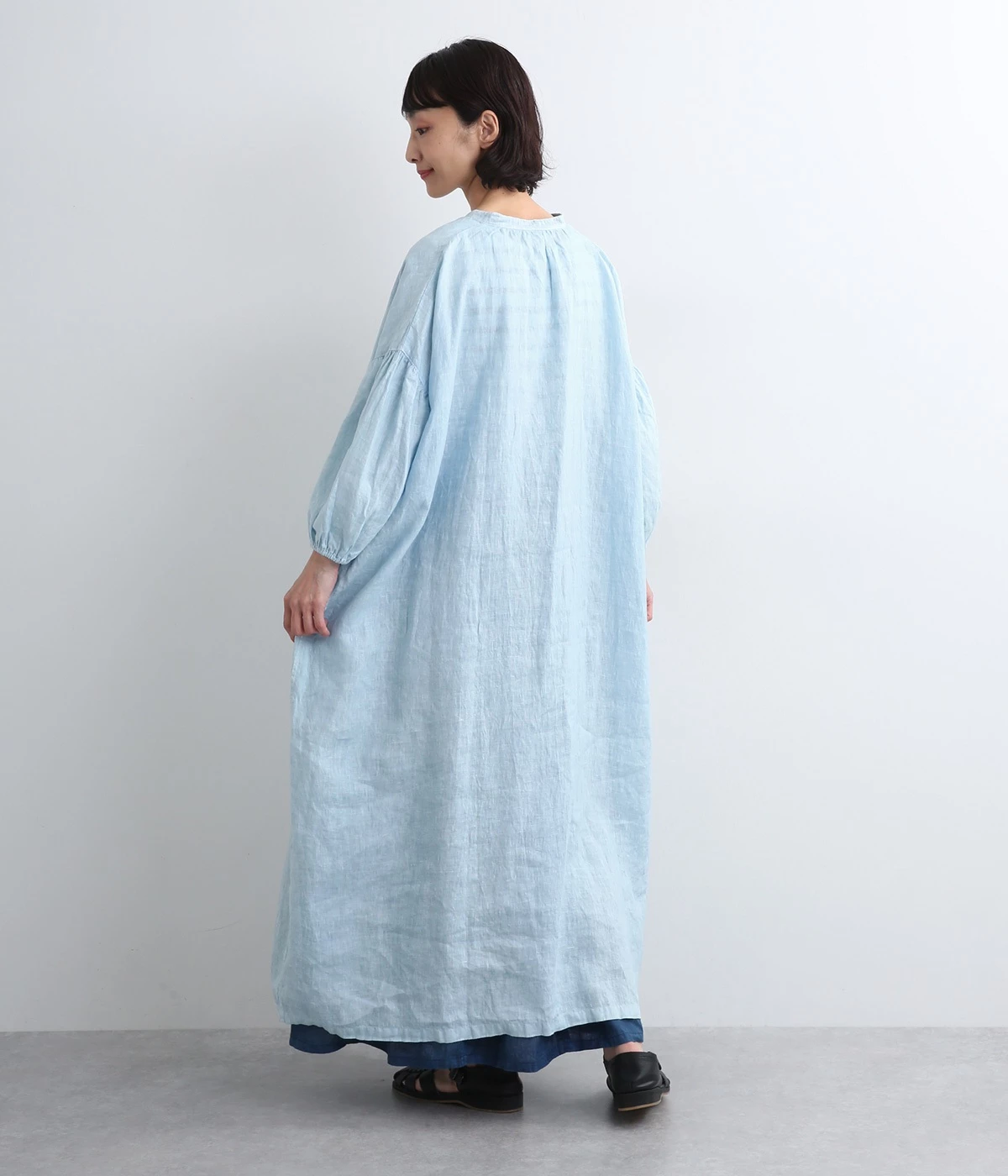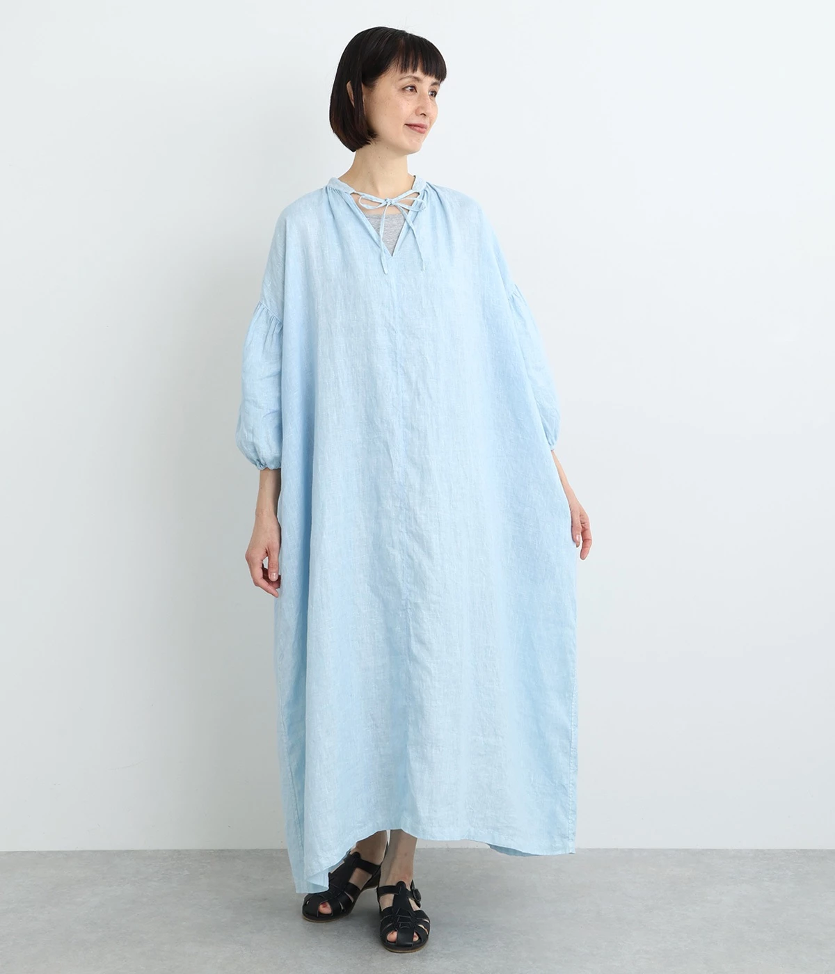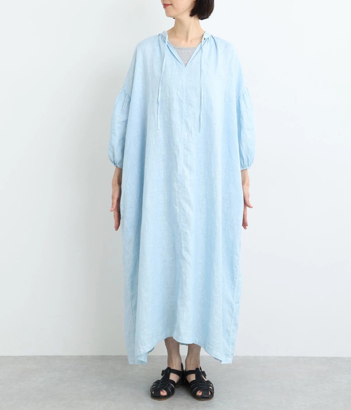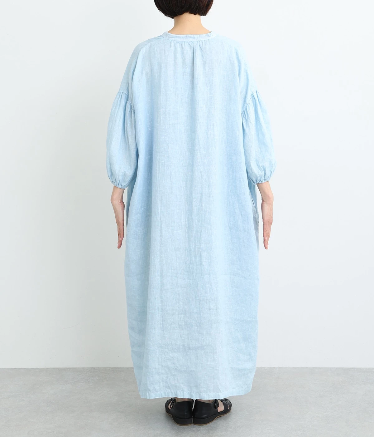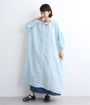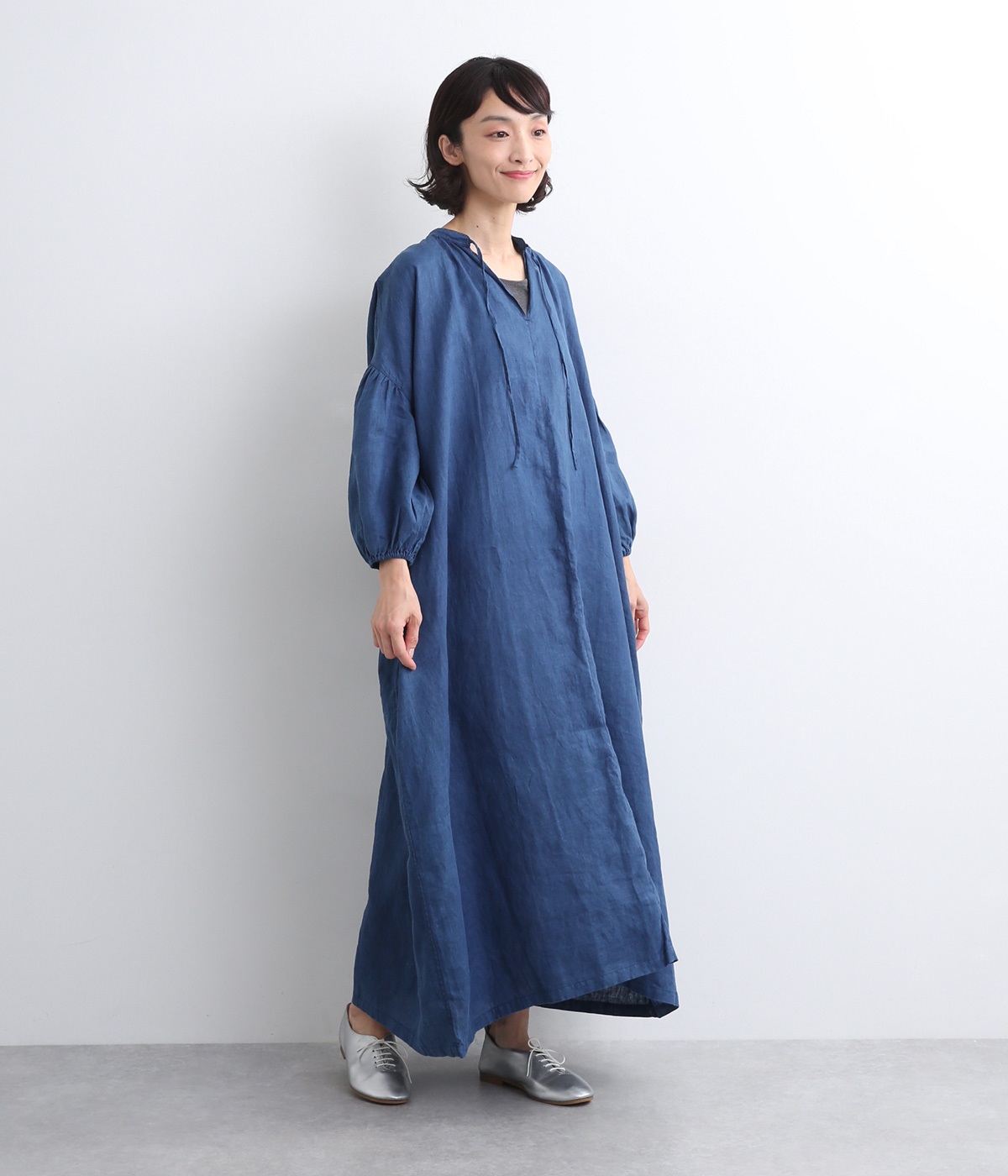 体からほどよく離れたシルエットと、すっきりとした胸元のデザインが特徴的なマキシ丈ワンピースです。袖口はゴム仕様になっているので、伸ばしたまま着たり少したくし上げてきたりとお好みの袖丈で着用できます。