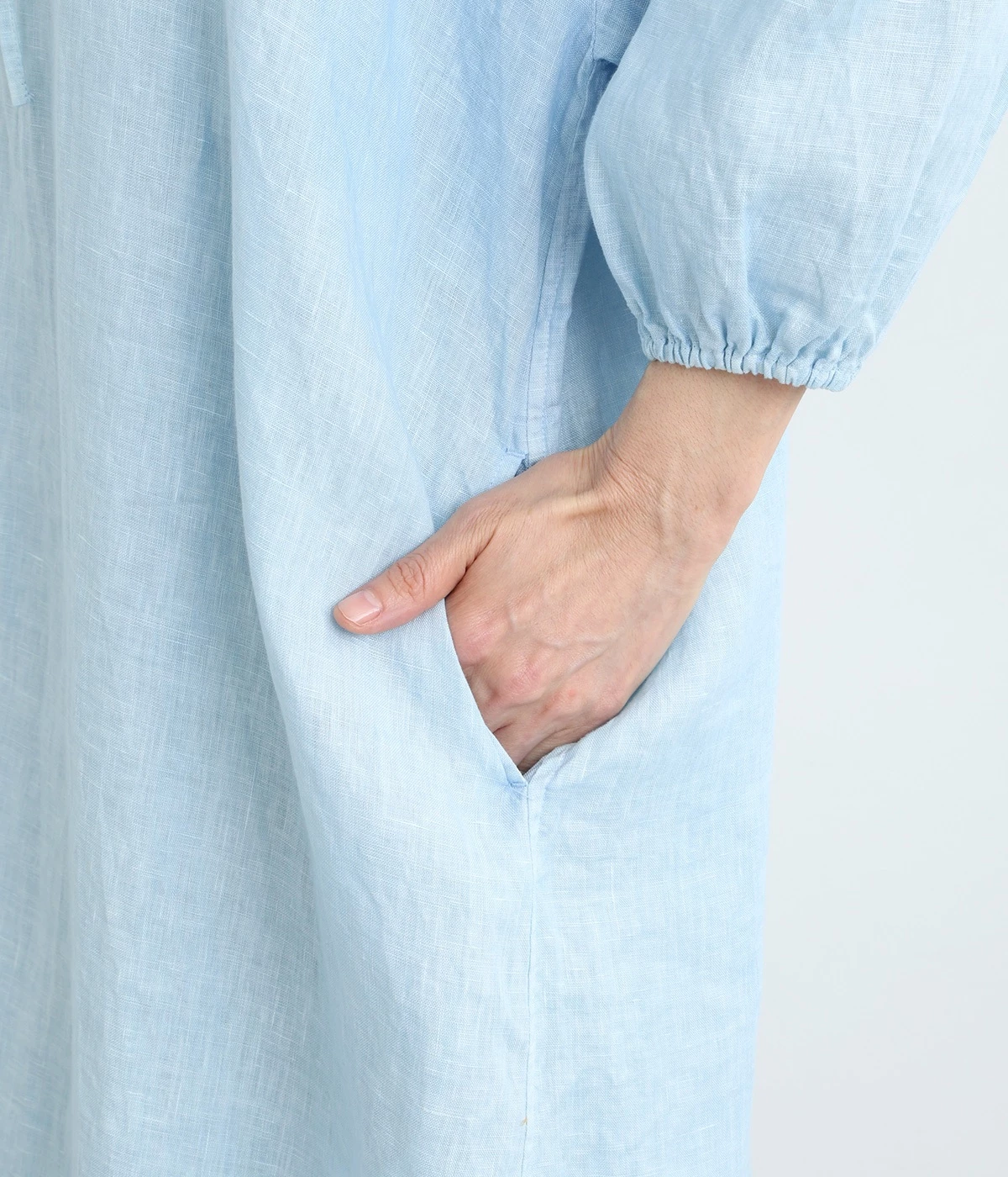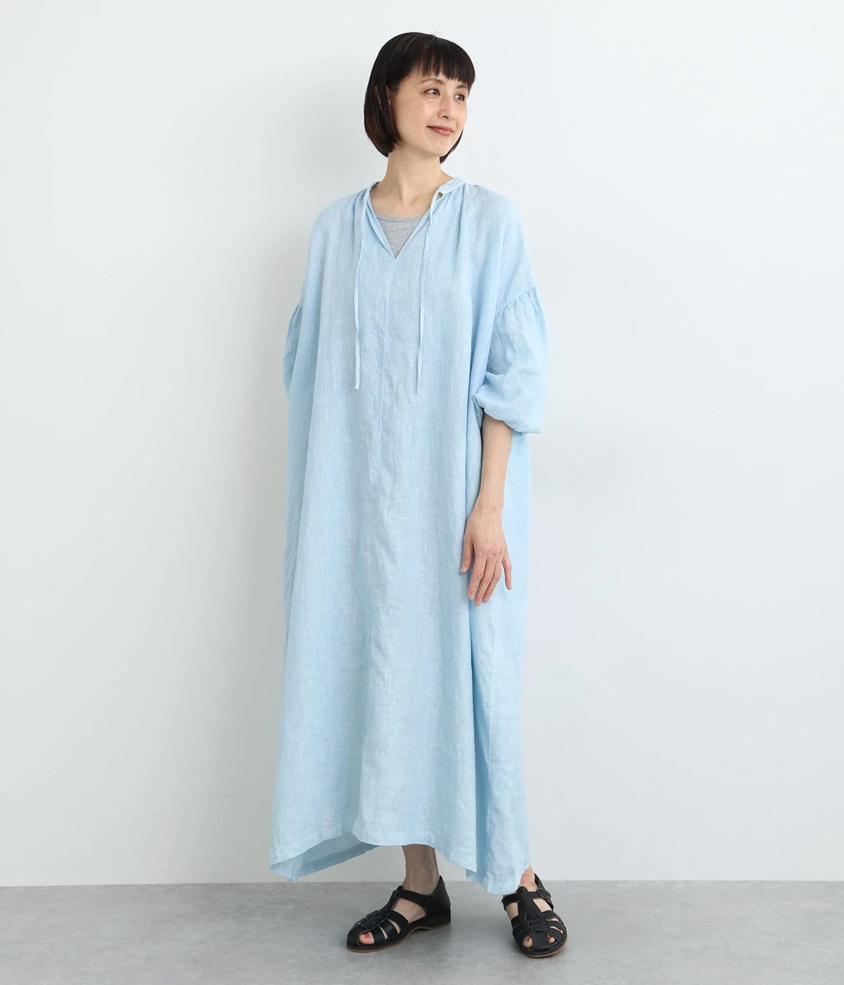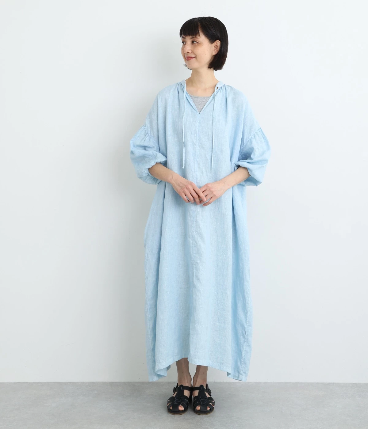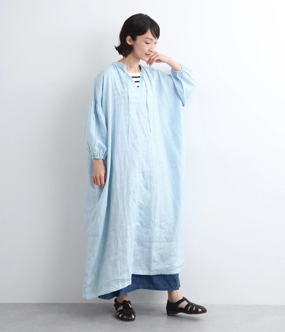 体からほどよく離れたシルエットと、すっきりとした胸元のデザインが特徴的なマキシ丈ワンピースです。袖口はゴム仕様になっているので、伸ばしたまま着たり少したくし上げてきたりとお好みの袖丈で着用できます。