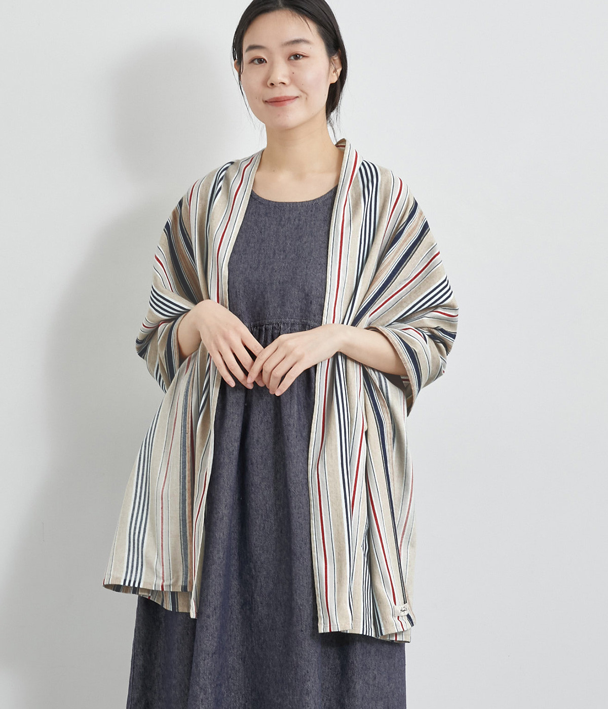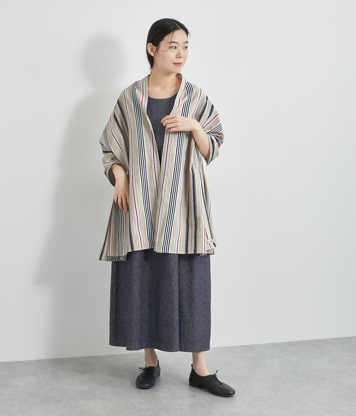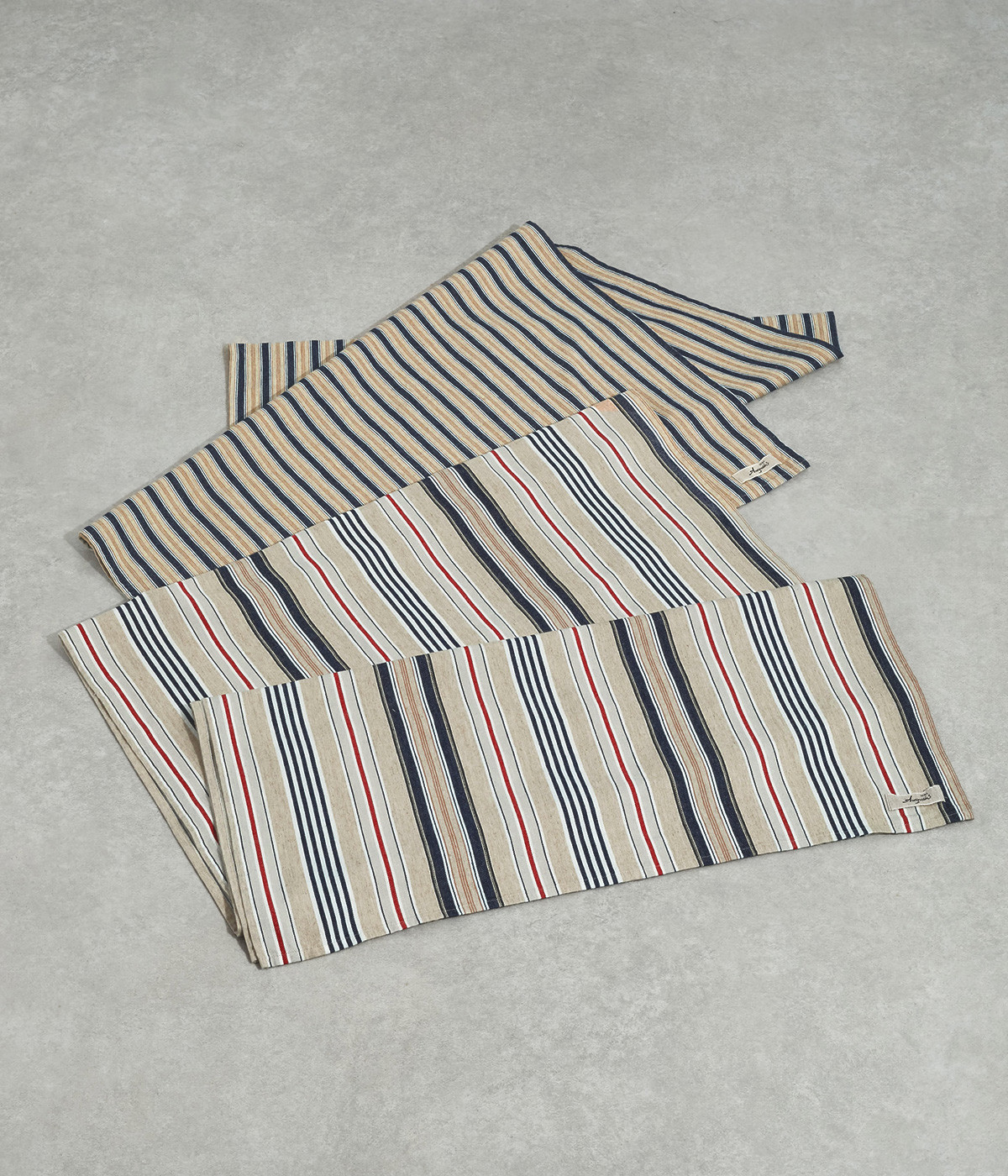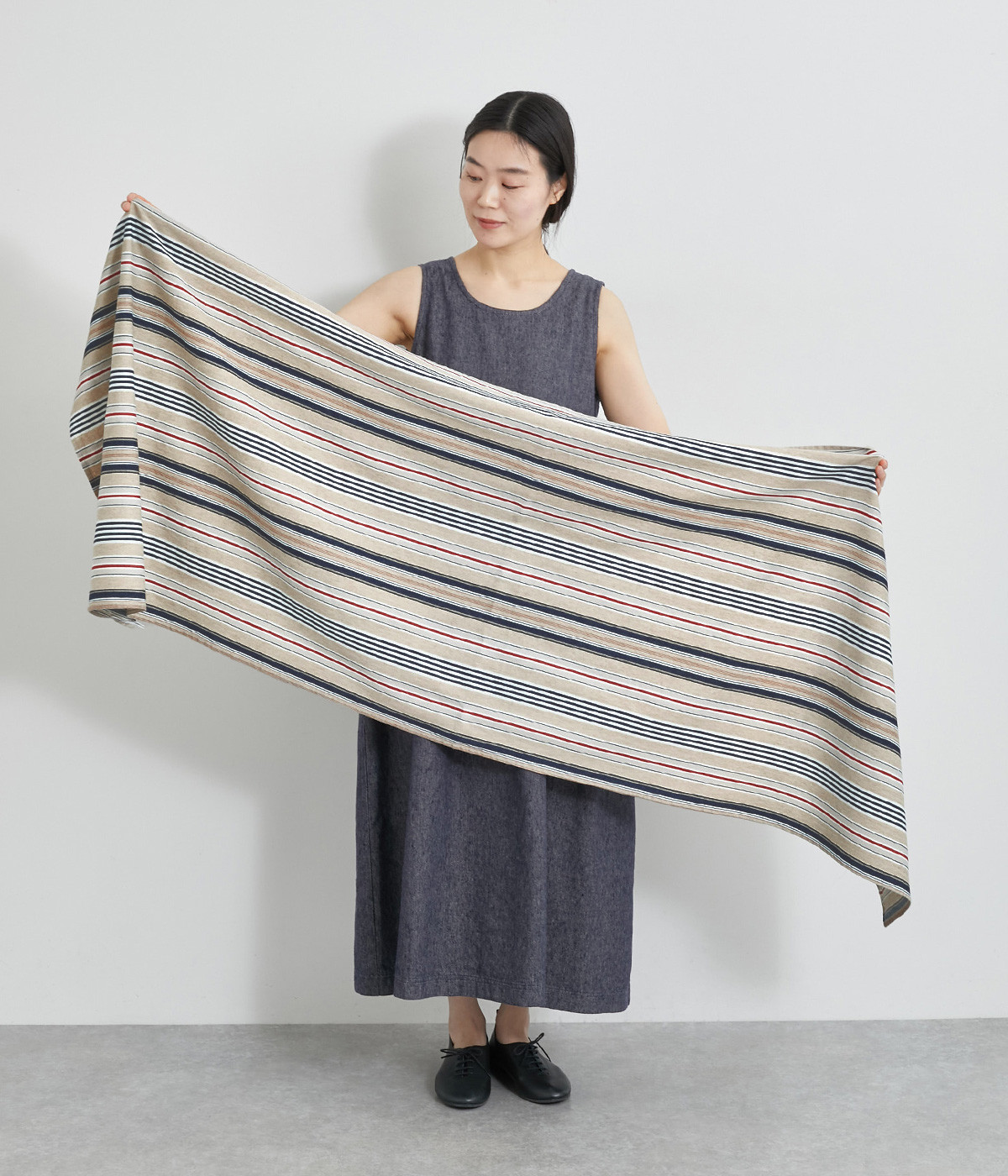 コットンとリネンをブレンドしたナチュラルな風合いが際立つストール。デニムの耳を彷彿とさせるようなインディゴストライプが存在感を発揮します。