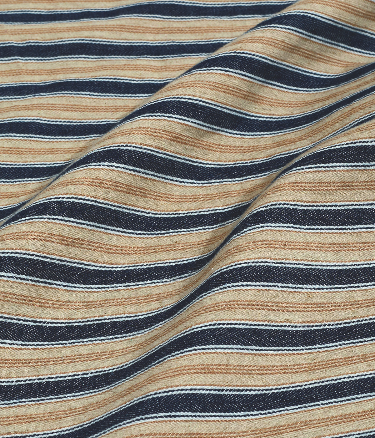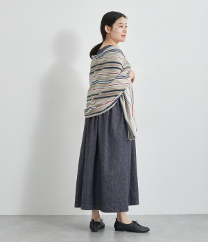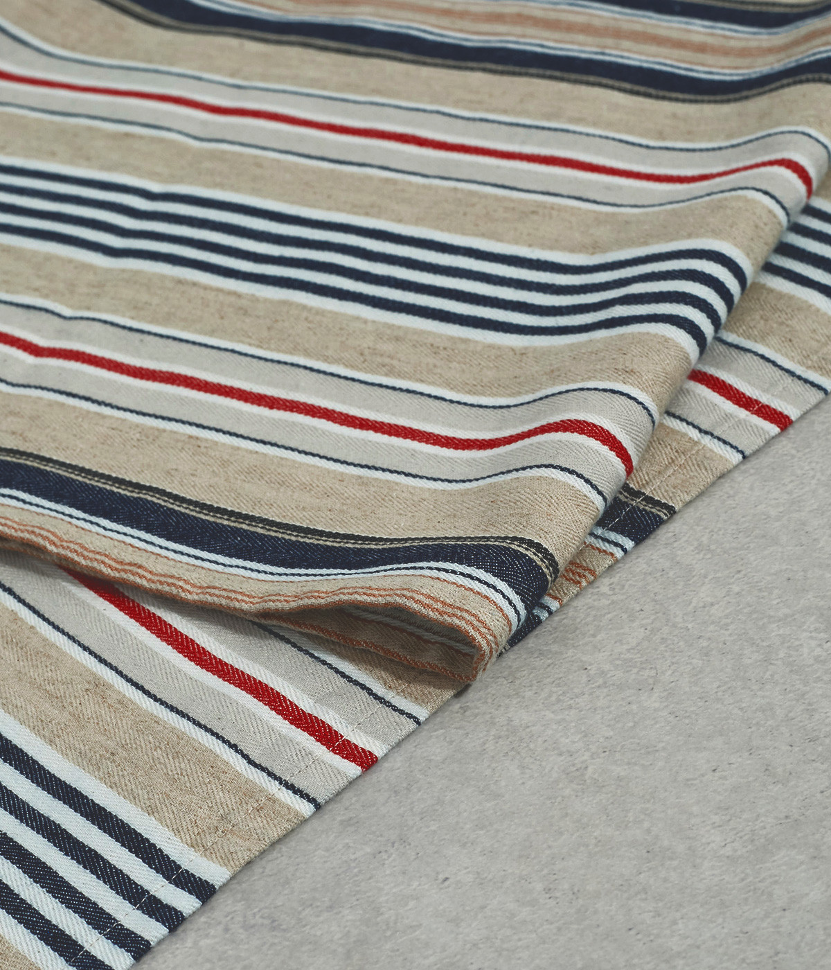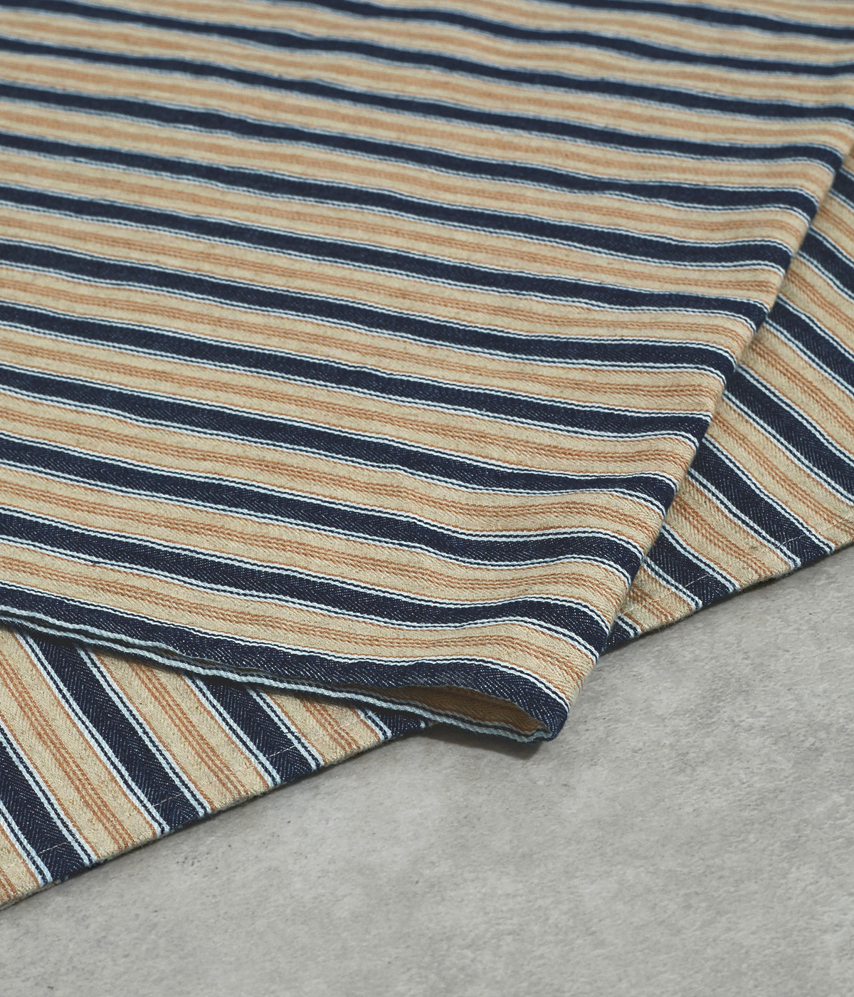 コットンとリネンをブレンドしたナチュラルな風合いが際立つストール。デニムの耳を彷彿とさせるようなインディゴストライプが存在感を発揮します。