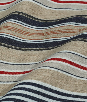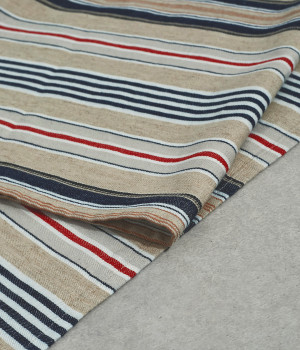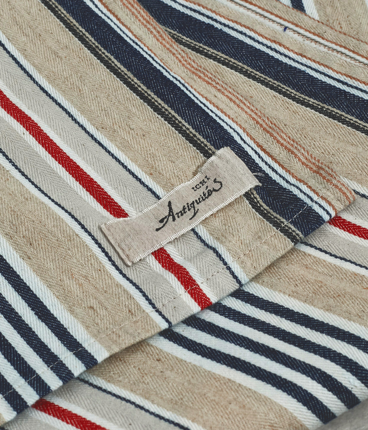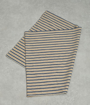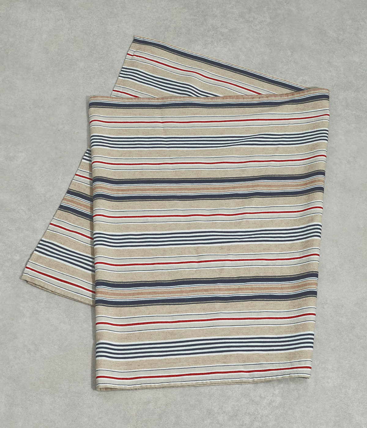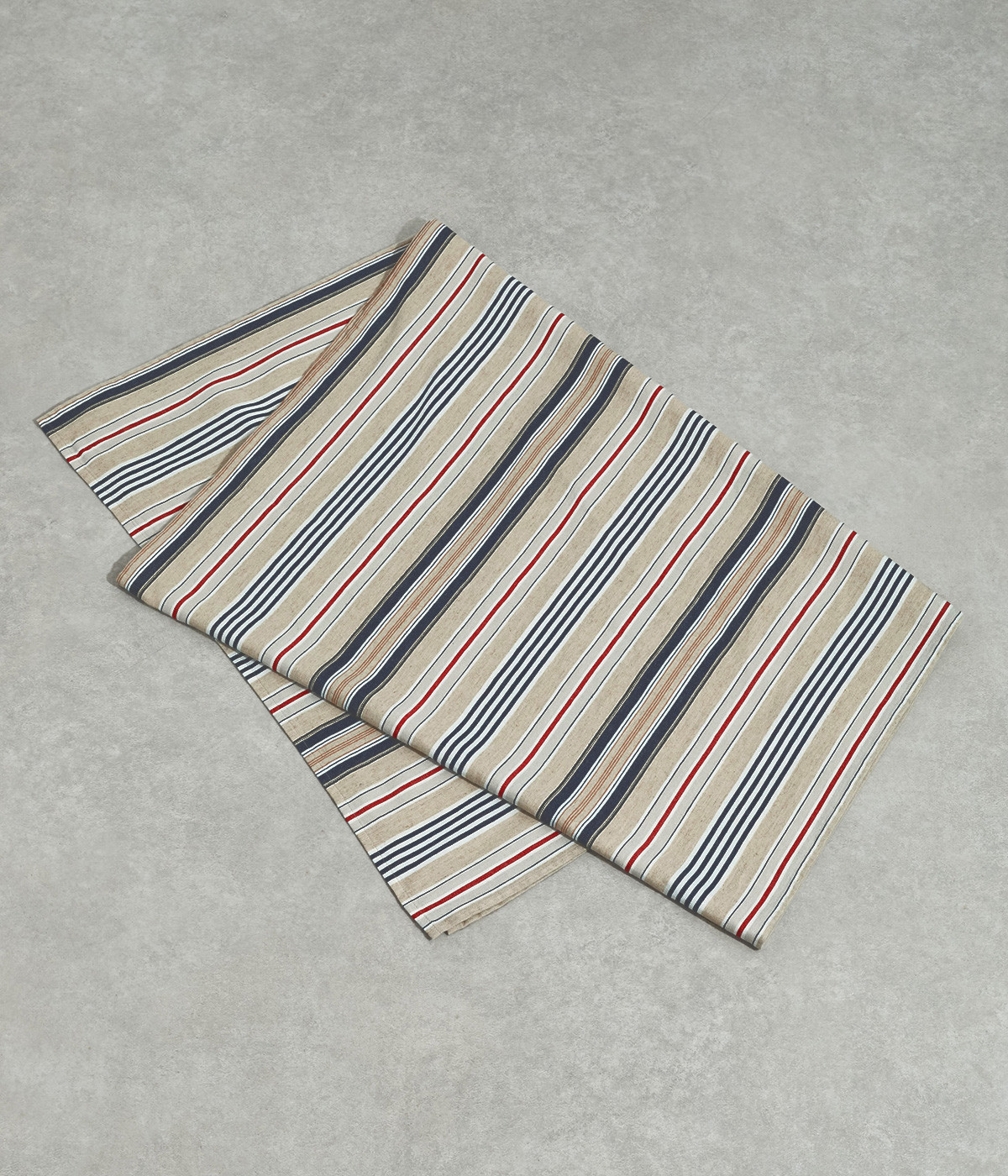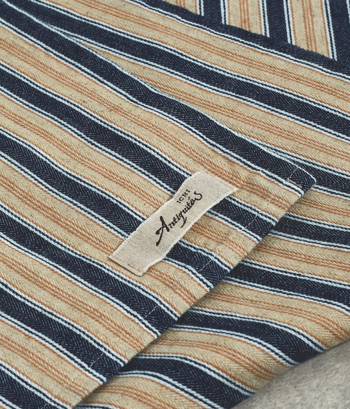 コットンとリネンをブレンドしたナチュラルな風合いが際立つストール。デニムの耳を彷彿とさせるようなインディゴストライプが存在感を発揮します。