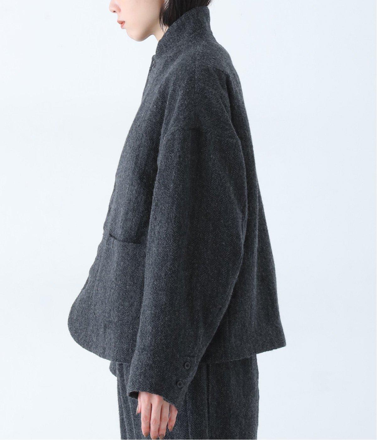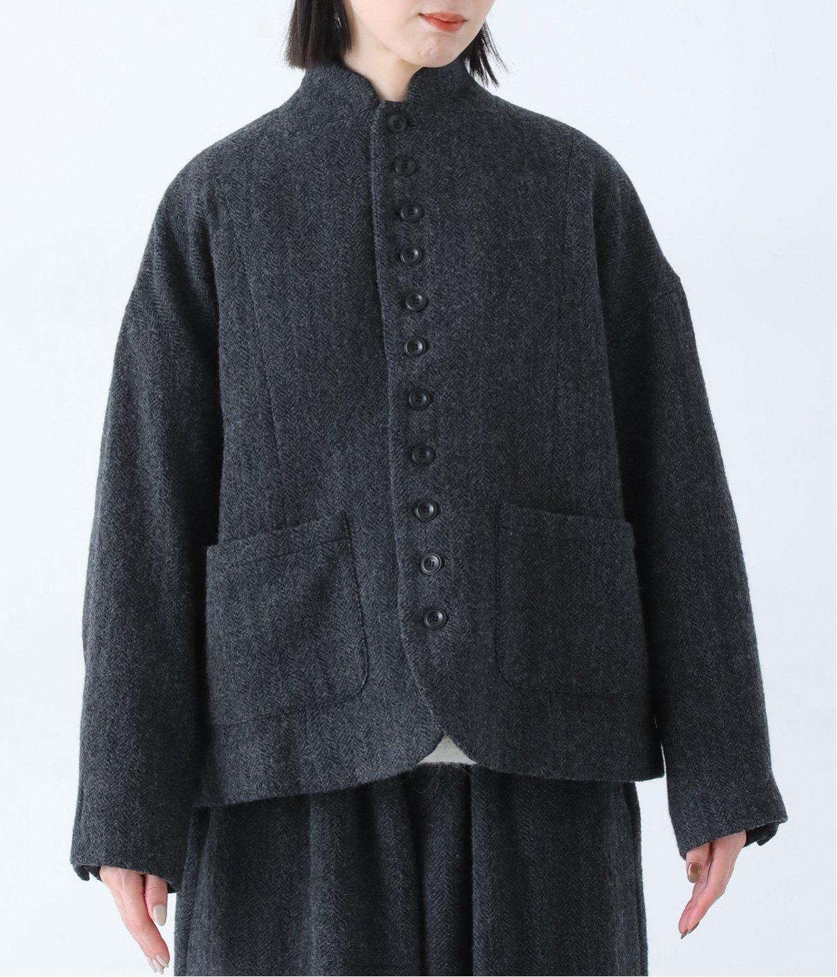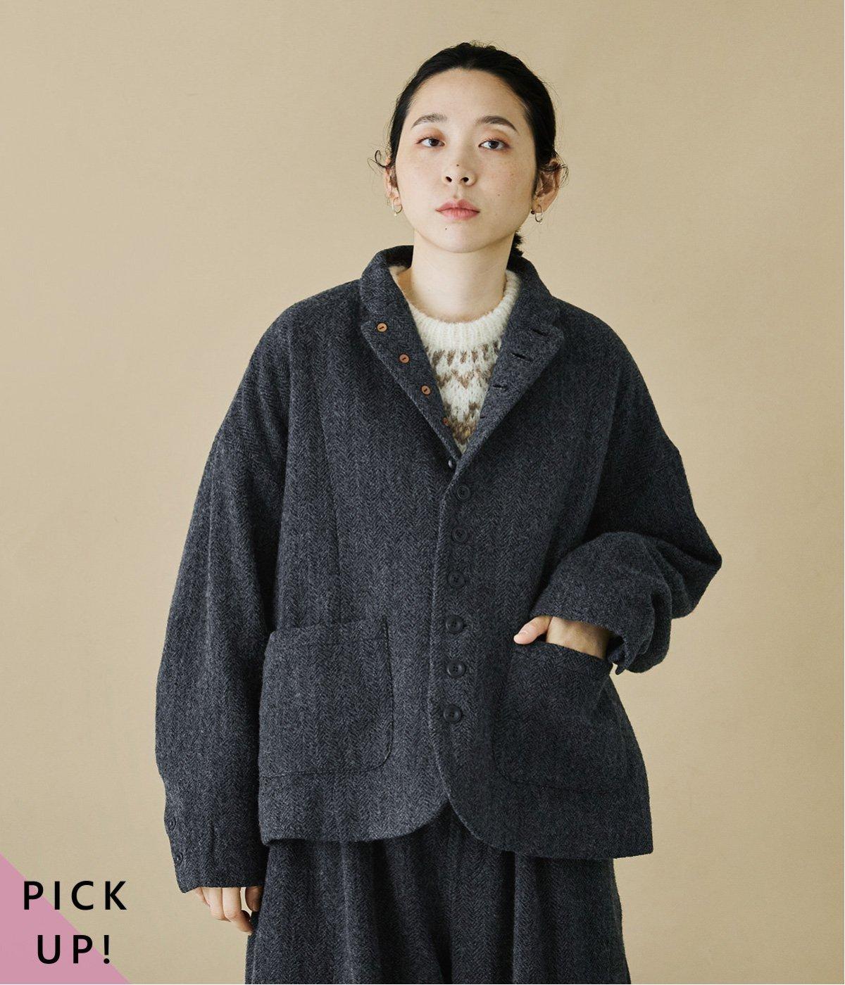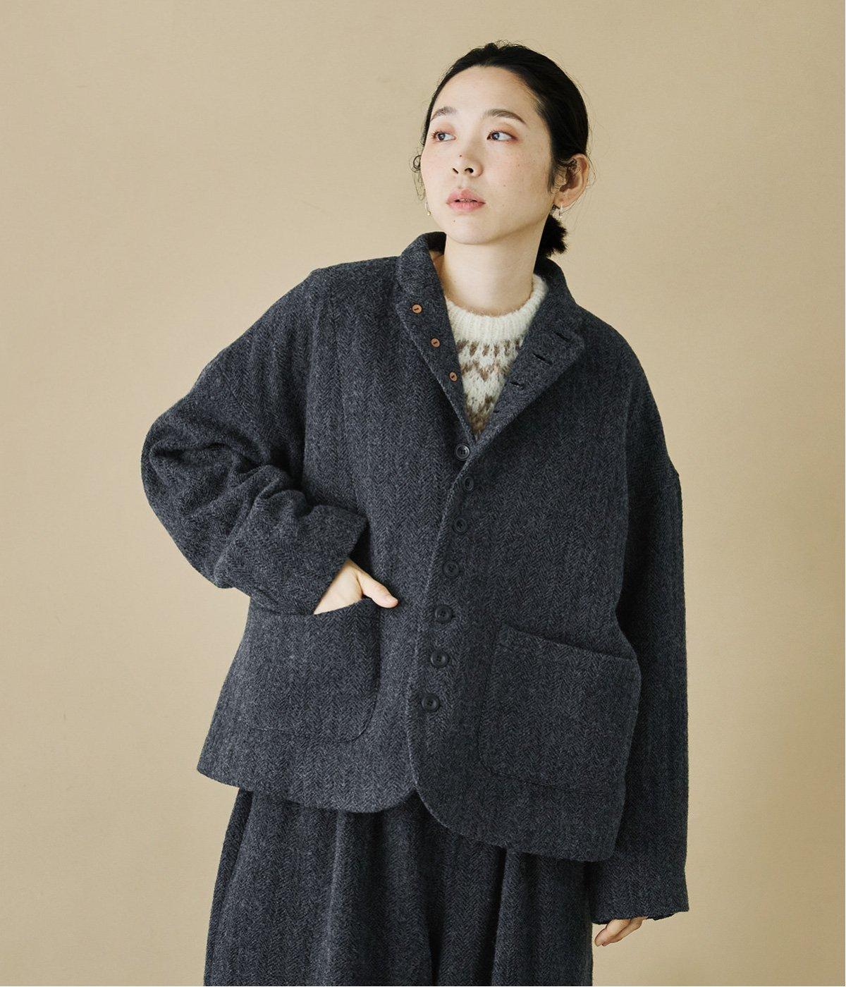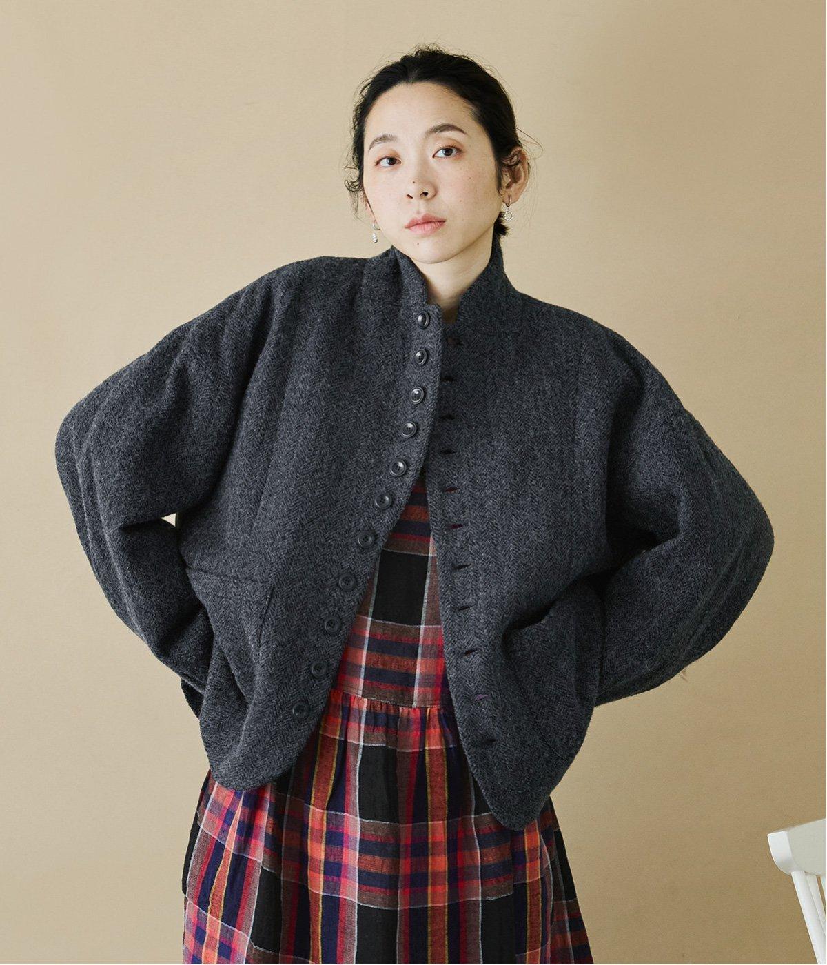 繊細なヘリンボーン柄が装いに奥行きを添えるウールジャケット。ほどよい立ち襟ときれいに並んだボタンが印象的で、シンプルながら存在感のある一着です。