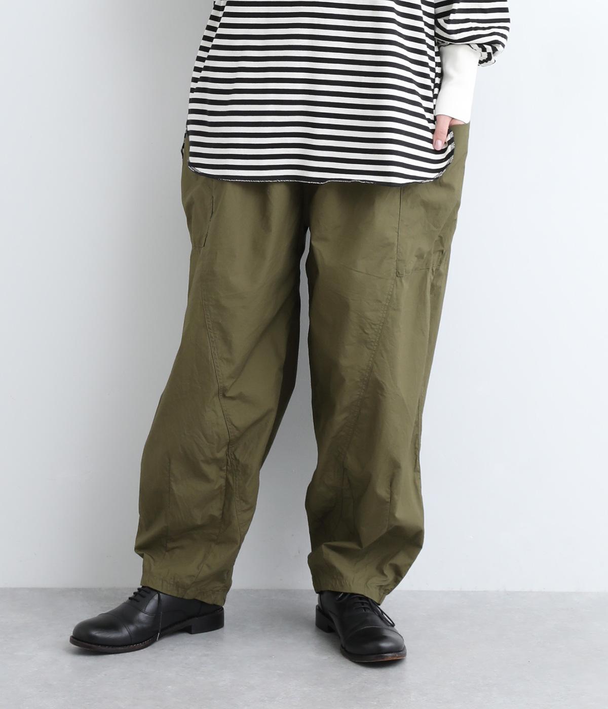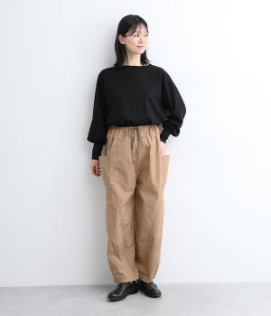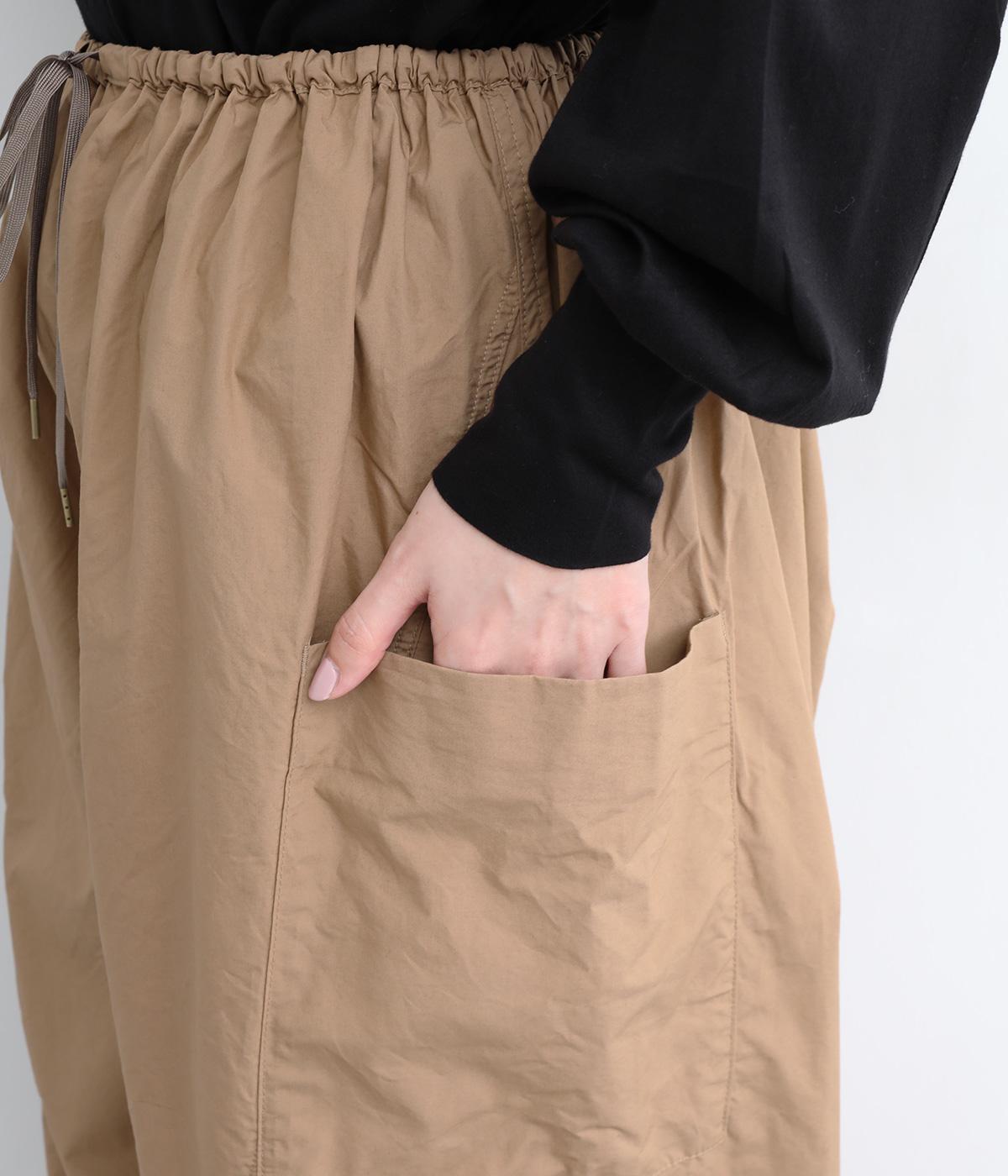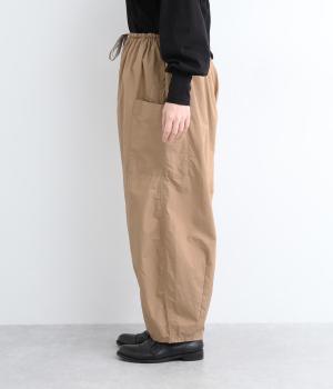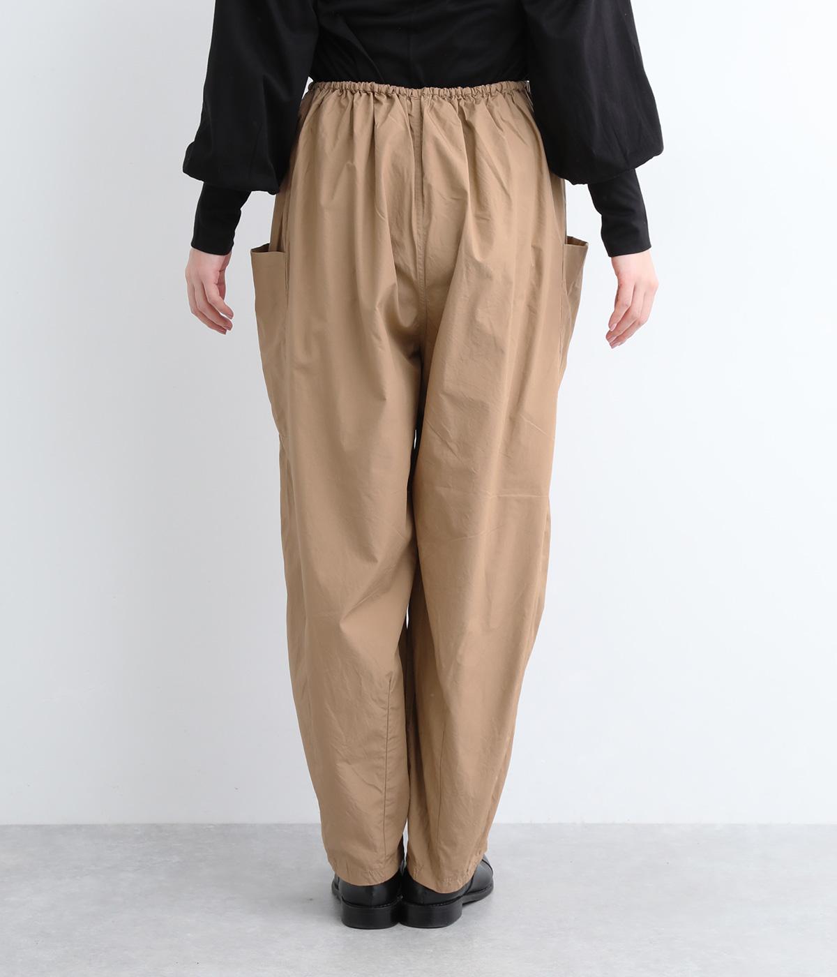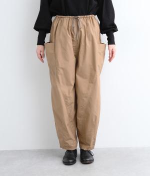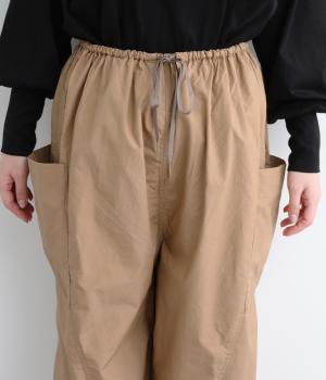 裾にダーツをあしらって、ふんわりとしたシルエットに仕上げたパンツです。サイドの大きめポケットが、ワークテイストなアクセントに。ウエストはゴム仕様でリラックスしたはき心地、トップスインのアクセントにもなる外紐で調節も可能です。