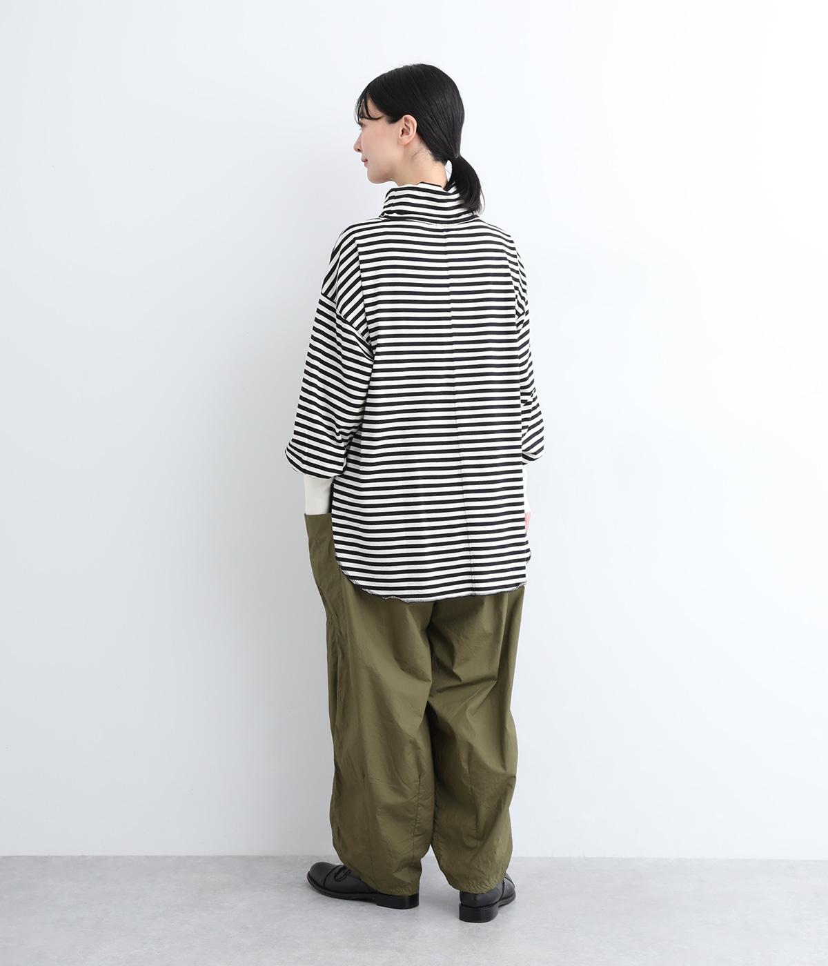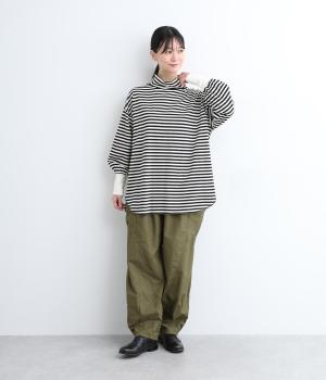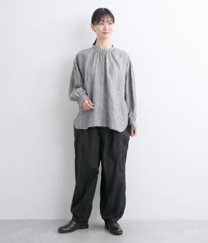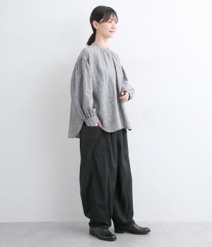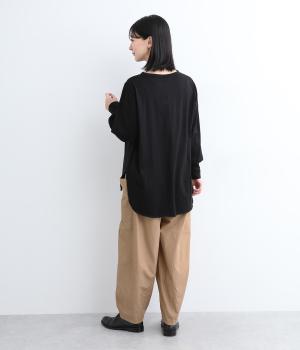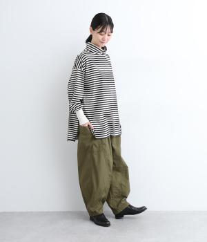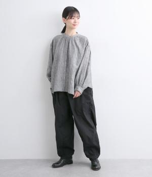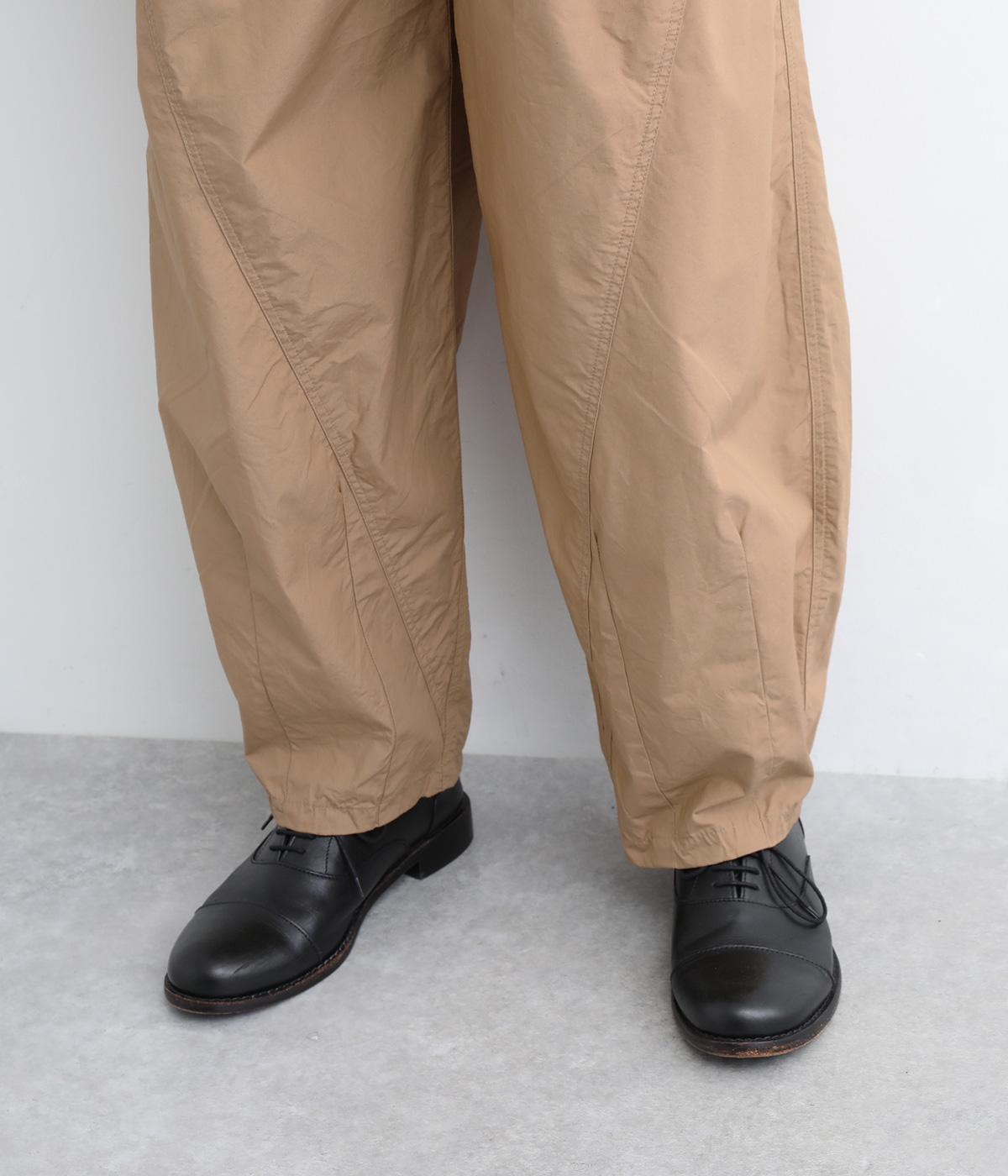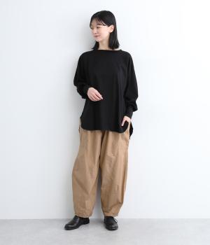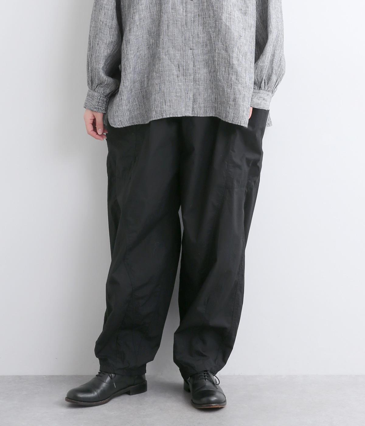 裾にダーツをあしらって、ふんわりとしたシルエットに仕上げたパンツです。サイドの大きめポケットが、ワークテイストなアクセントに。ウエストはゴム仕様でリラックスしたはき心地、トップスインのアクセントにもなる外紐で調節も可能です。