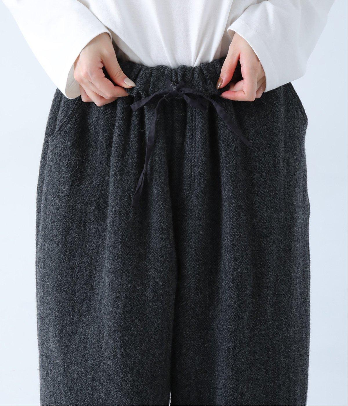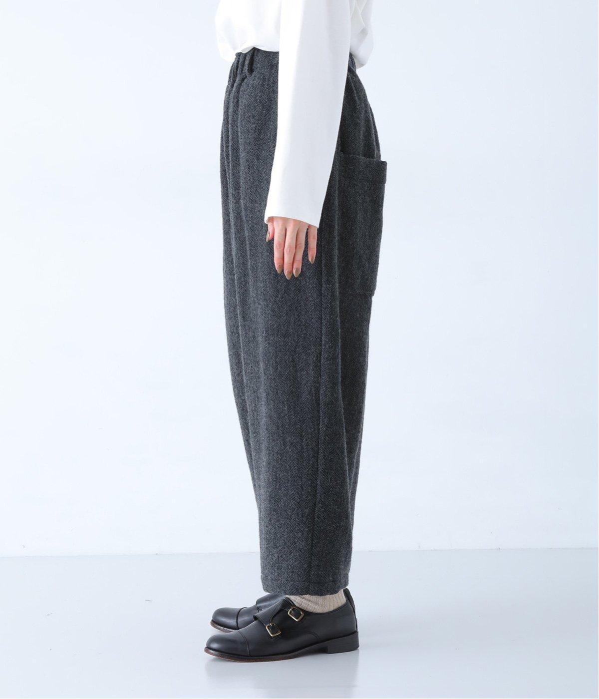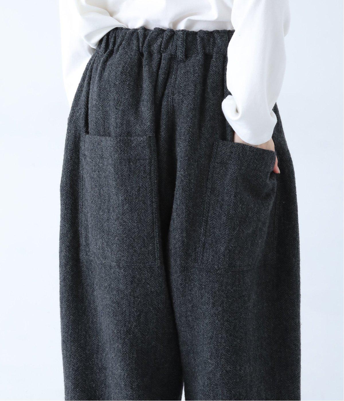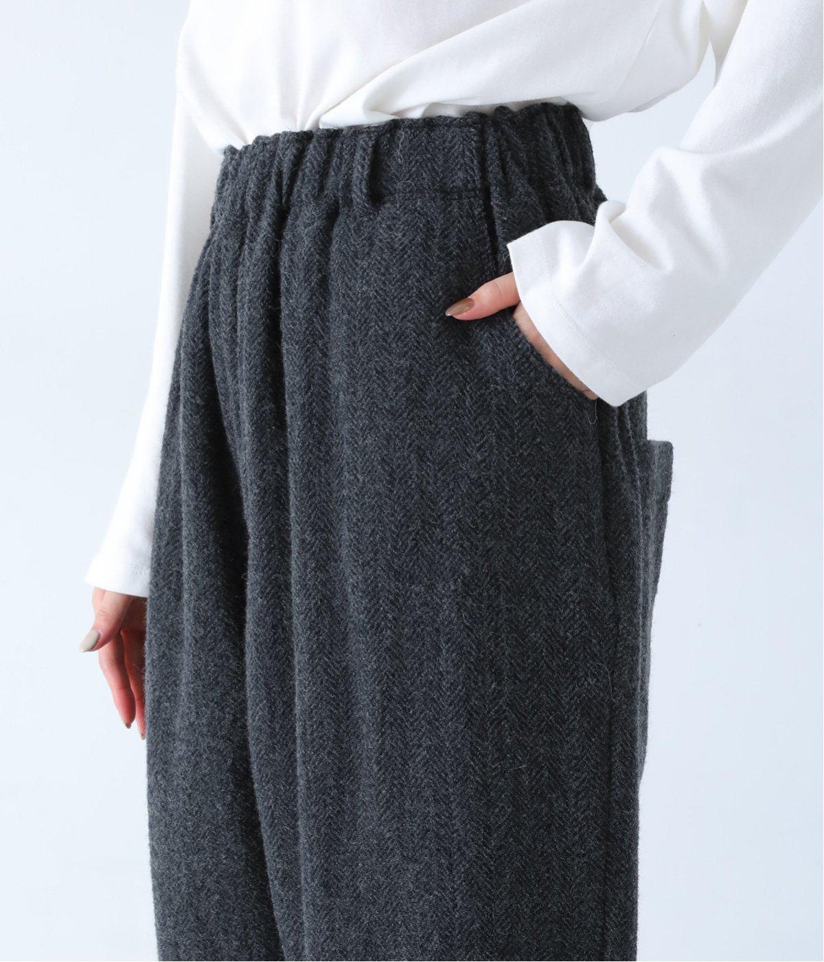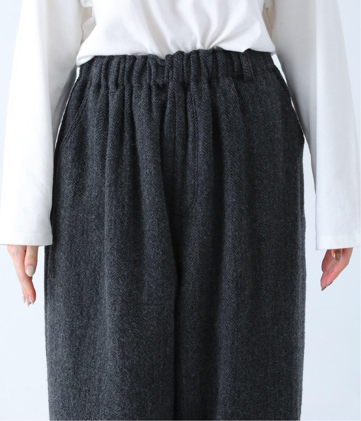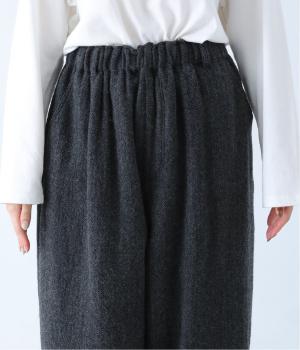 総ゴム仕様のウエストからたっぷりとギャザーを広げ、ワイドシルエットに仕上げました。イージーな着用感ながらも、品のよいヘリンボーン生地がラフな印象を軽減。後ろにつけた大きなポケットがお尻のラインをカモフラージュしてくれます。