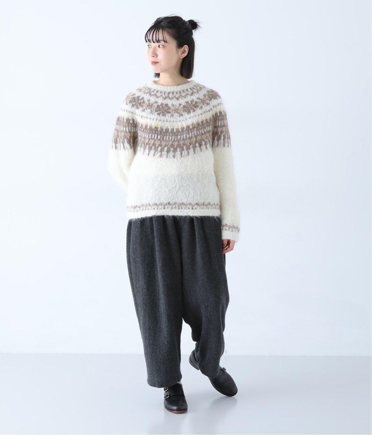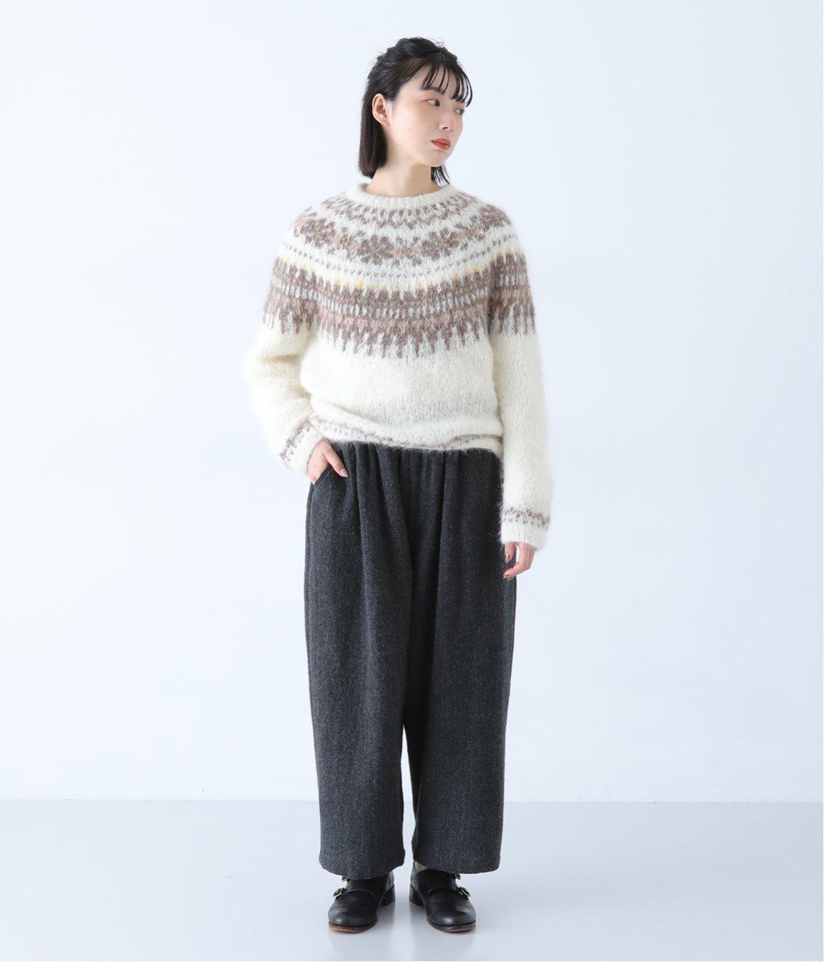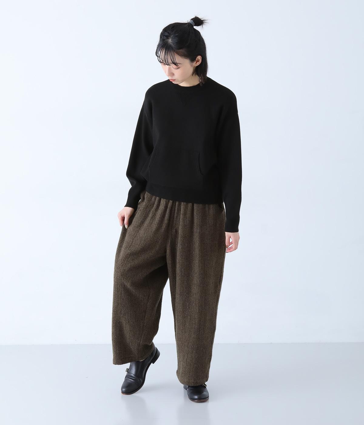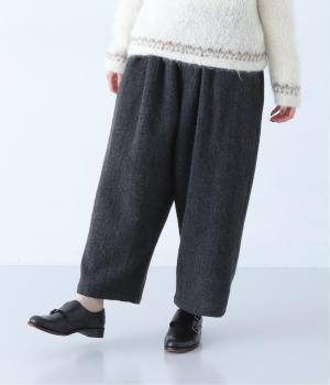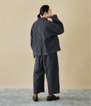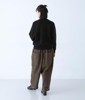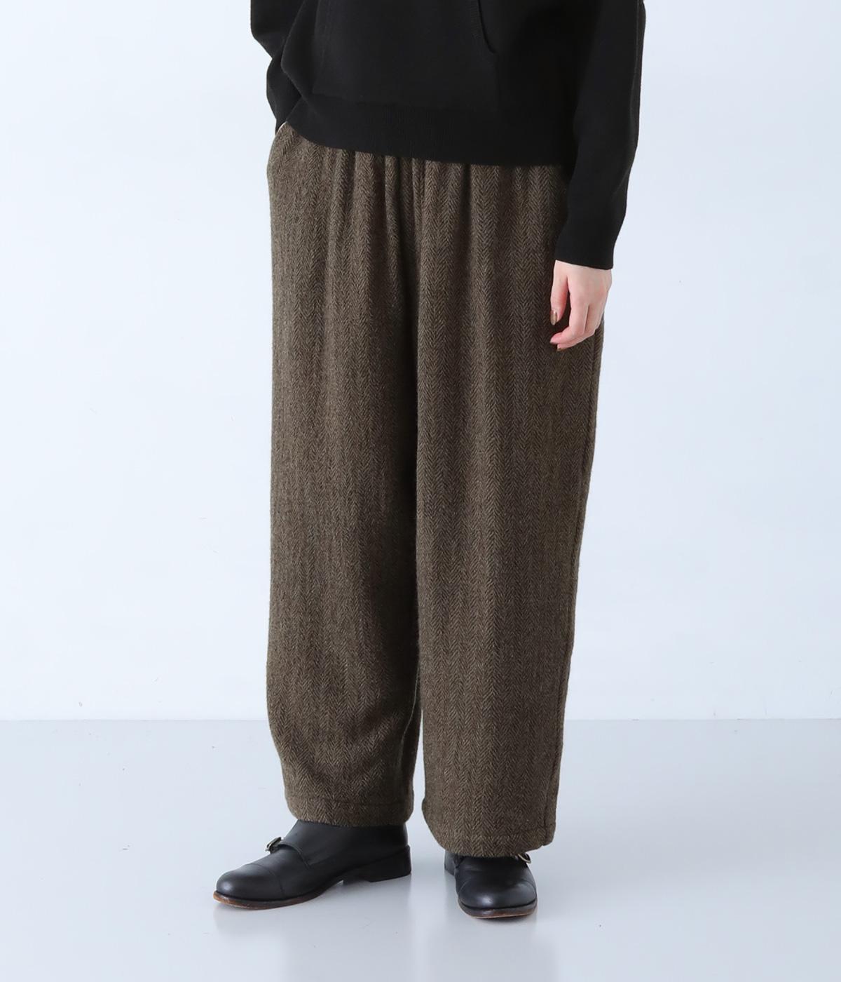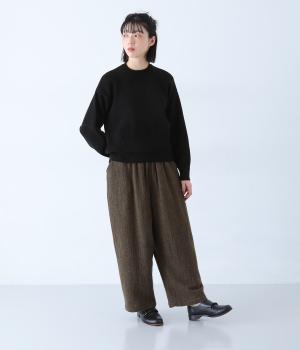 総ゴム仕様のウエストからたっぷりとギャザーを広げ、ワイドシルエットに仕上げました。イージーな着用感ながらも、品のよいヘリンボーン生地がラフな印象を軽減。後ろにつけた大きなポケットがお尻のラインをカモフラージュしてくれます。