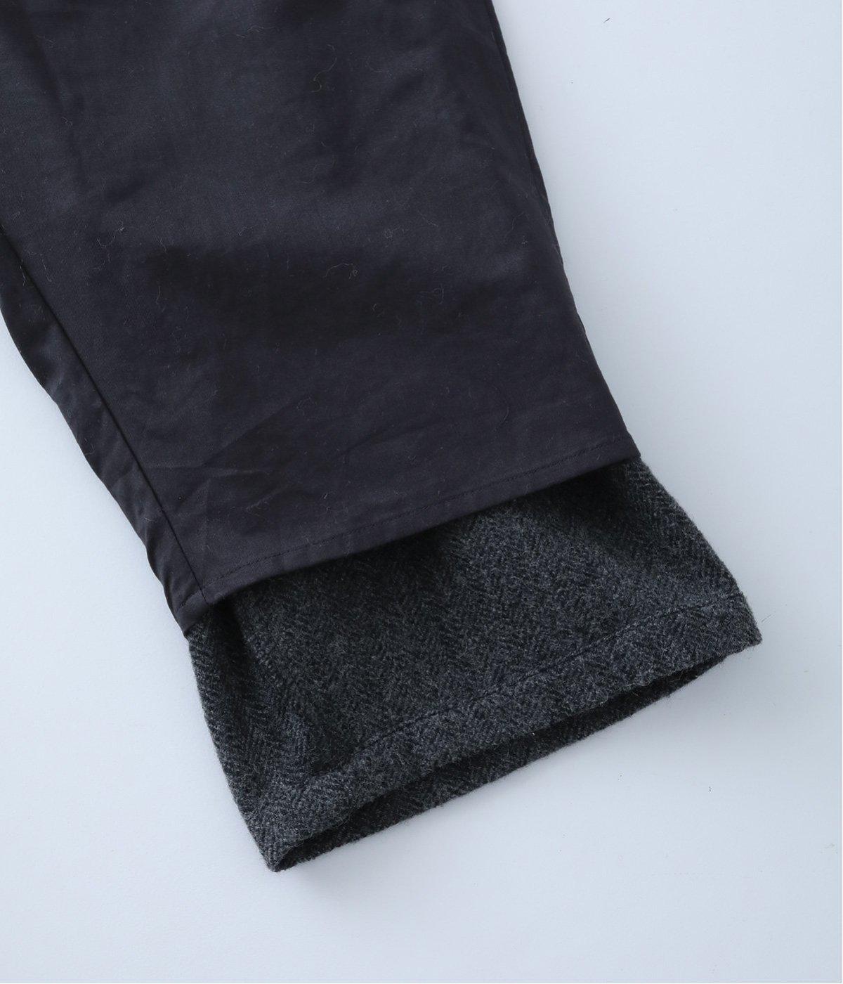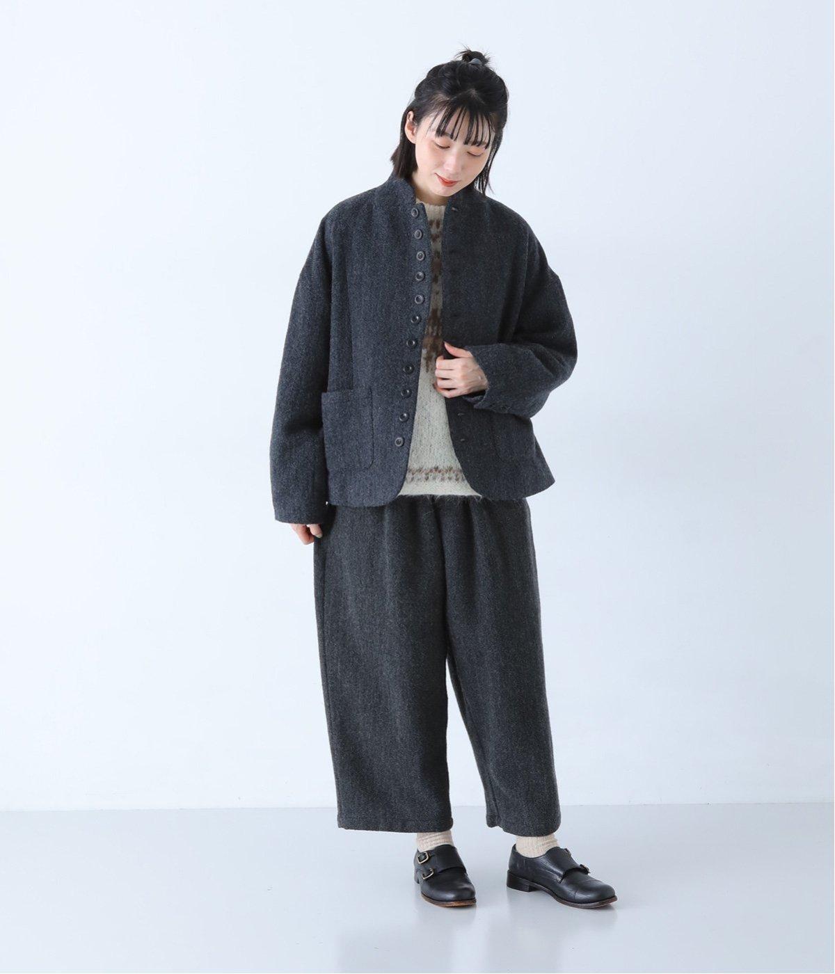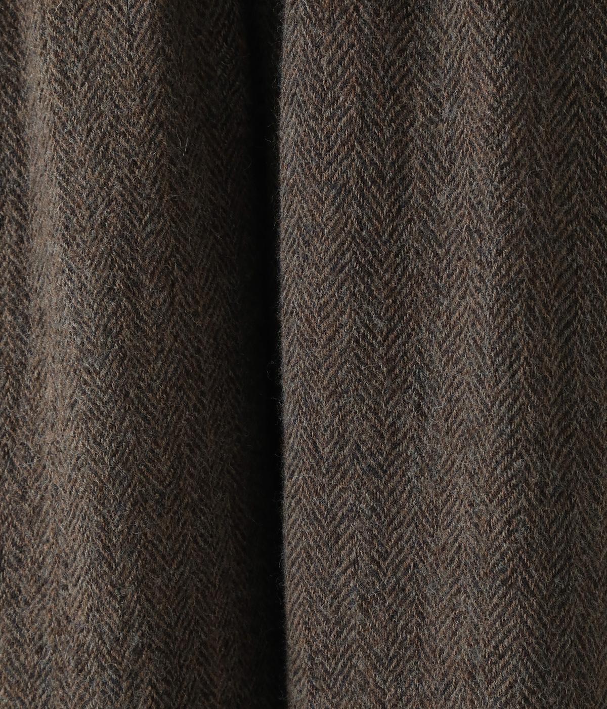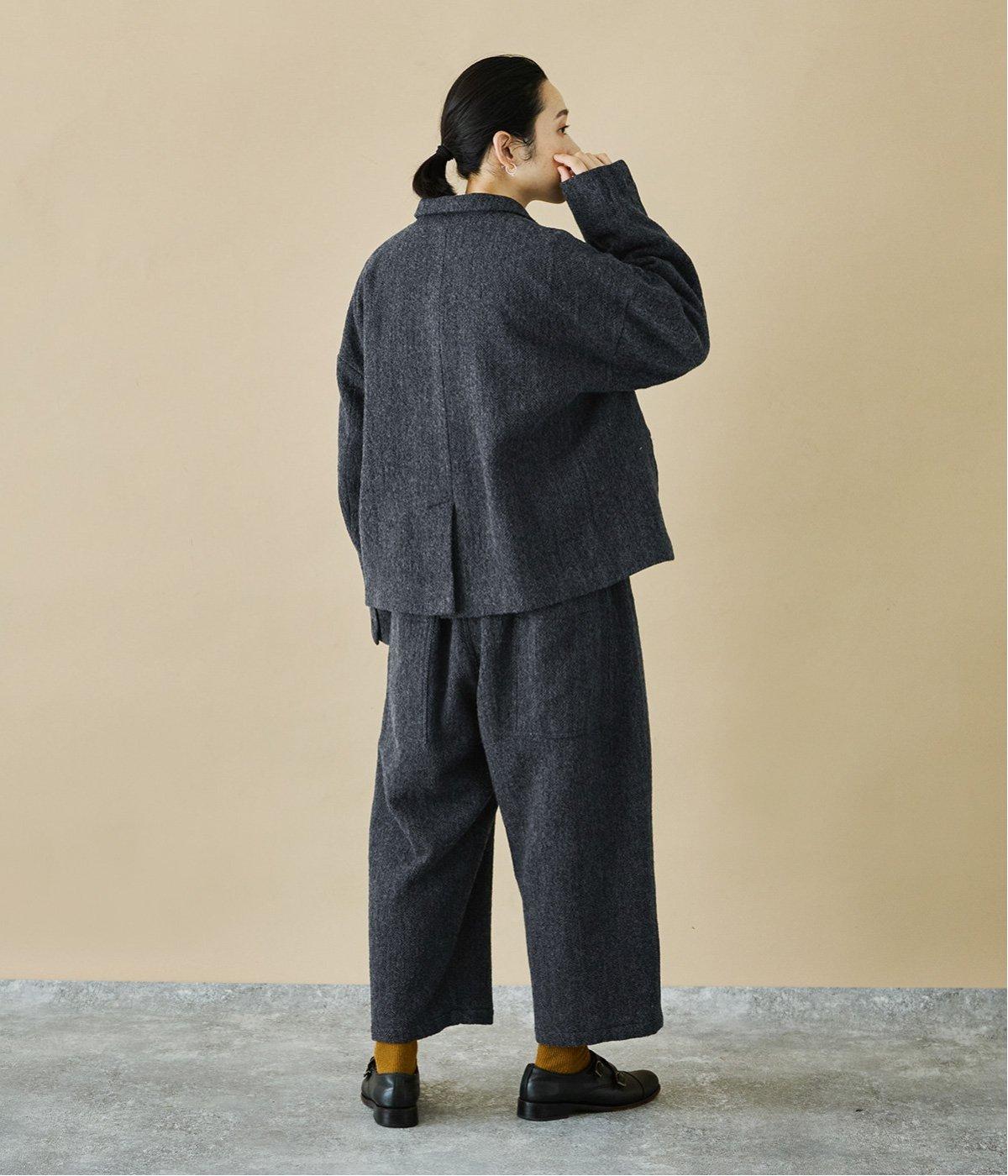 ヘリンボーンの織り柄が高級感を与えるウール生地。しっかりとした厚みとあたたかみがありつつ、とても軽いので履き心地も◎です。さらりとした裏地をつけて肌触りのよさをアップさせました。