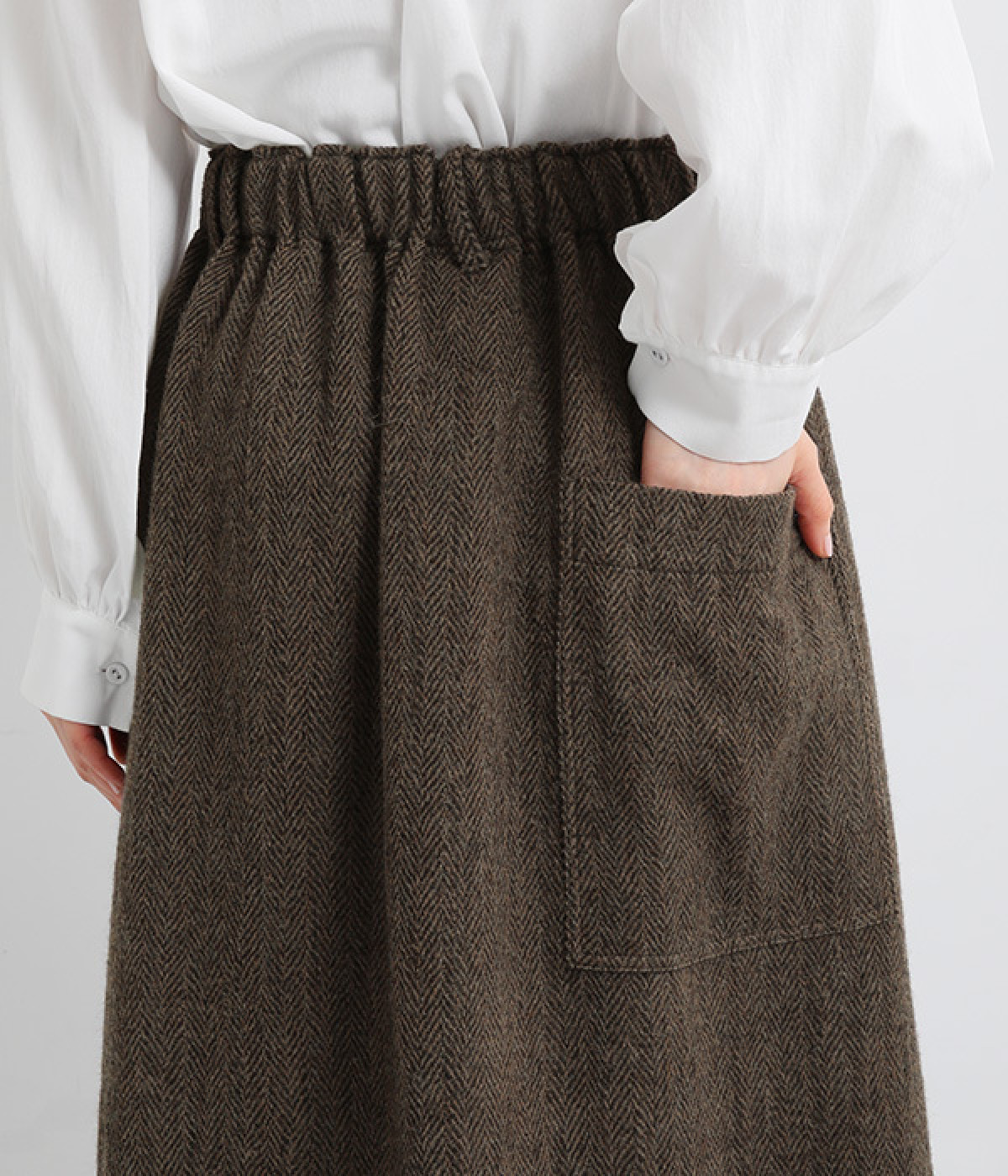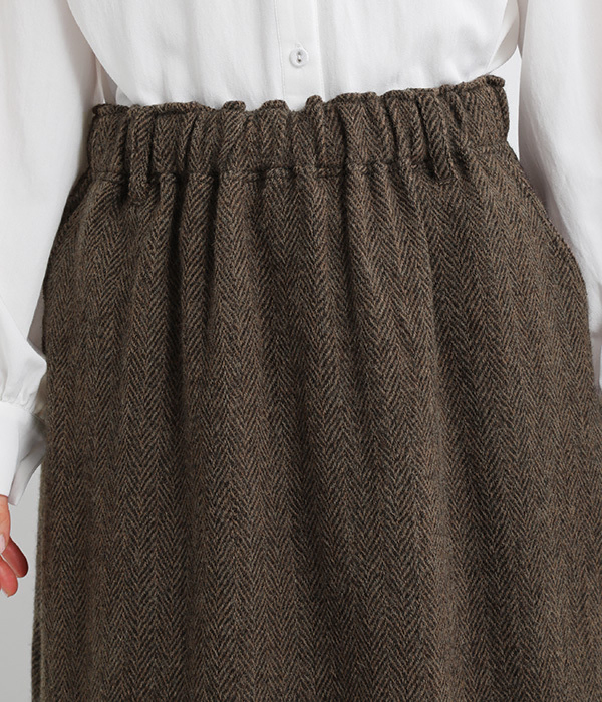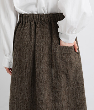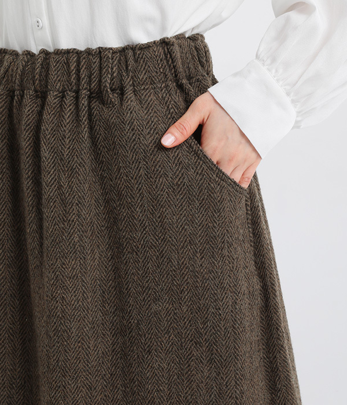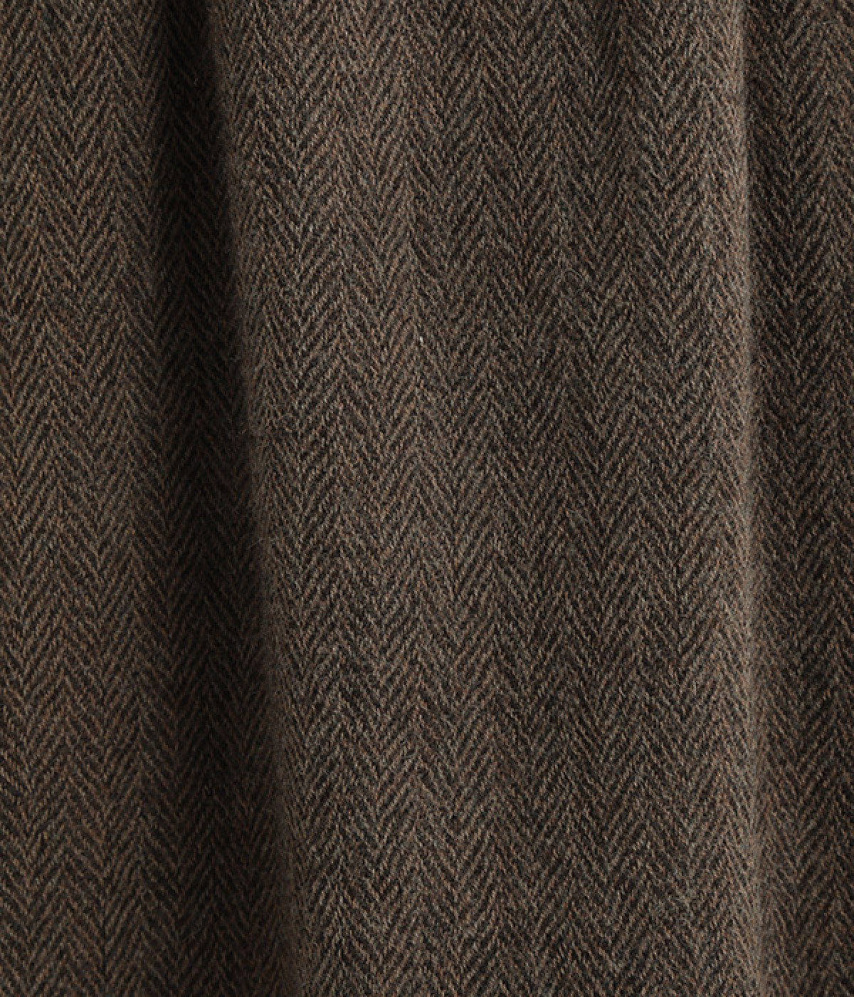 ふっくらとソフトな肌心地とあたたかなはき心地を味わえるウール素材を使用しています。装いに凛とした表情を生み出すヘリンボーン織りで大人な雰囲気に。裾までのコットン裏地が備わり、身生地を傷めないしっかりとした仕立てです。