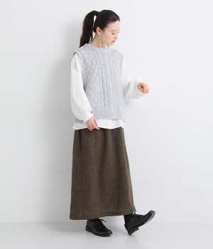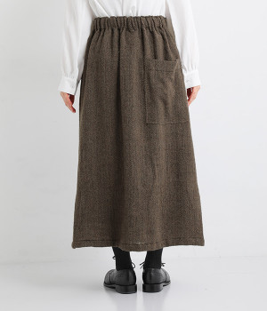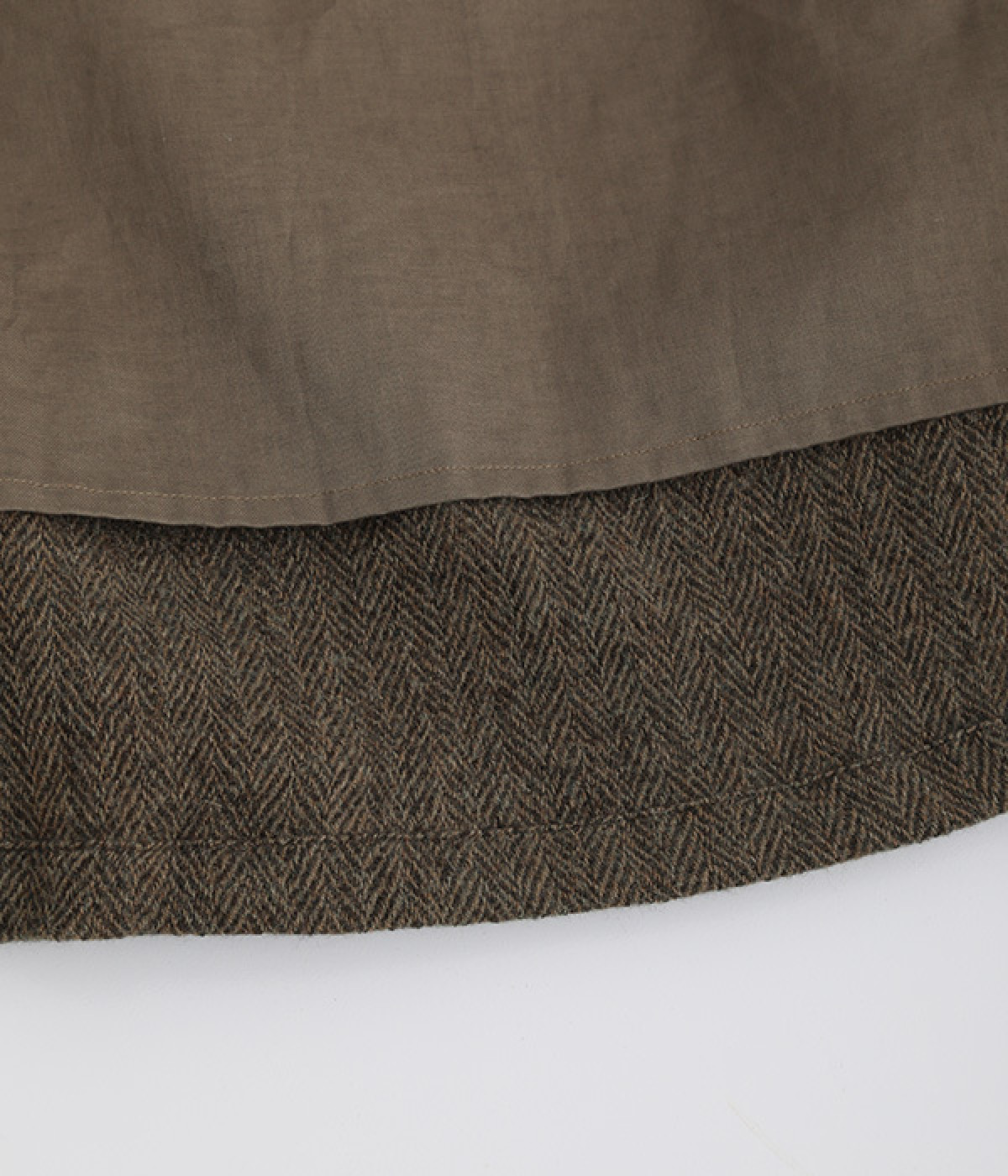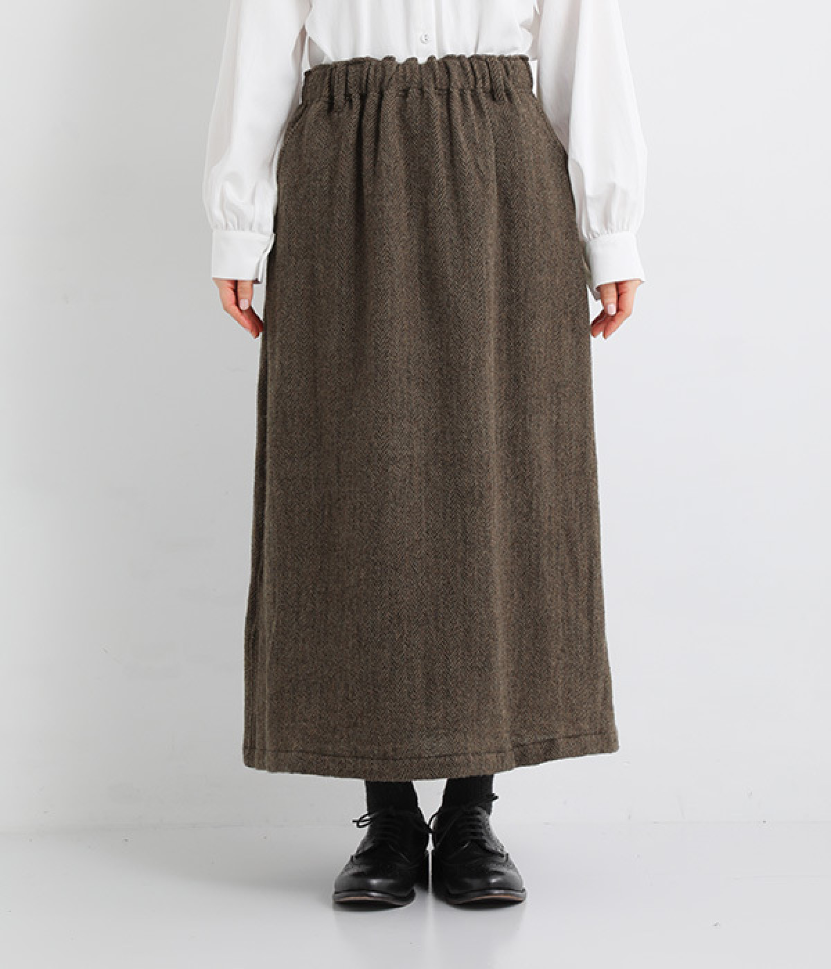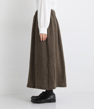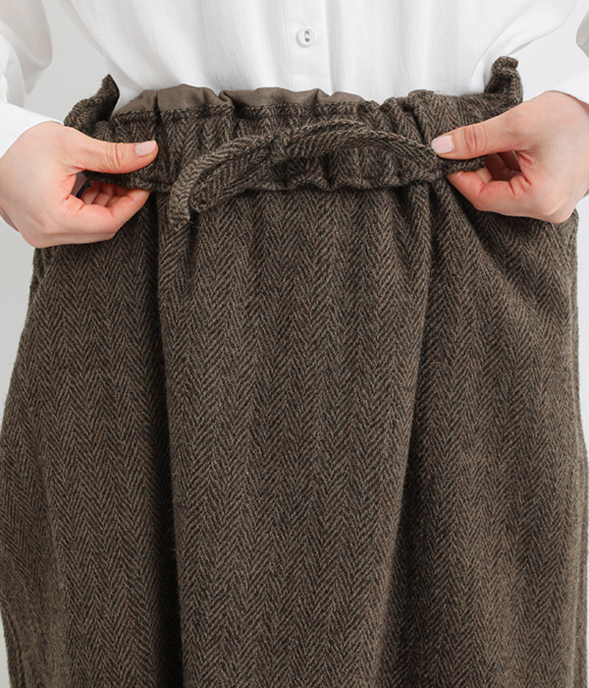 ふっくらとソフトな肌心地とあたたかなはき心地を味わえるウール素材を使用しています。装いに凛とした表情を生み出すヘリンボーン織りで大人な雰囲気に。裾までのコットン裏地が備わり、身生地を傷めないしっかりとした仕立てです。