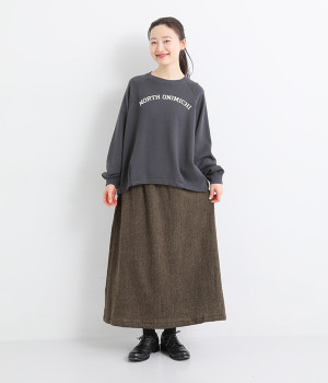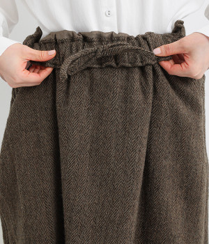 カジュアルシーンだけでなく、きちんと感が欲しいシーンにも活躍してくれるヘリンボーン織り。裾に向かって広がるフレアシルエットは、足さばきの妨げにならないのも特徴です。ヒップポケットをやや下位置にレイアウトしてちょっとした遊び心も◎。腰まわりに負担がかかりにくいウエスト総ゴム仕様です。