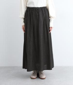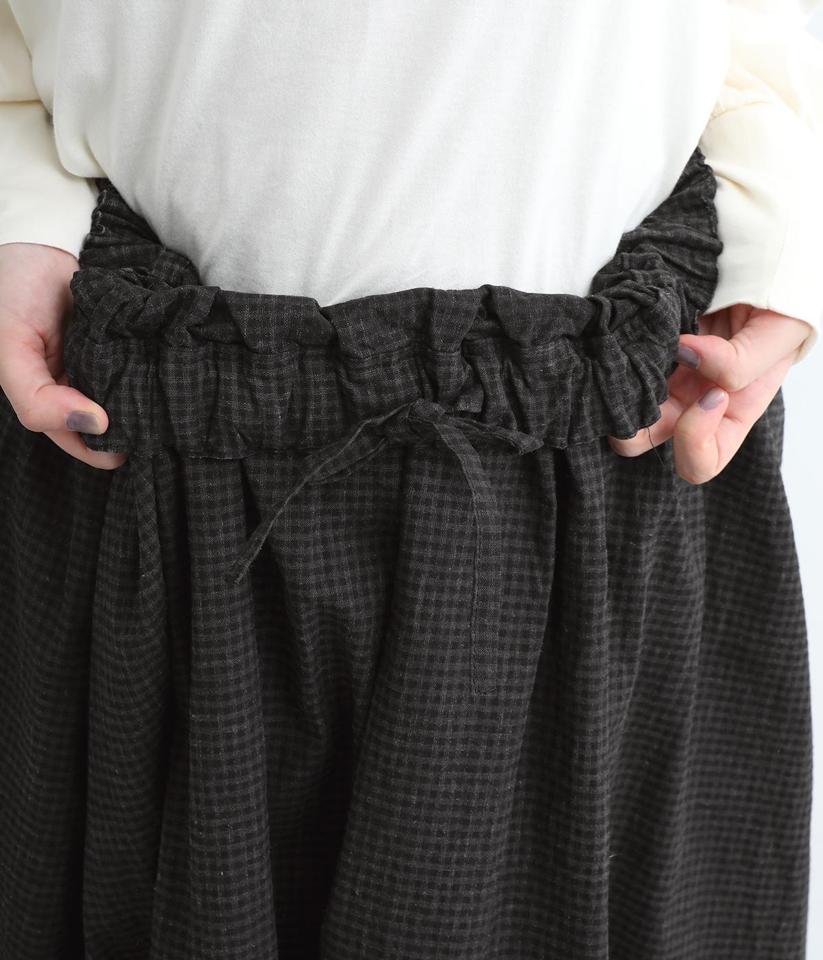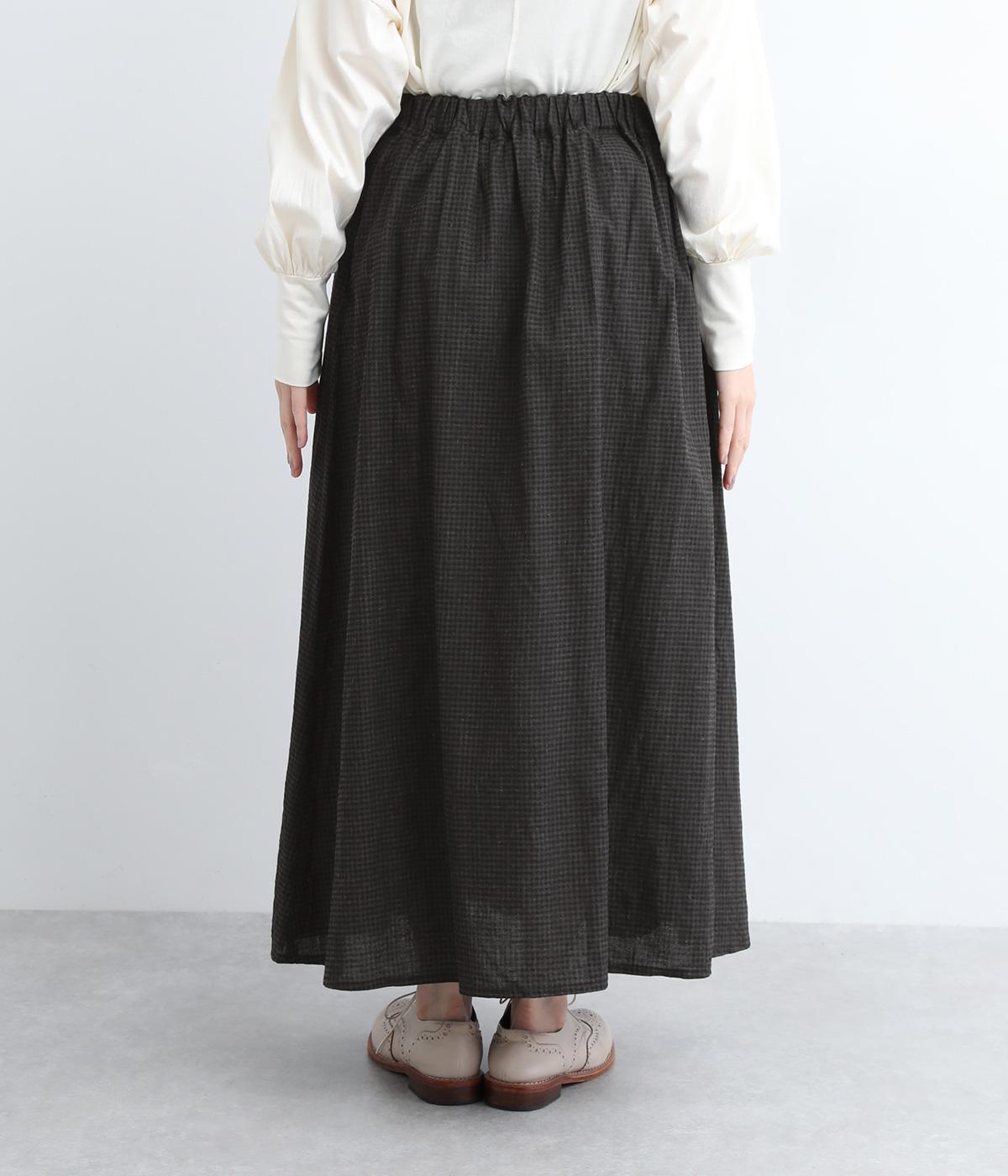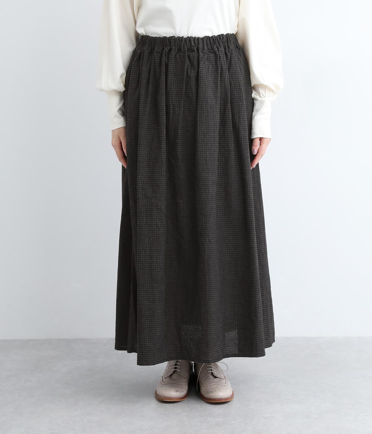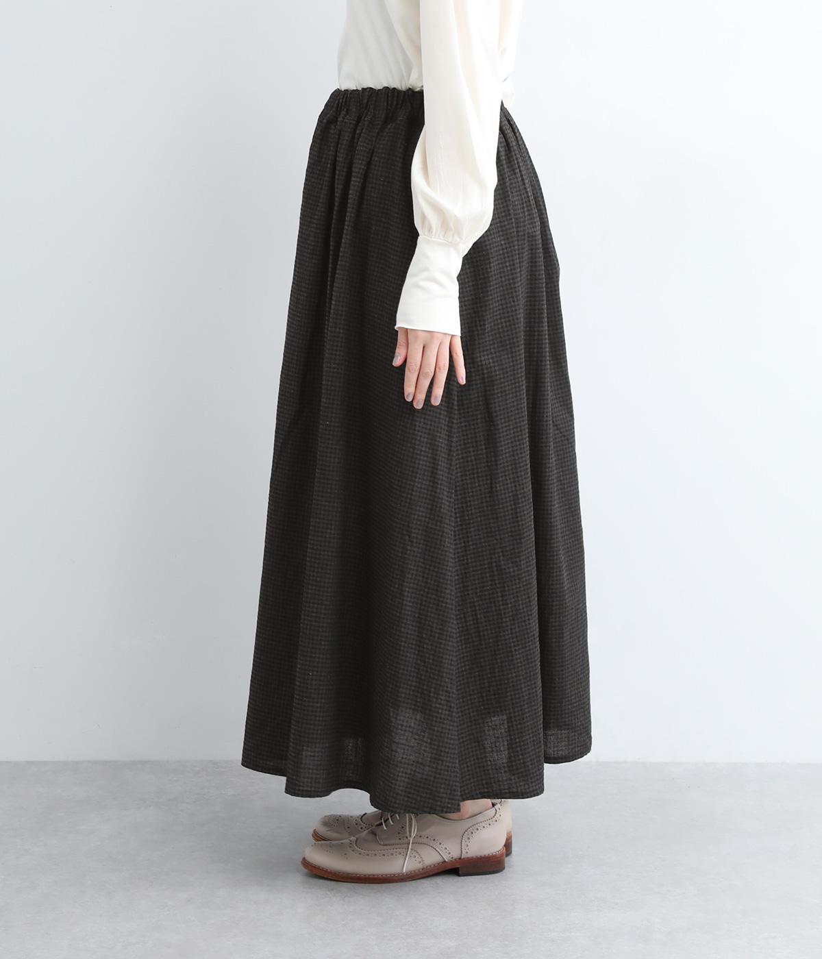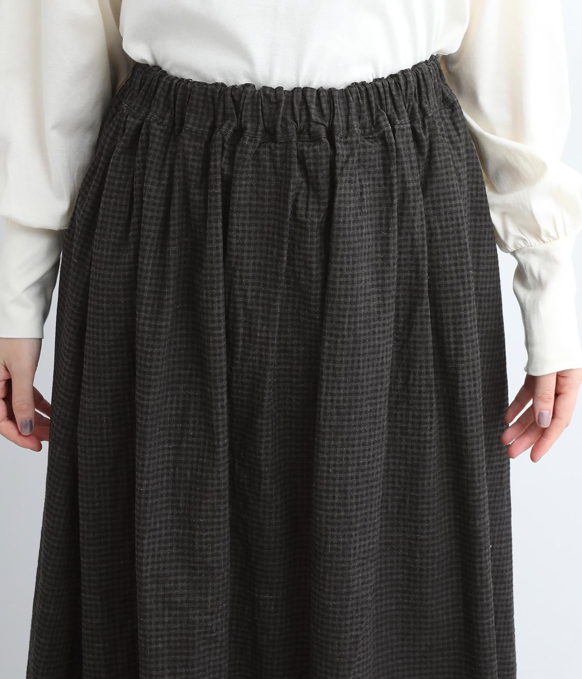 たっぷりギャザーが大人かわいい、ロング丈のフレアスカートです。存在感がありながら、ナチュラルな雰囲気を与えるギンガムチェック柄を採用。ウエストには幅広いゴムを使用しているので締めつけが気になりにくく、内側の紐で微調節も可能です。
