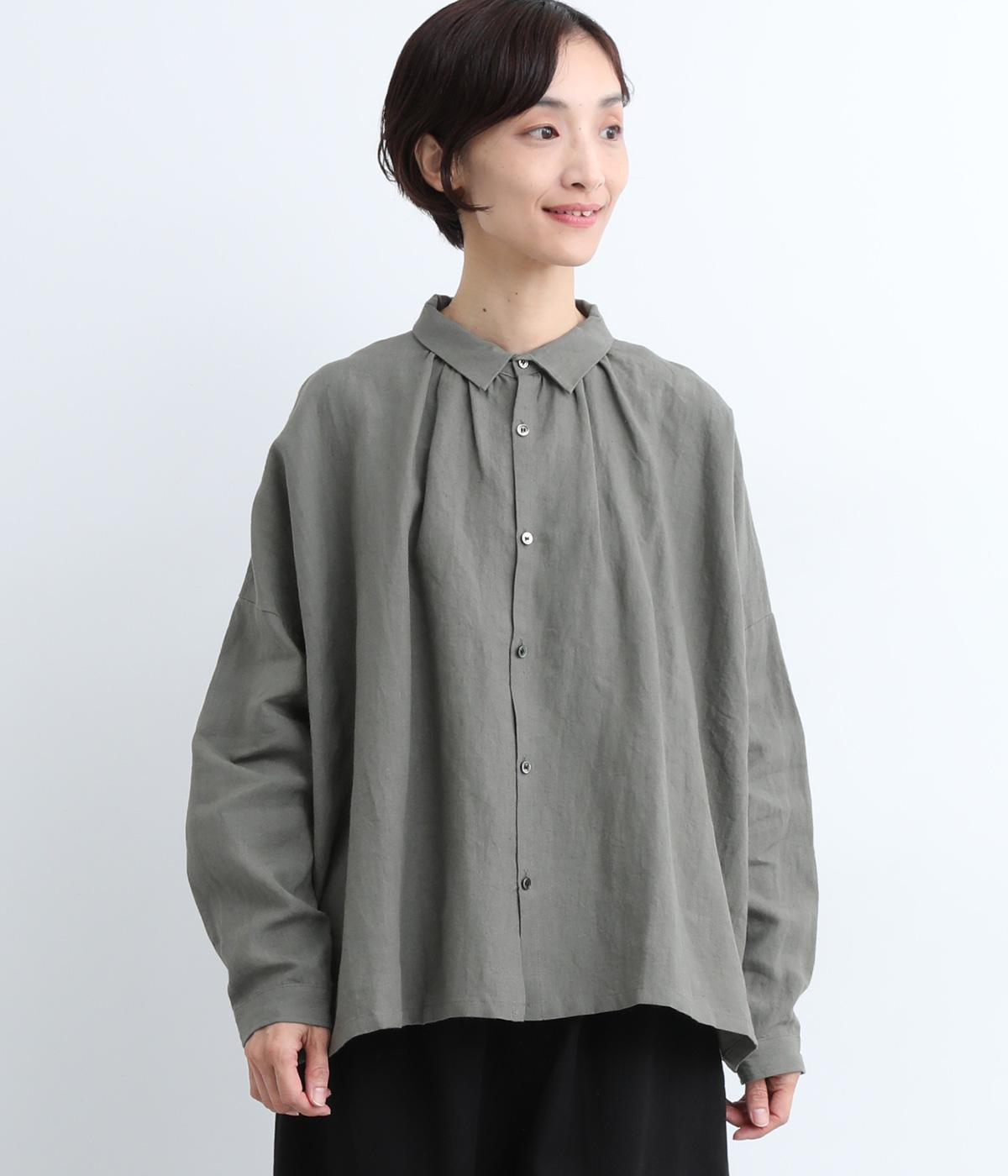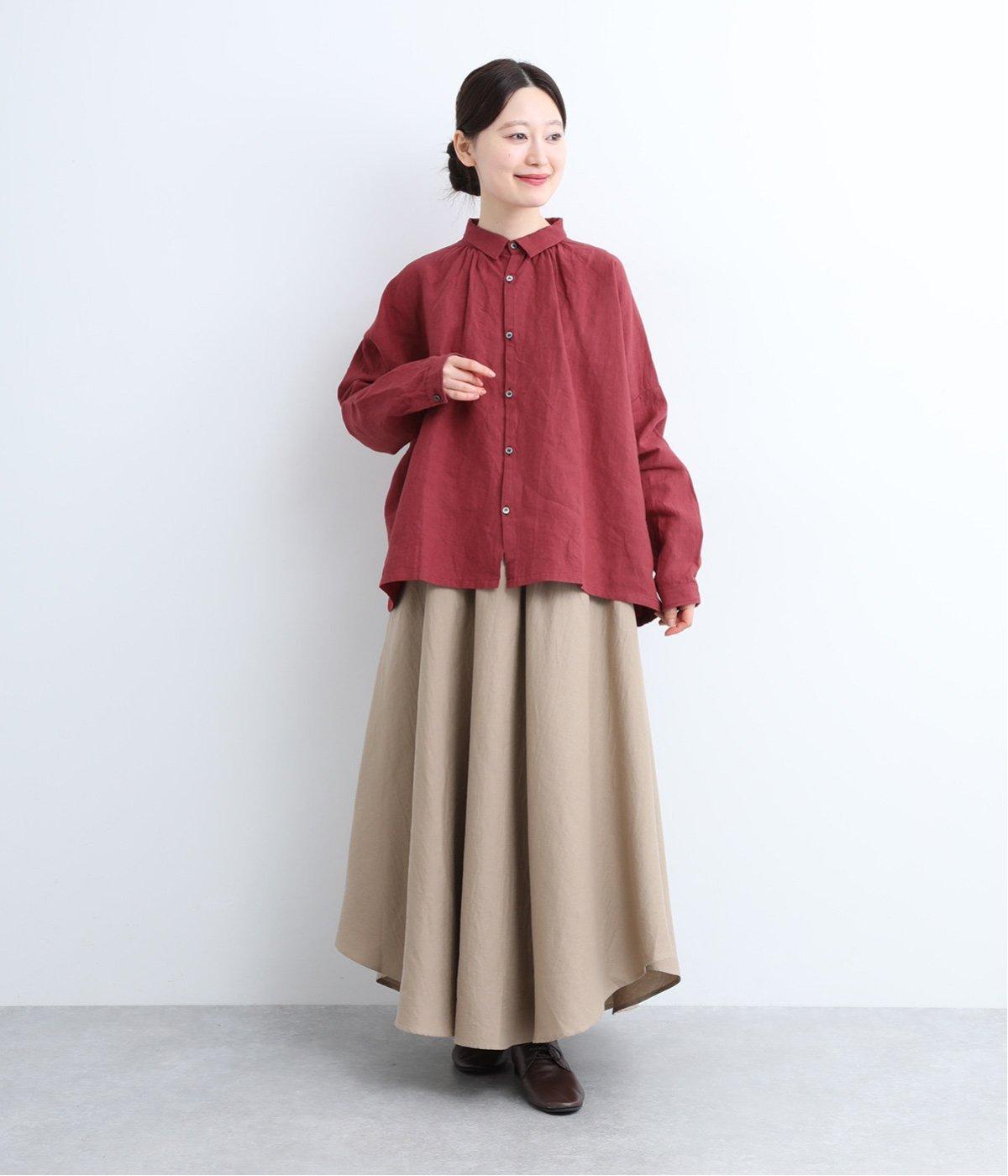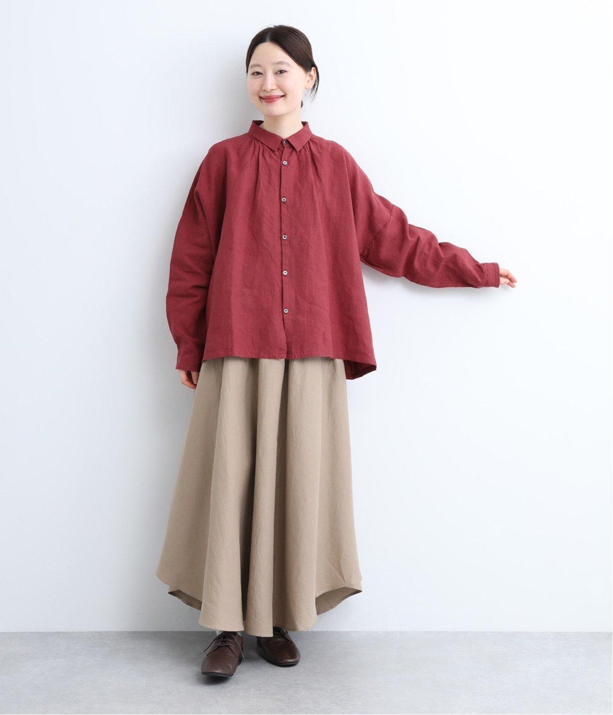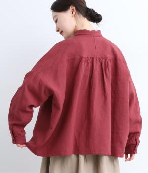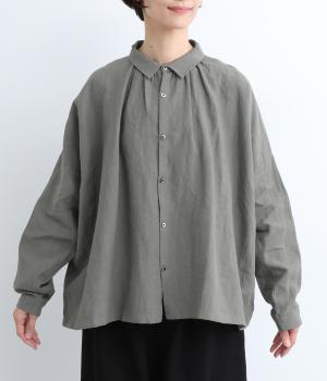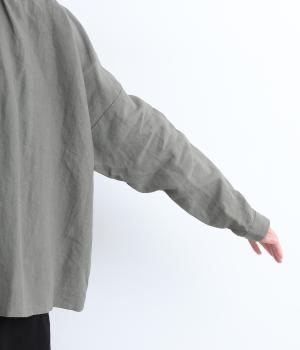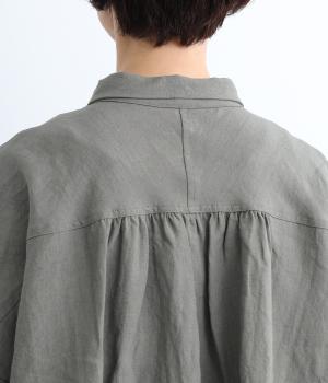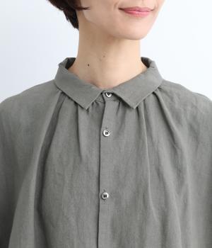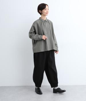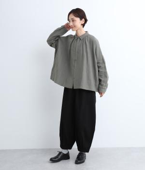 ゆとりのある身幅にギャザーを寄せて肌離れのいいフレア感を出しました。ちょこんとついた小さめの襟や袖カフスが、リラックスすぎないちょうどいいメリハリポイントに。前あきの羽織り使いもおすすめで主役にもサブにもなります。