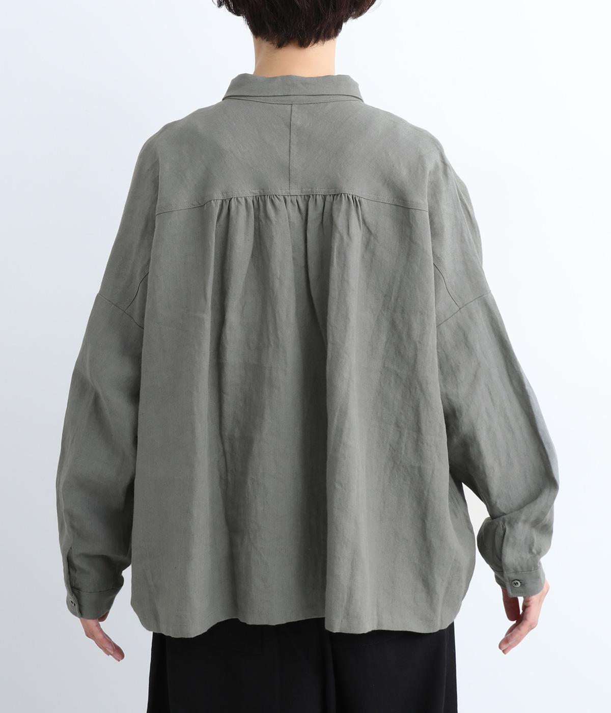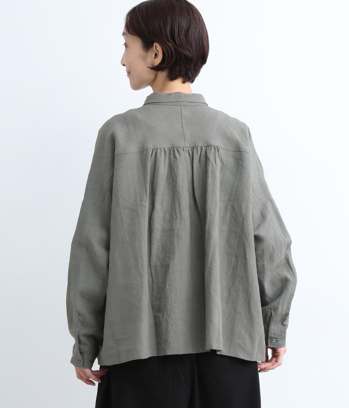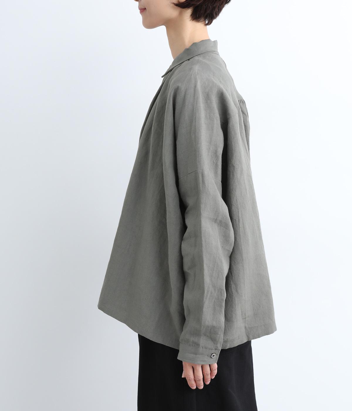 ゆとりのある身幅にギャザーを寄せて肌離れのいいフレア感を出しました。ちょこんとついた小さめの襟や袖カフスが、リラックスすぎないちょうどいいメリハリポイントに。前あきの羽織り使いもおすすめで主役にもサブにもなります。