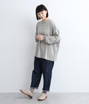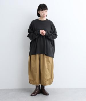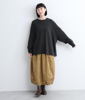 裾に向かって広がるシルエットが、お腹やお尻をカバーしてくれるだけでなくリラクシーな雰囲気を演出。ラフなドロップショルダーで、こなれ感も堪能できます。袖口がくしゅっとなるたっぷりとした生地使いが、女性らしいアクセントとして作用します。