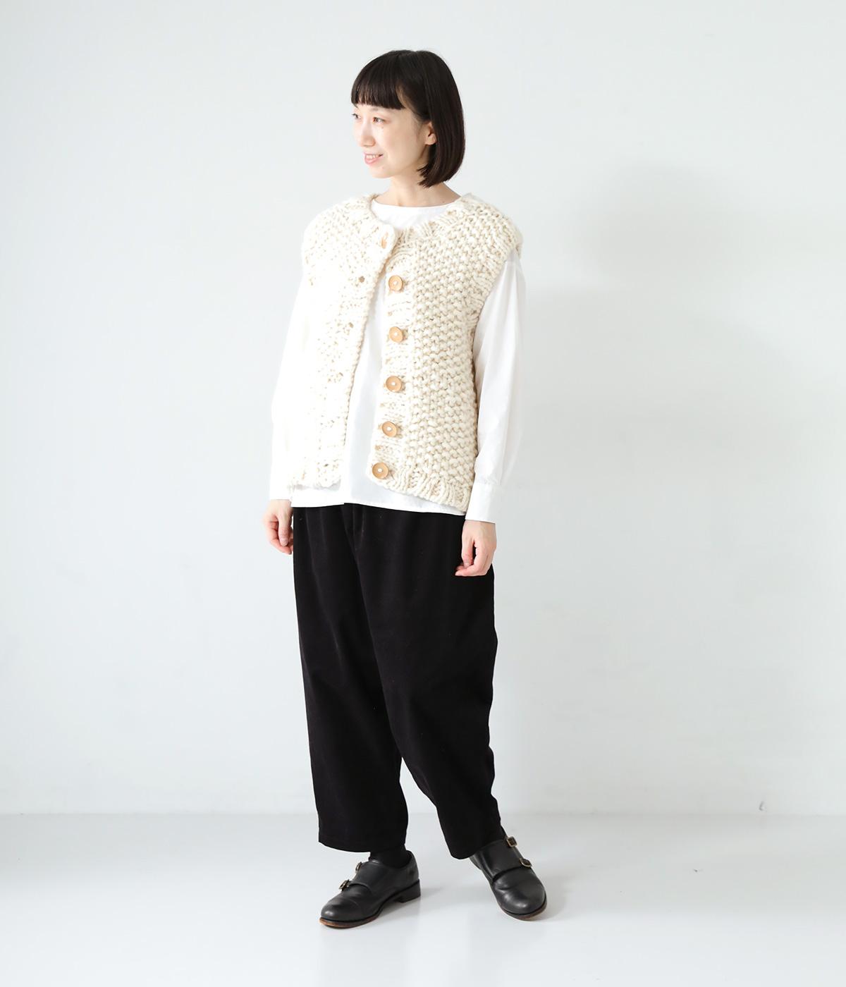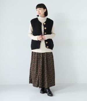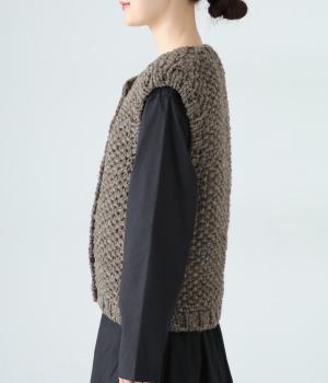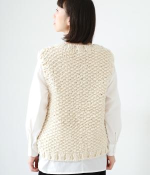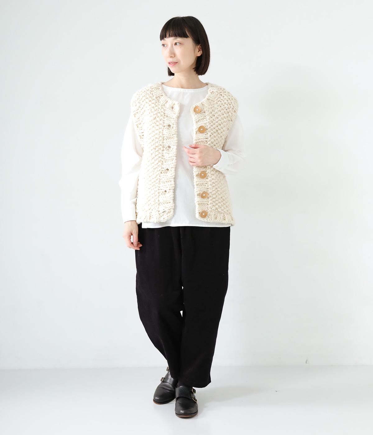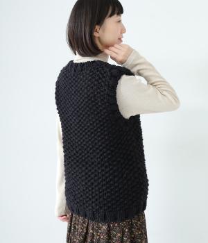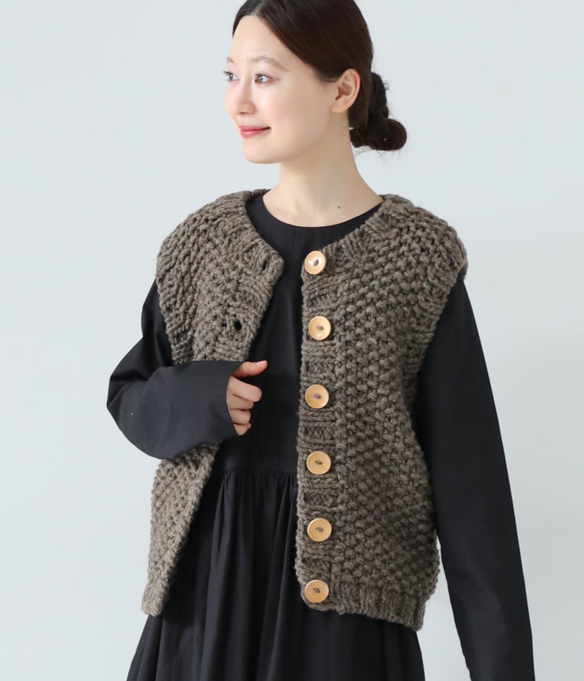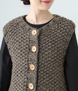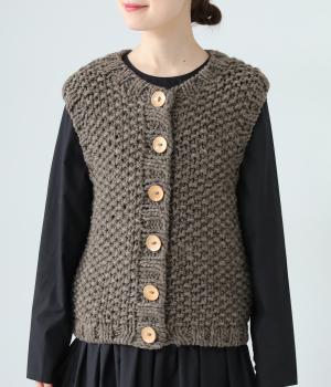 コーディネートに季節感をプラスするニットベスト。クラフト感のあるニットに大きめのウッドボタンを並べた、ぬくもりのある柔らかな雰囲気が素敵です。ボリュームがありながらも、ベストならではのすっきりとしたデザインで好バランスに。真冬には上からアウターを羽織って長く活躍します。