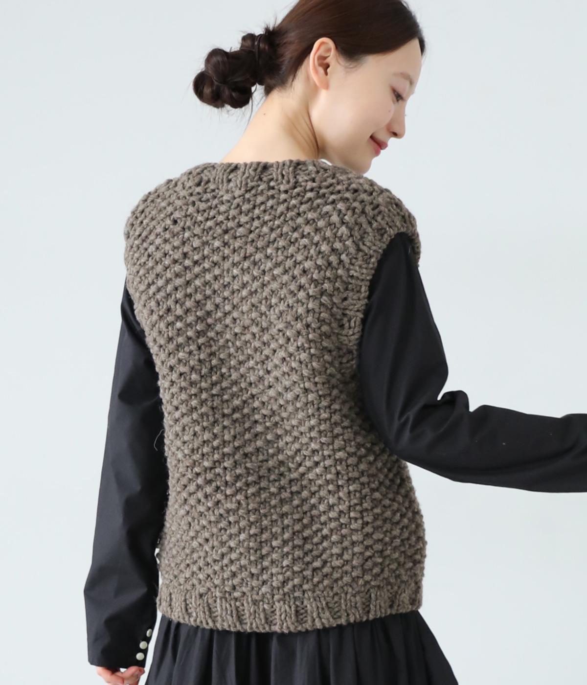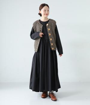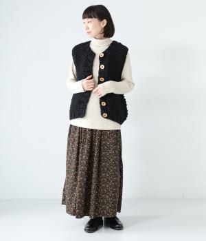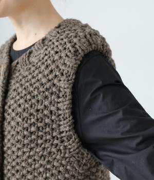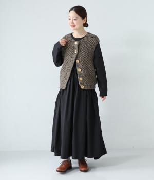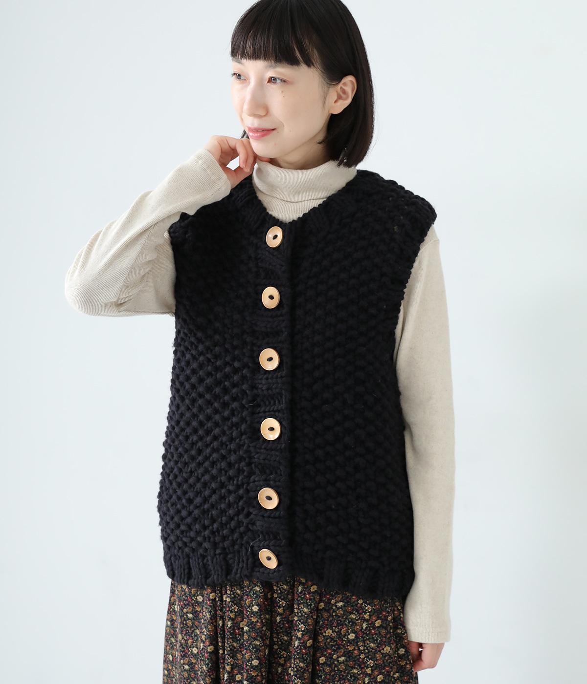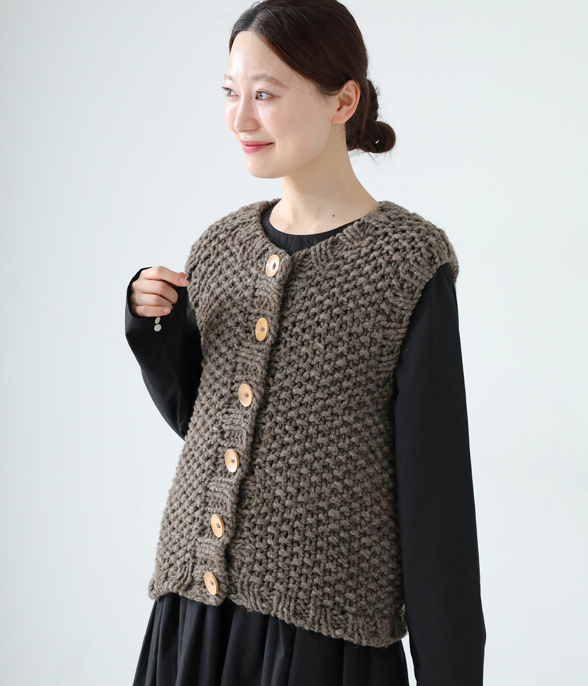 コーディネートに季節感をプラスするニットベスト。クラフト感のあるニットに大きめのウッドボタンを並べた、ぬくもりのある柔らかな雰囲気が素敵です。ボリュームがありながらも、ベストならではのすっきりとしたデザインで好バランスに。真冬には上からアウターを羽織って長く活躍します。