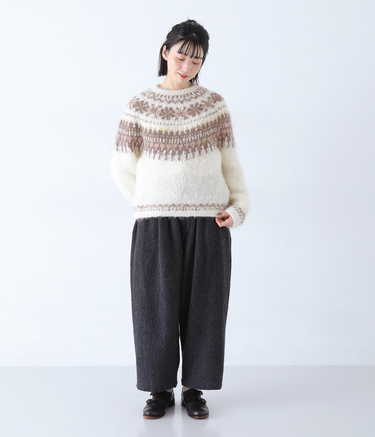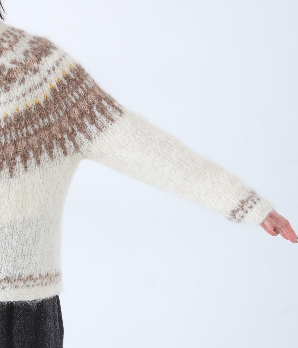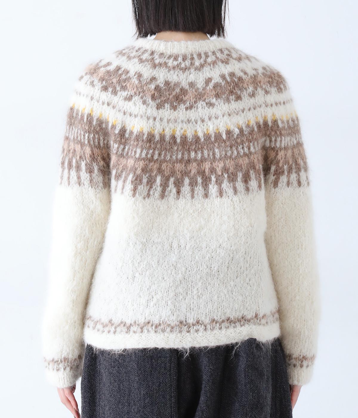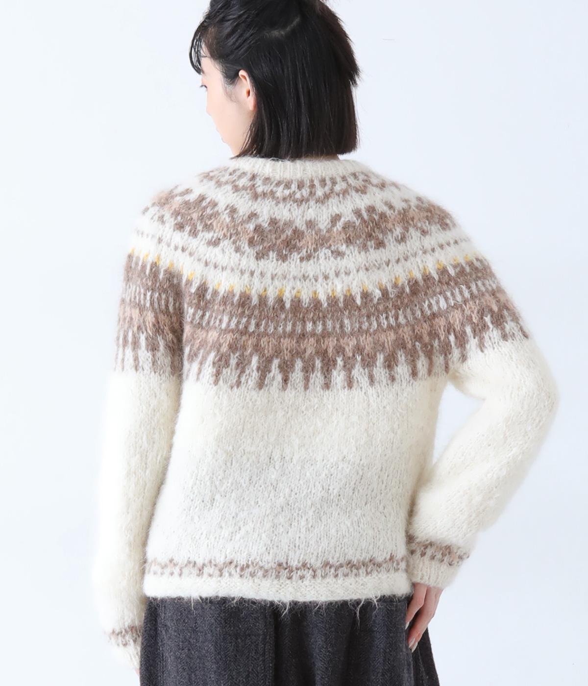 ネックラインを中心にぐるりと柄をあしらった、ノスタルジックなムード漂う求心編みニット。どこから見ても柄が映える華やかさがありつつ、肩まわりをすっきりと見せてくれます。一枚であたたかく着映えが叶う、寒い時期に頼れるアイテムです。
