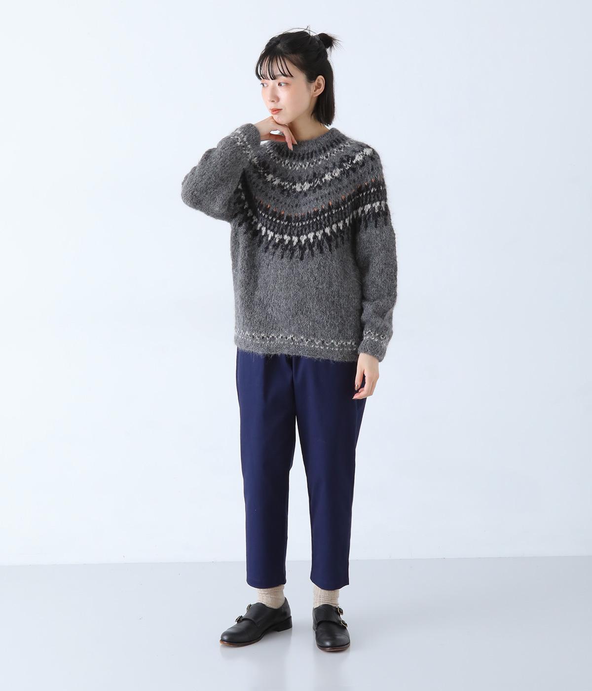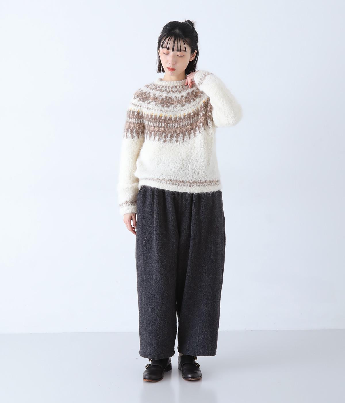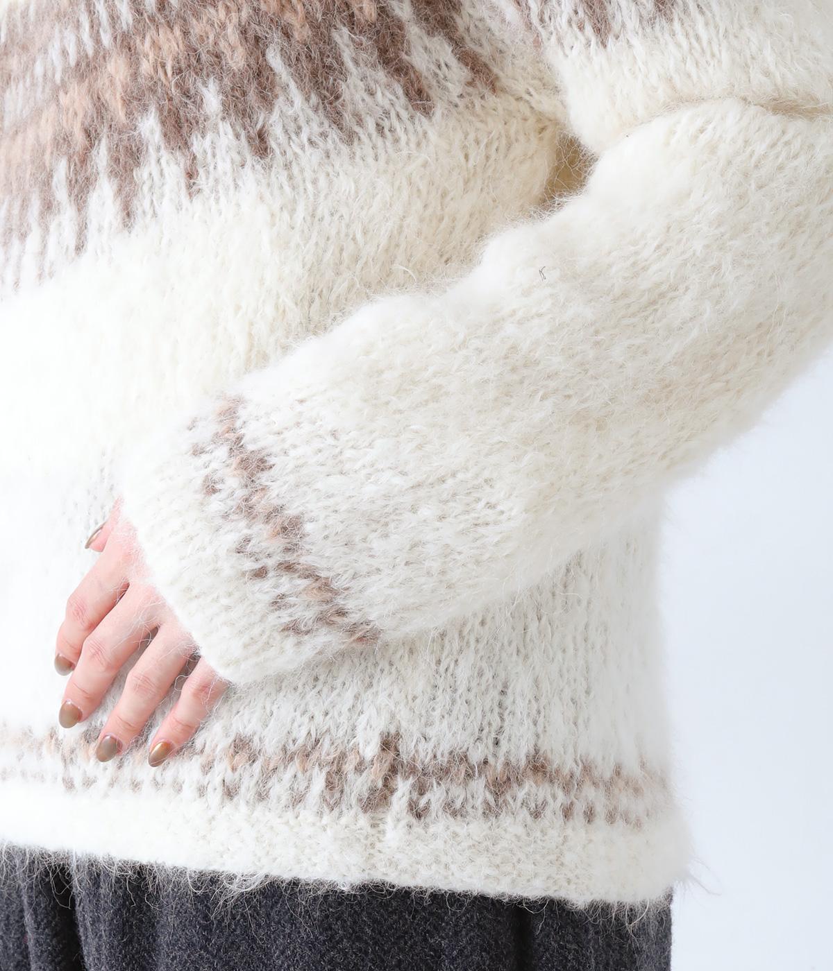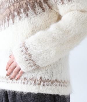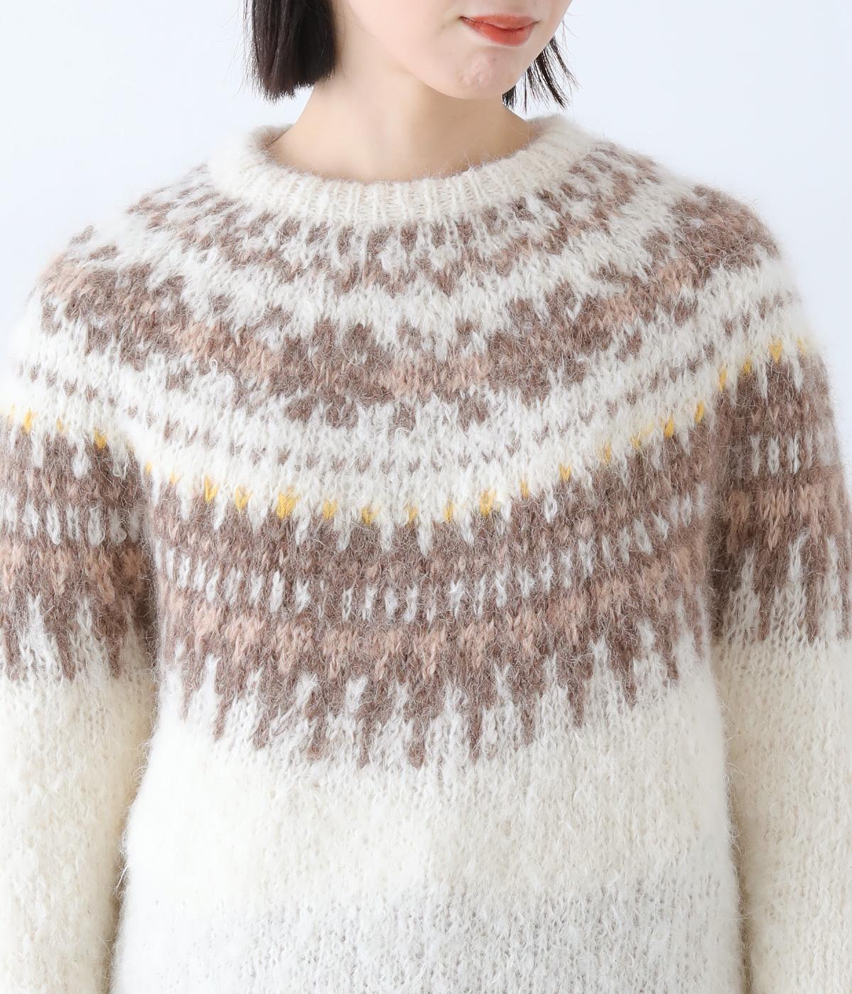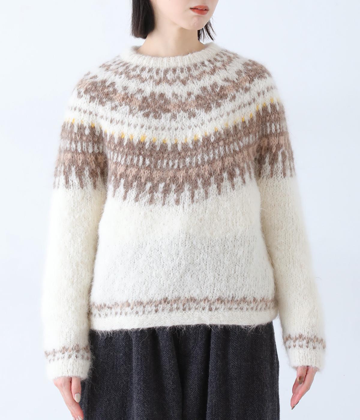 ネックラインを中心にぐるりと柄をあしらった、ノスタルジックなムード漂う求心編みニット。どこから見ても柄が映える華やかさがありつつ、肩まわりをすっきりと見せてくれます。一枚であたたかく着映えが叶う、寒い時期に頼れるアイテムです。