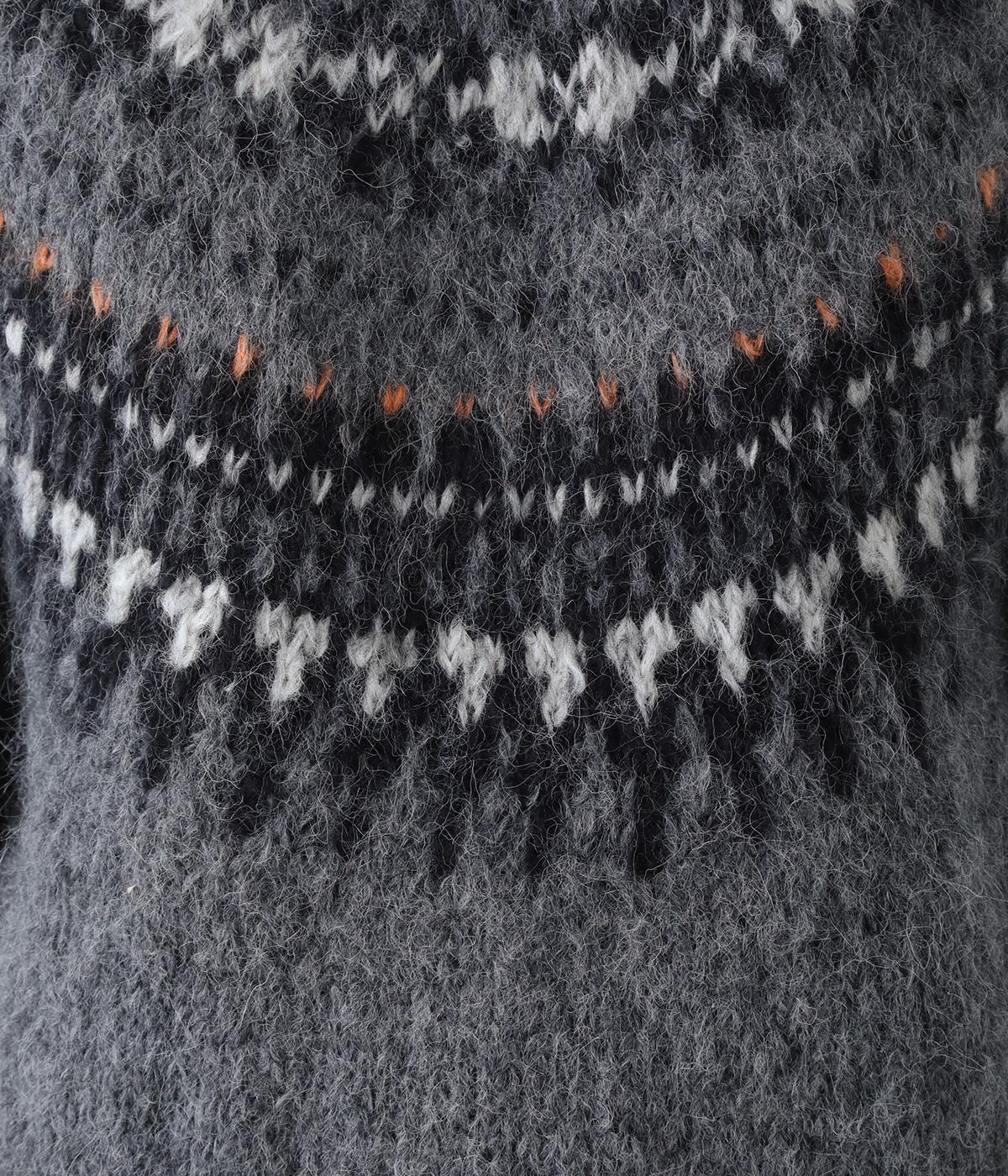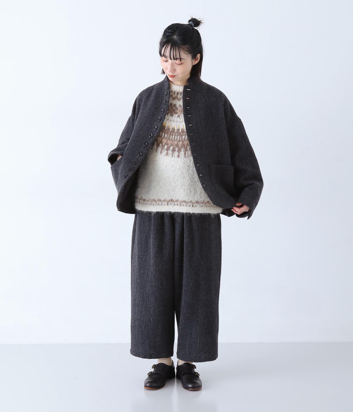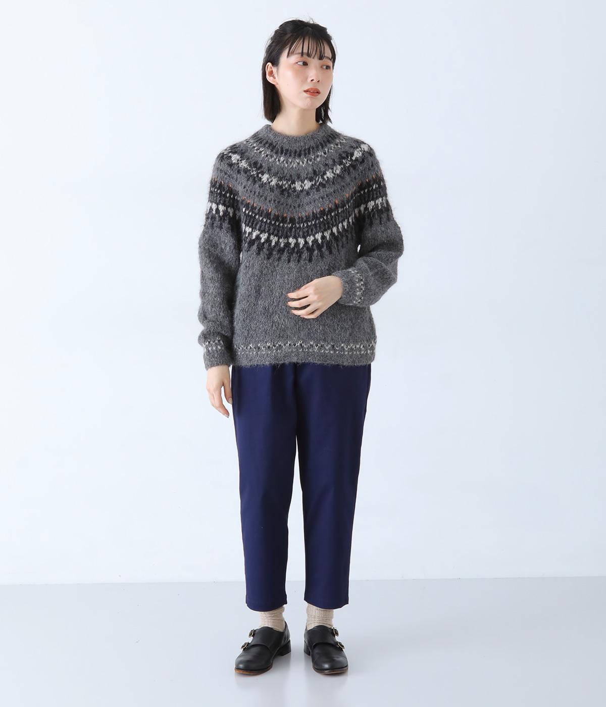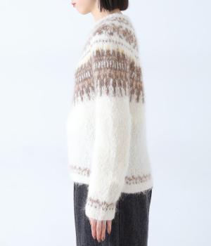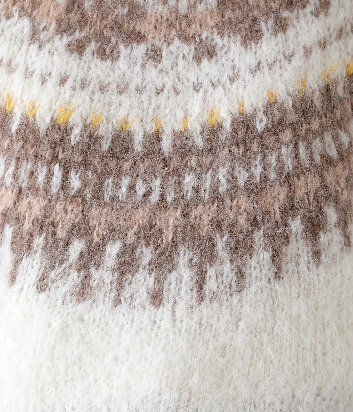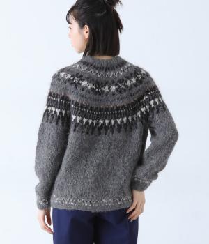 ネックラインを中心にぐるりと柄をあしらった、ノスタルジックなムード漂う求心編みニット。どこから見ても柄が映える華やかさがありつつ、肩まわりをすっきりと見せてくれます。一枚であたたかく着映えが叶う、寒い時期に頼れるアイテムです。