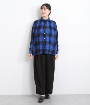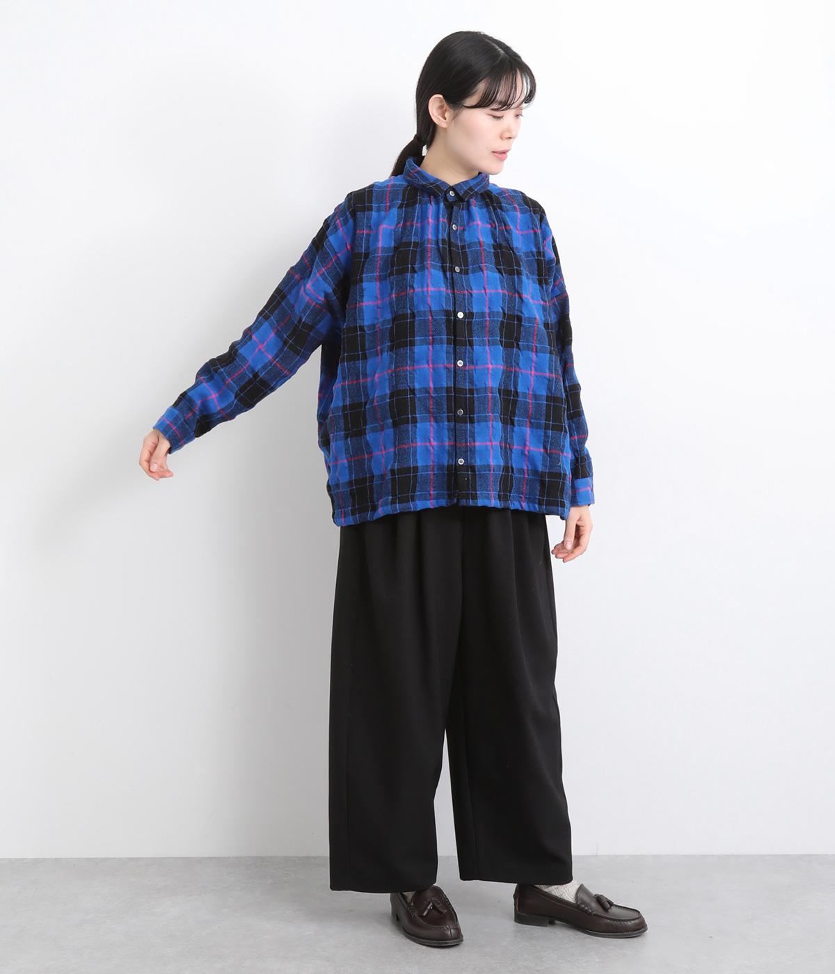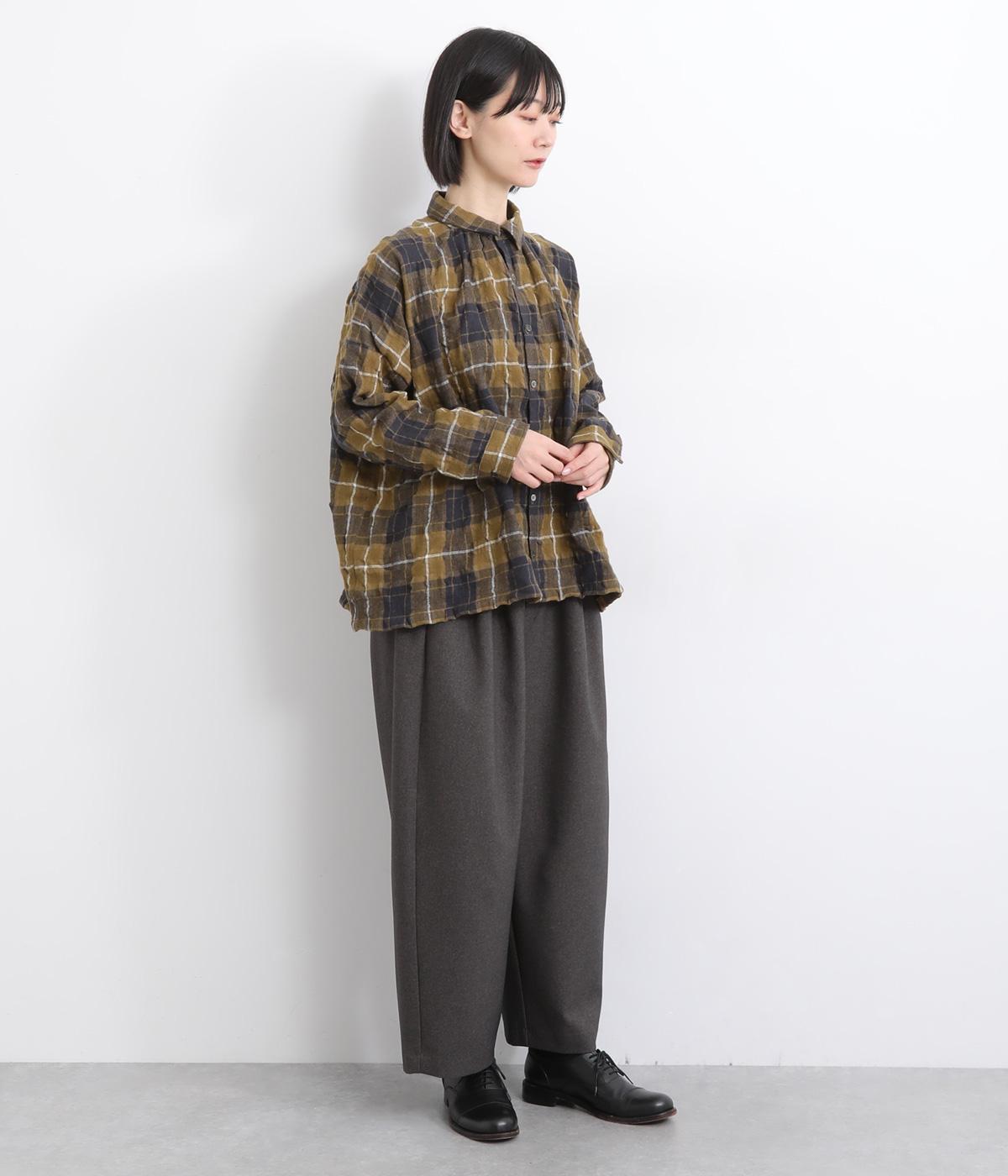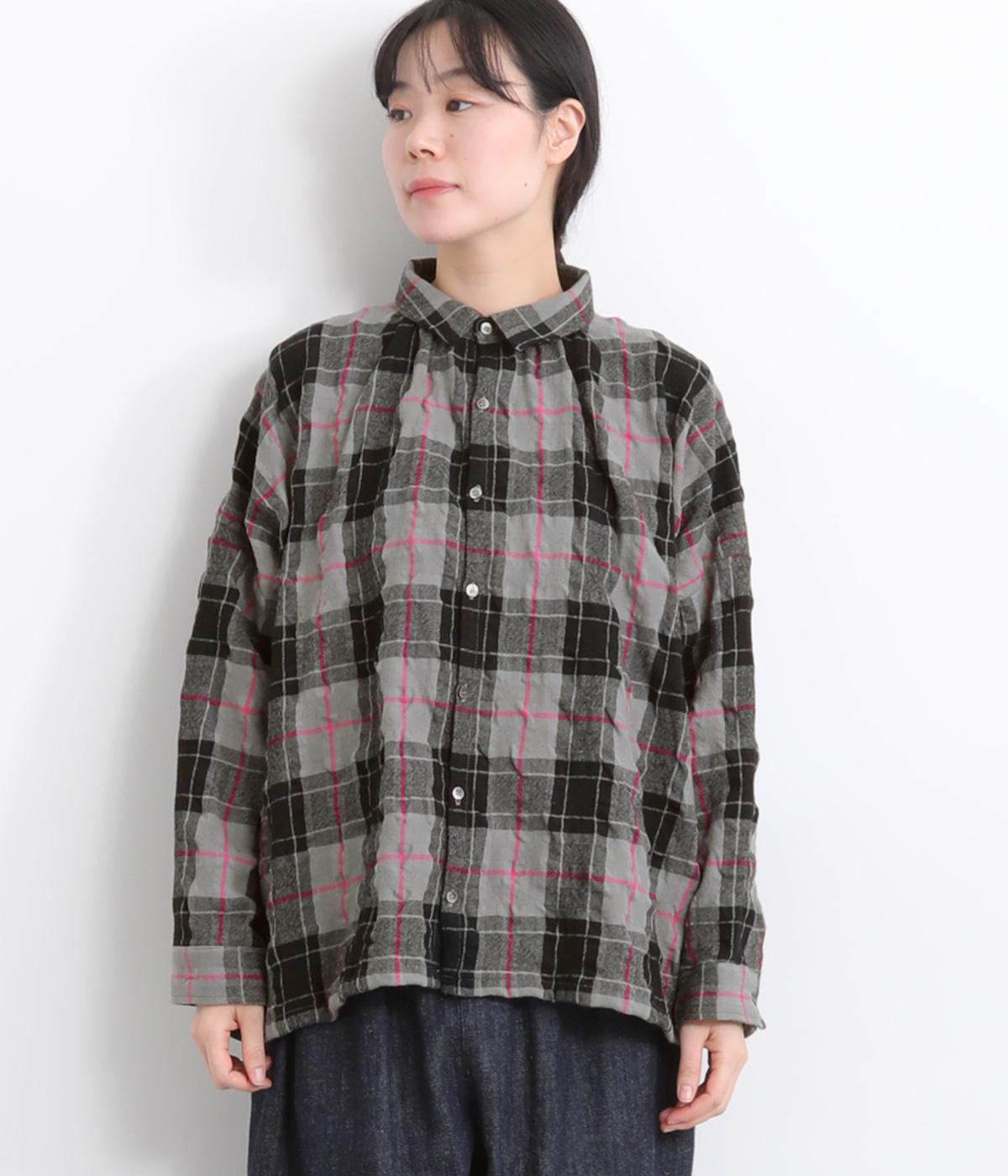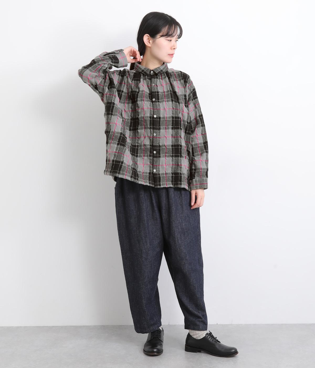 シンプルながら存在感のあるシャツ。落ち着いたチェック柄に自然な風合いが相まって大人カジュアルな雰囲気に仕上がりました。ゆったりしたリラックスシルエットに小さめの襟でバランスよく、さまざまなボトムスと好相性です。