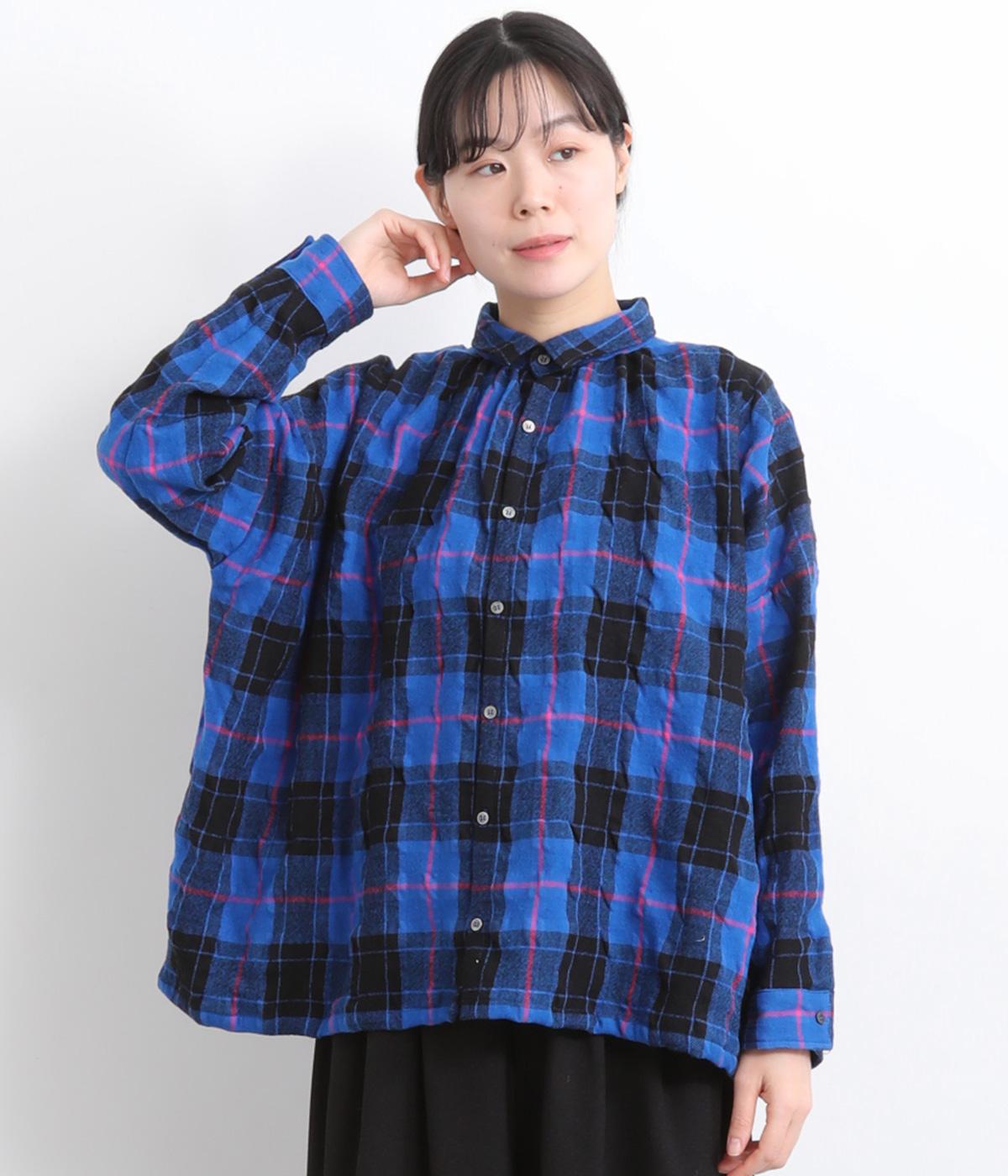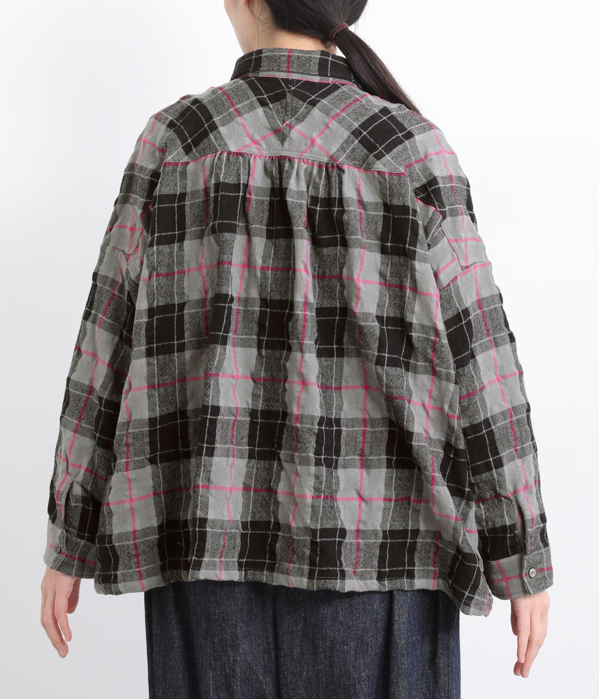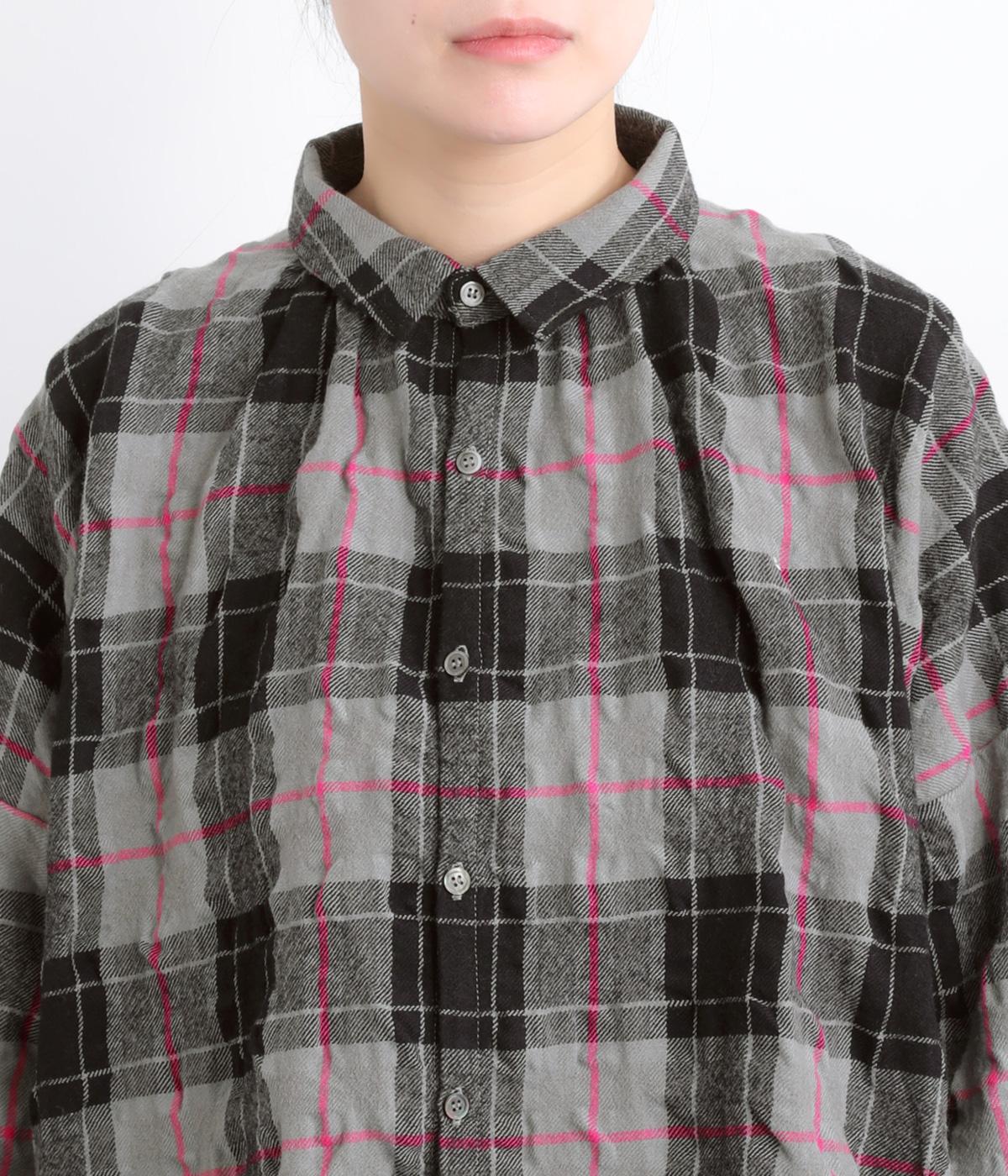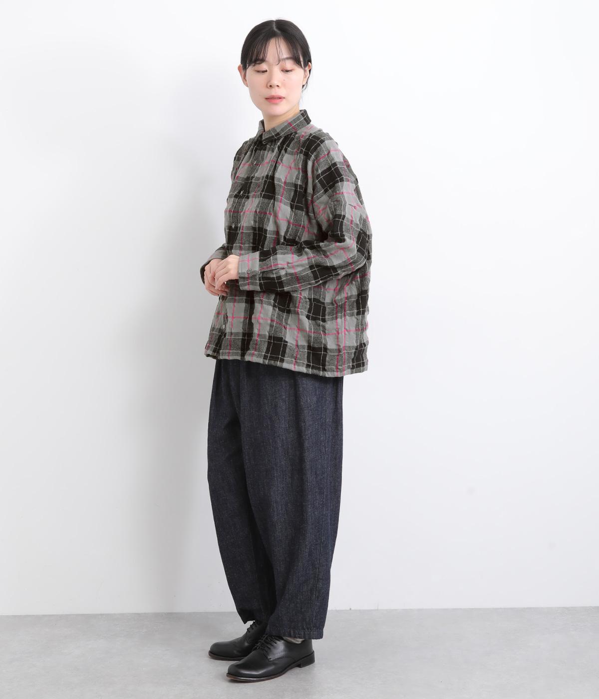 シンプルながら存在感のあるシャツ。落ち着いたチェック柄に自然な風合いが相まって大人カジュアルな雰囲気に仕上がりました。ゆったりしたリラックスシルエットに小さめの襟でバランスよく、さまざまなボトムスと好相性です。
