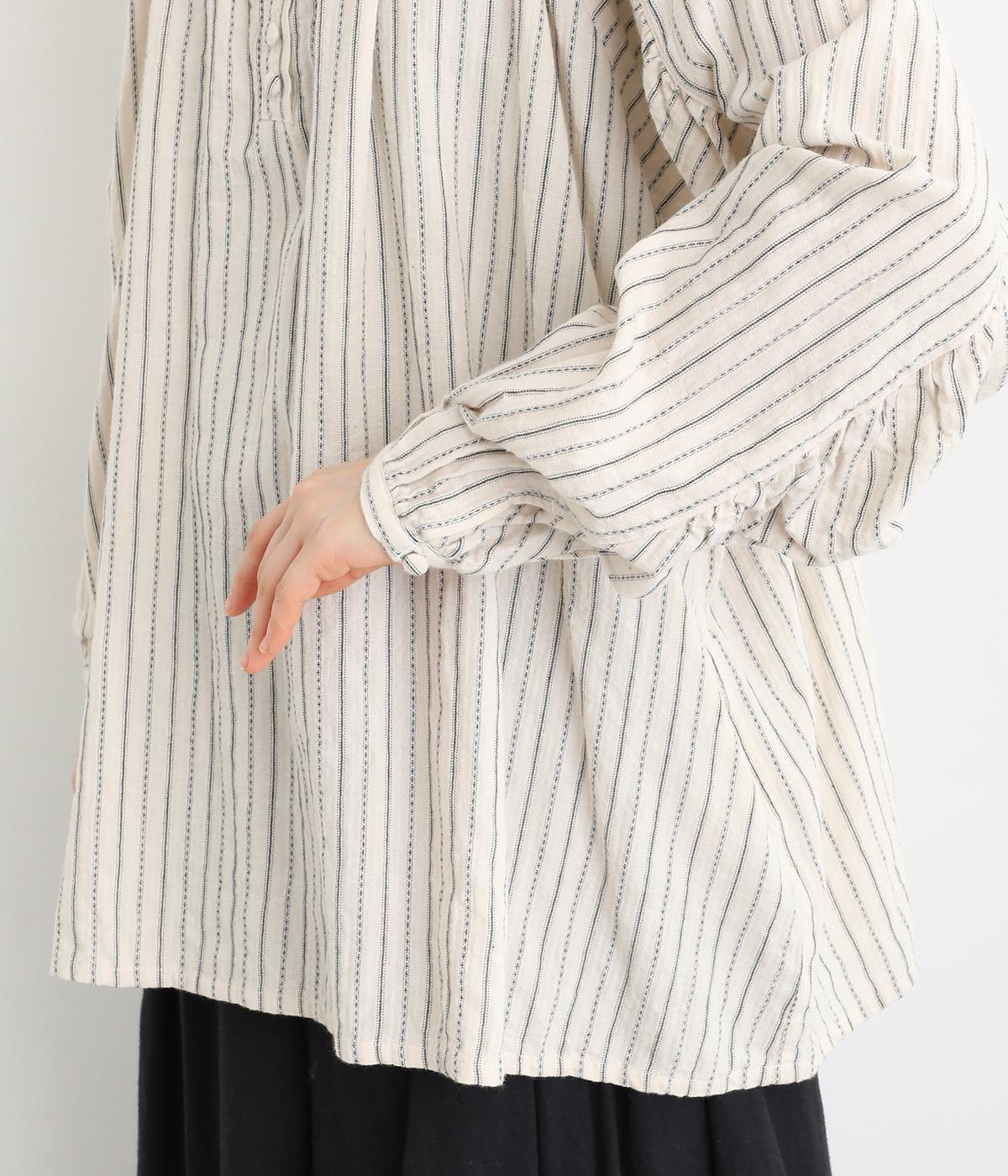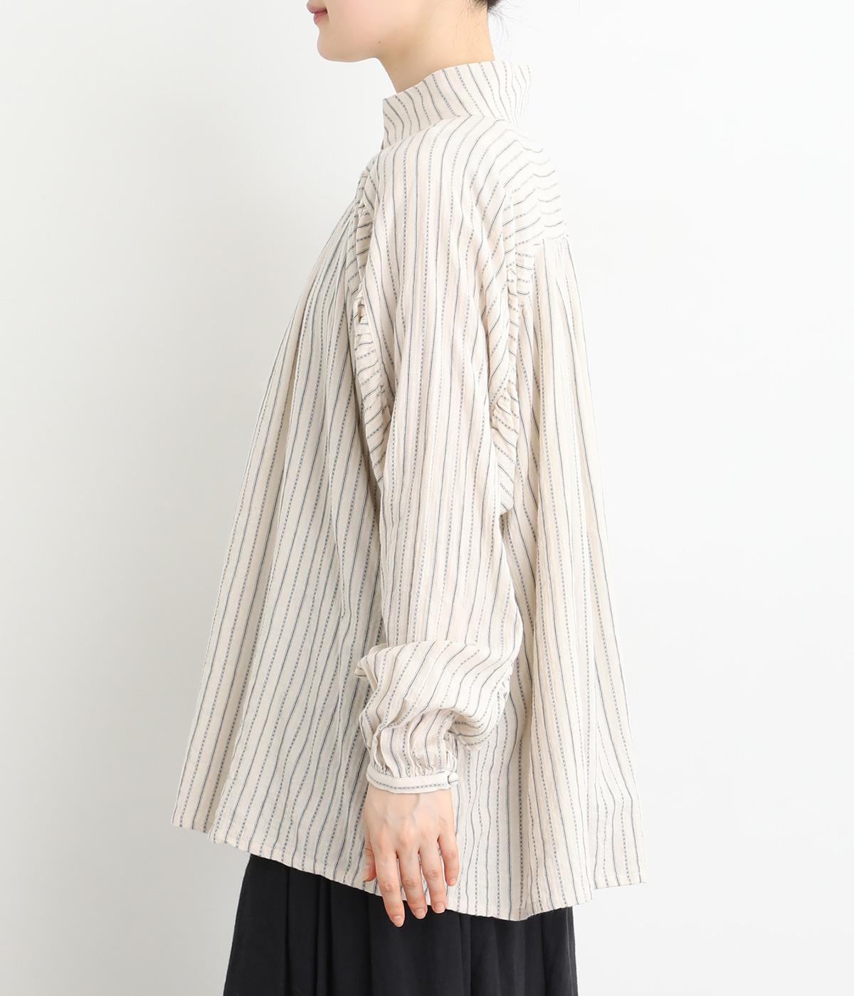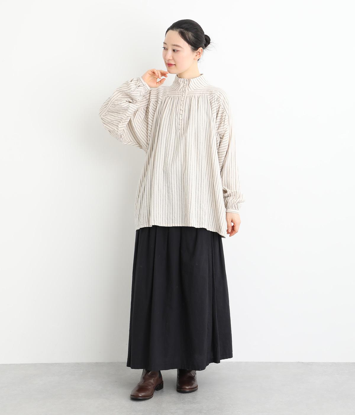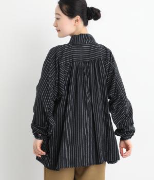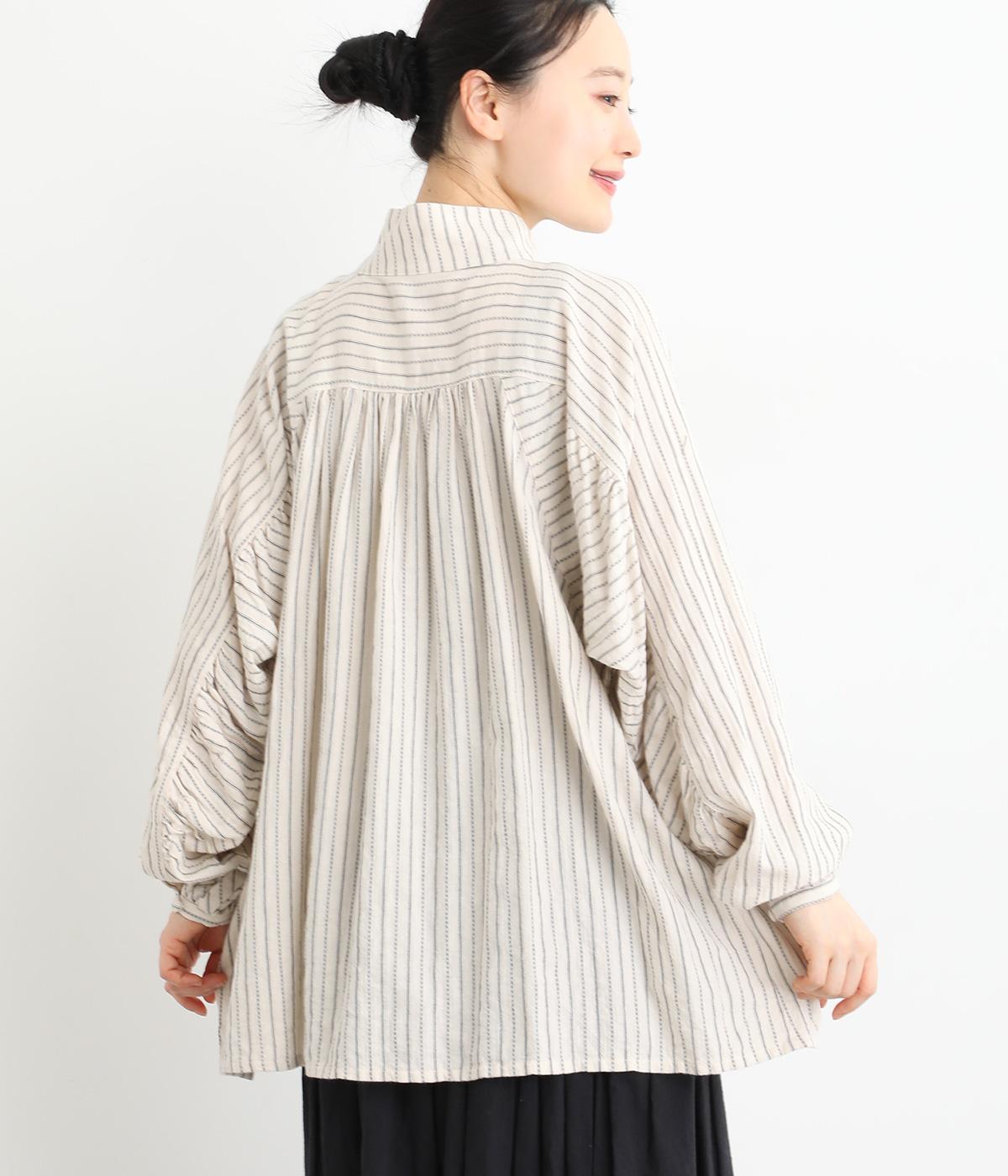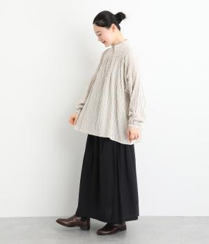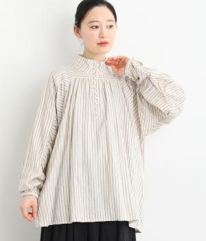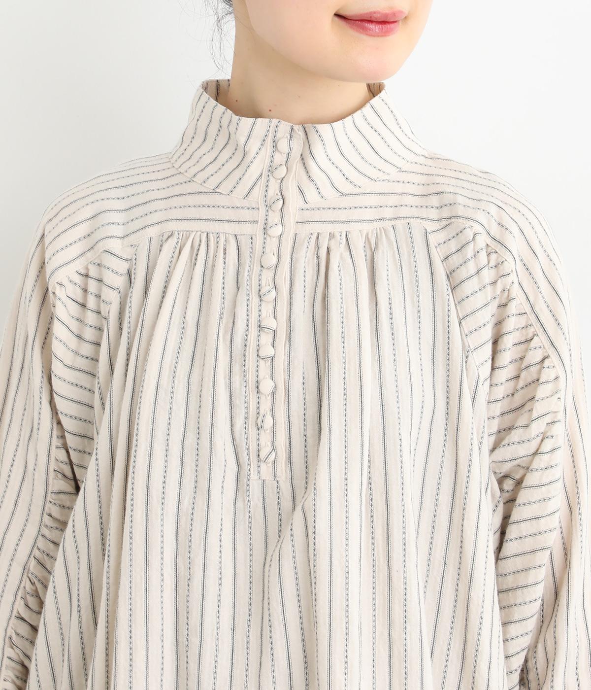 ナチュラルな雰囲気のなかに、クラシカルなムードを添えるストライプシャツ。高めのネックはボタンをはずして襟のように折ってもかわいく、着こなしに変化をつけられます。袖口や身頃にはシャーリングを施し、ほどよいボリュームと表情のあるシルエットに。フロントにならべた、小さなくるみボタンがアクセントです。