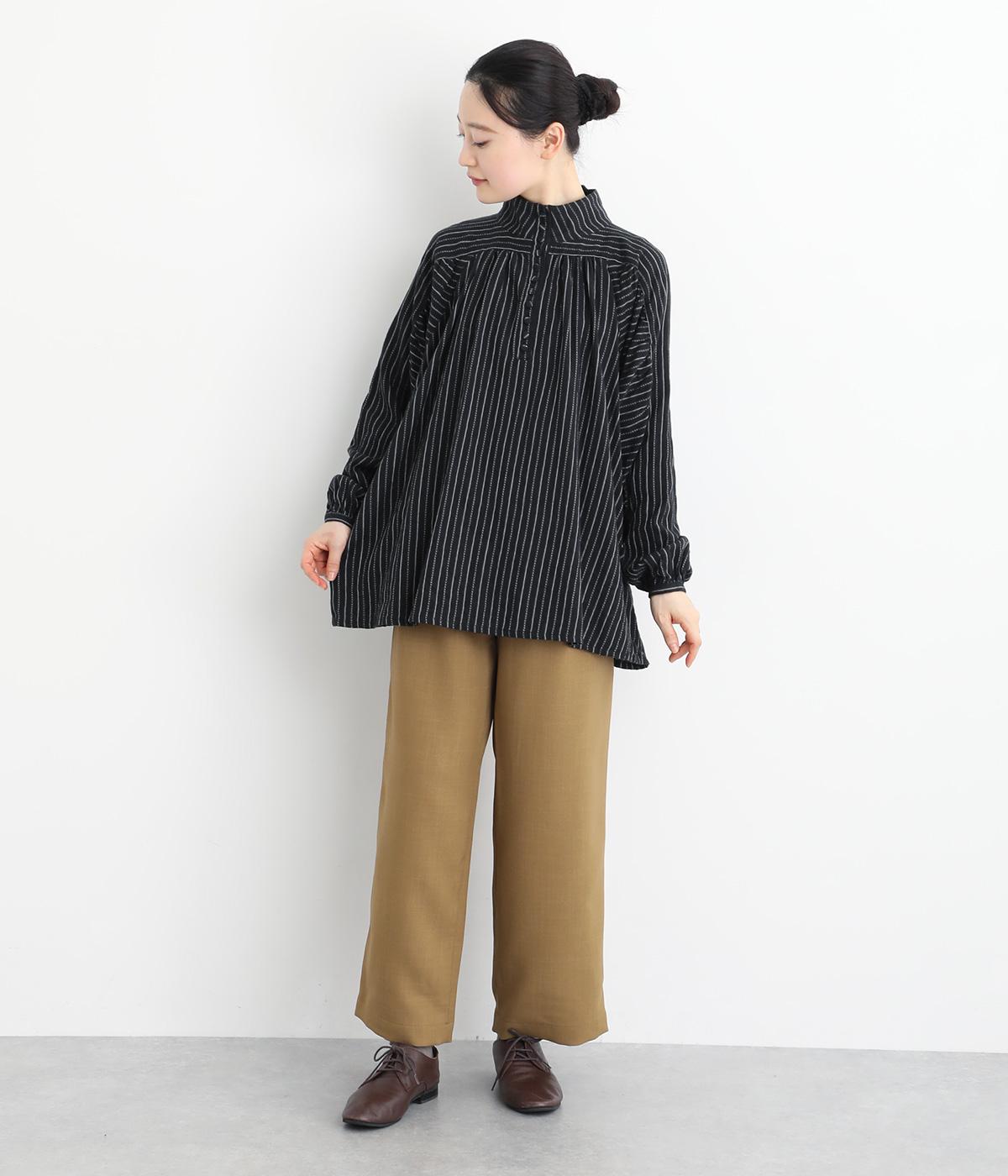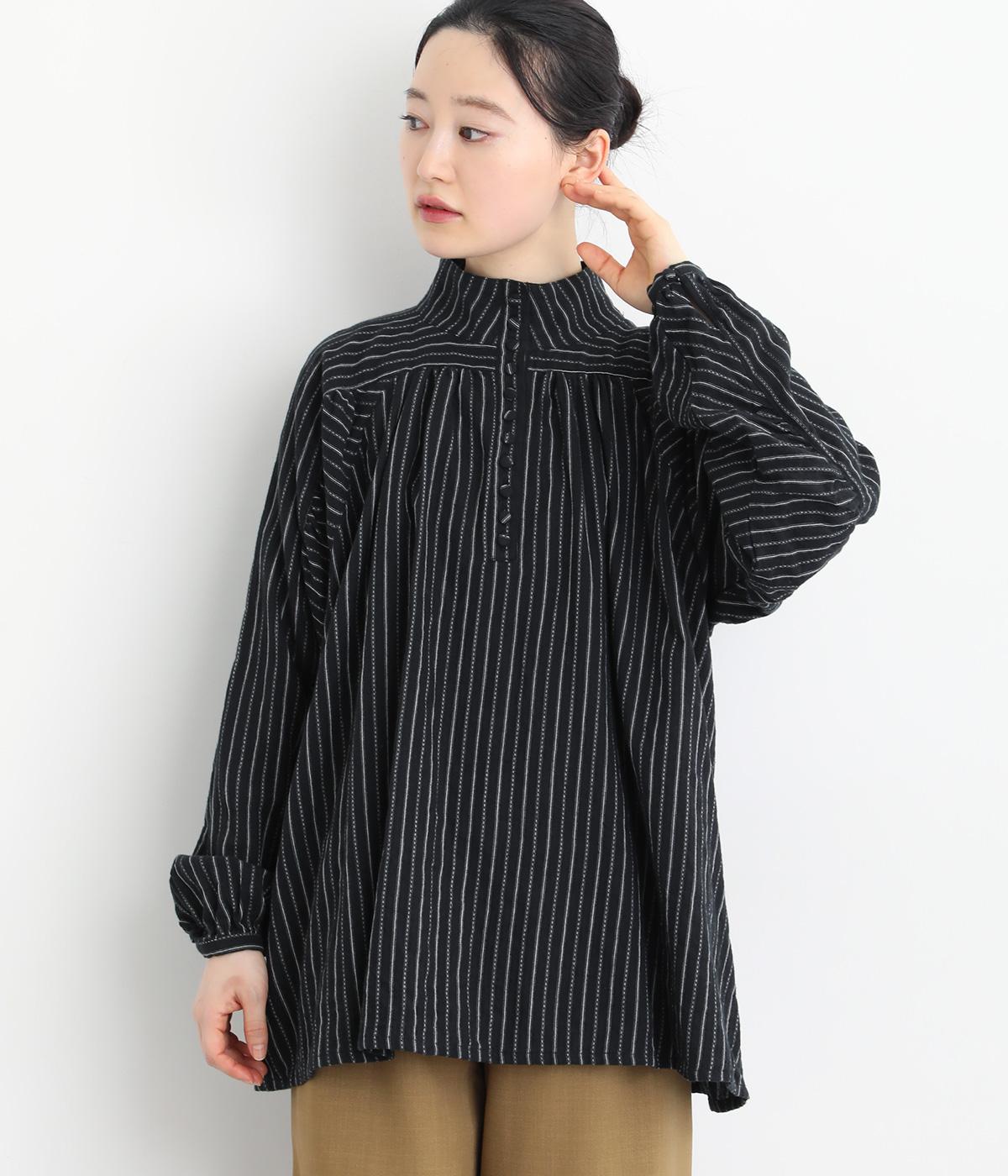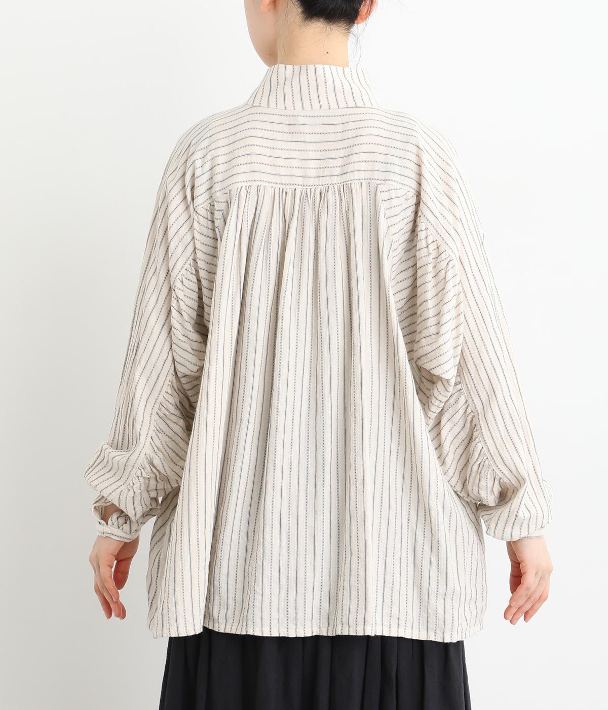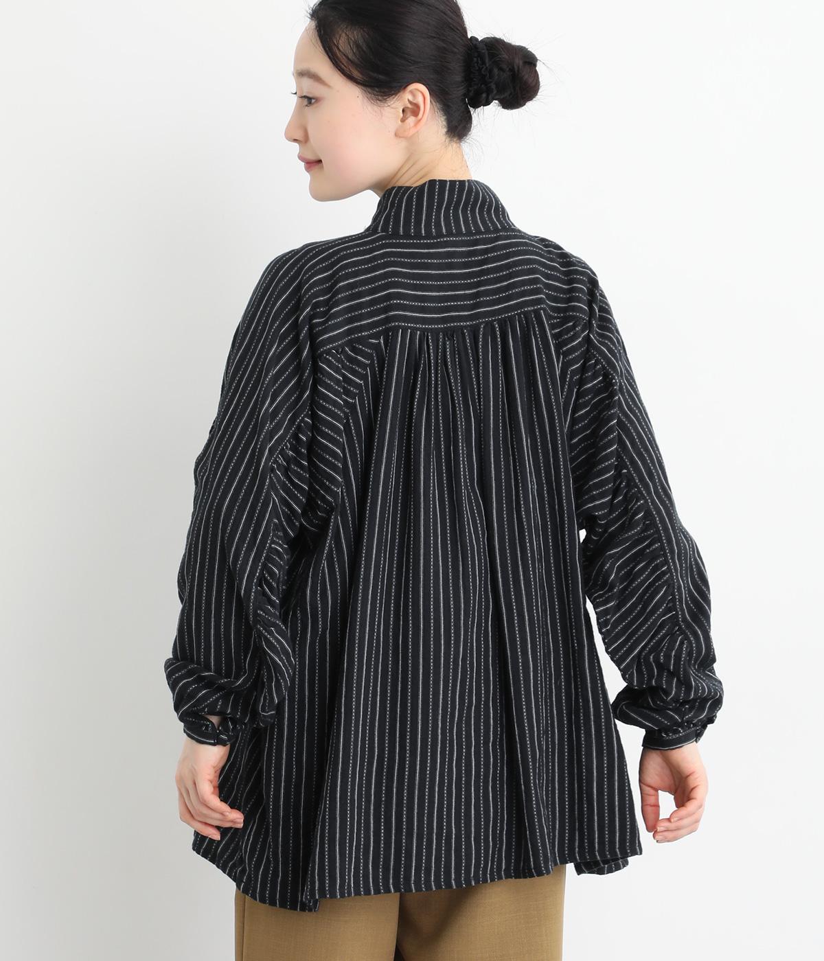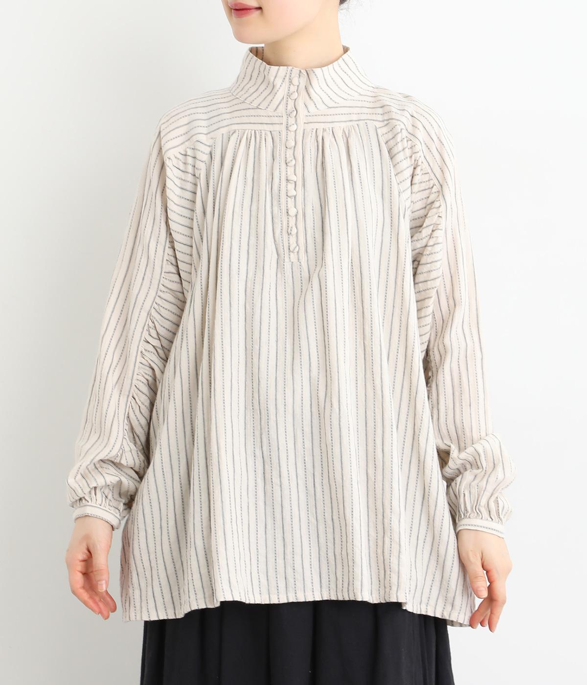 ナチュラルな雰囲気のなかに、クラシカルなムードを添えるストライプシャツ。高めのネックはボタンをはずして襟のように折ってもかわいく、着こなしに変化をつけられます。袖口や身頃にはシャーリングを施し、ほどよいボリュームと表情のあるシルエットに。フロントにならべた、小さなくるみボタンがアクセントです。