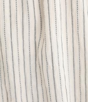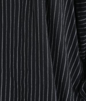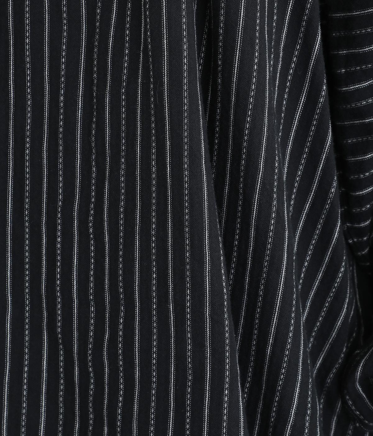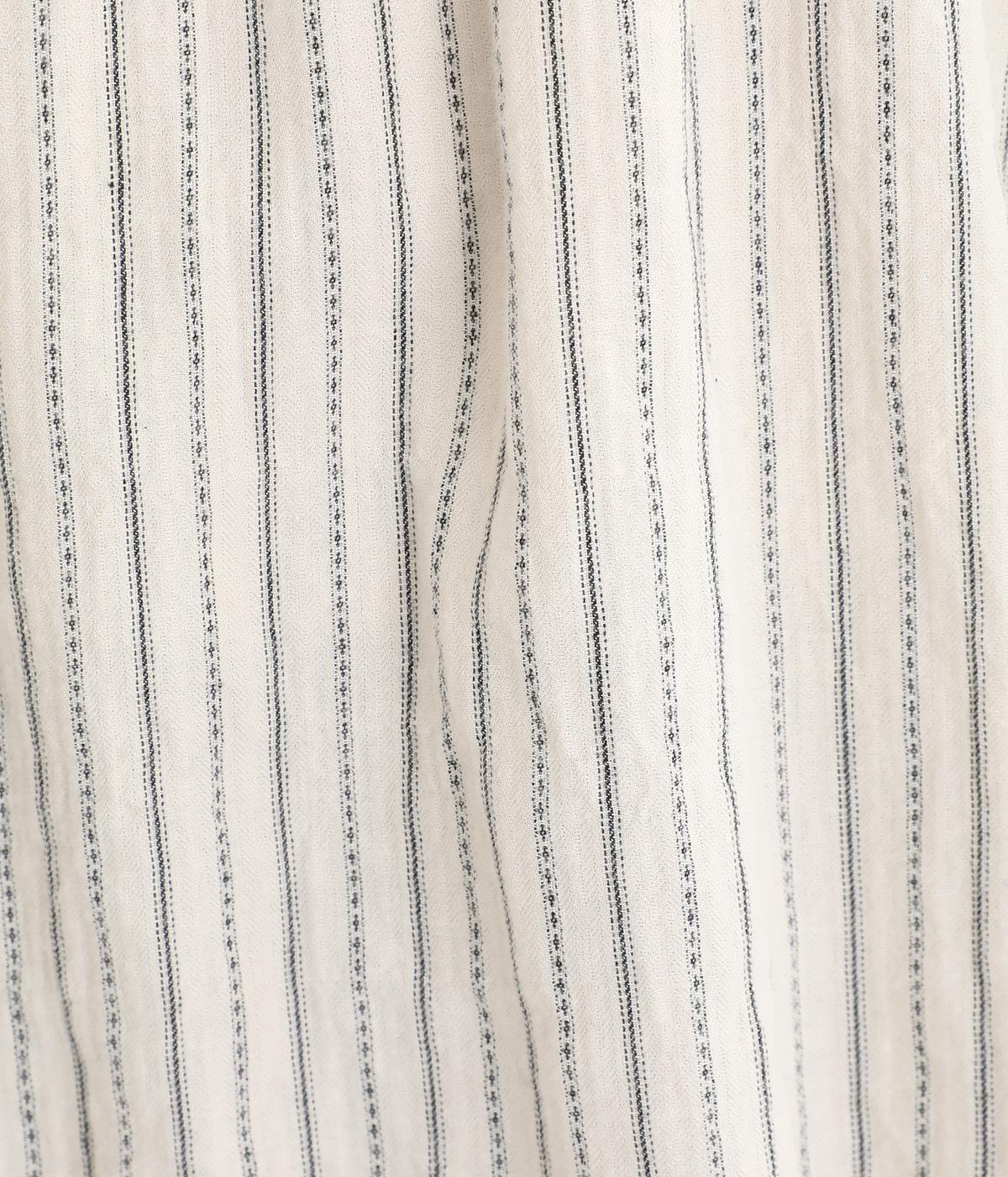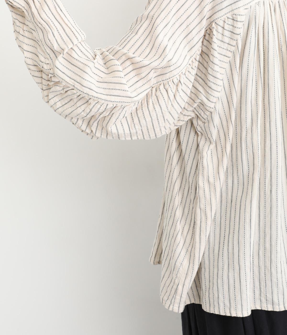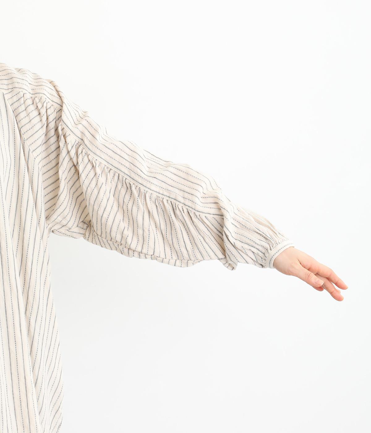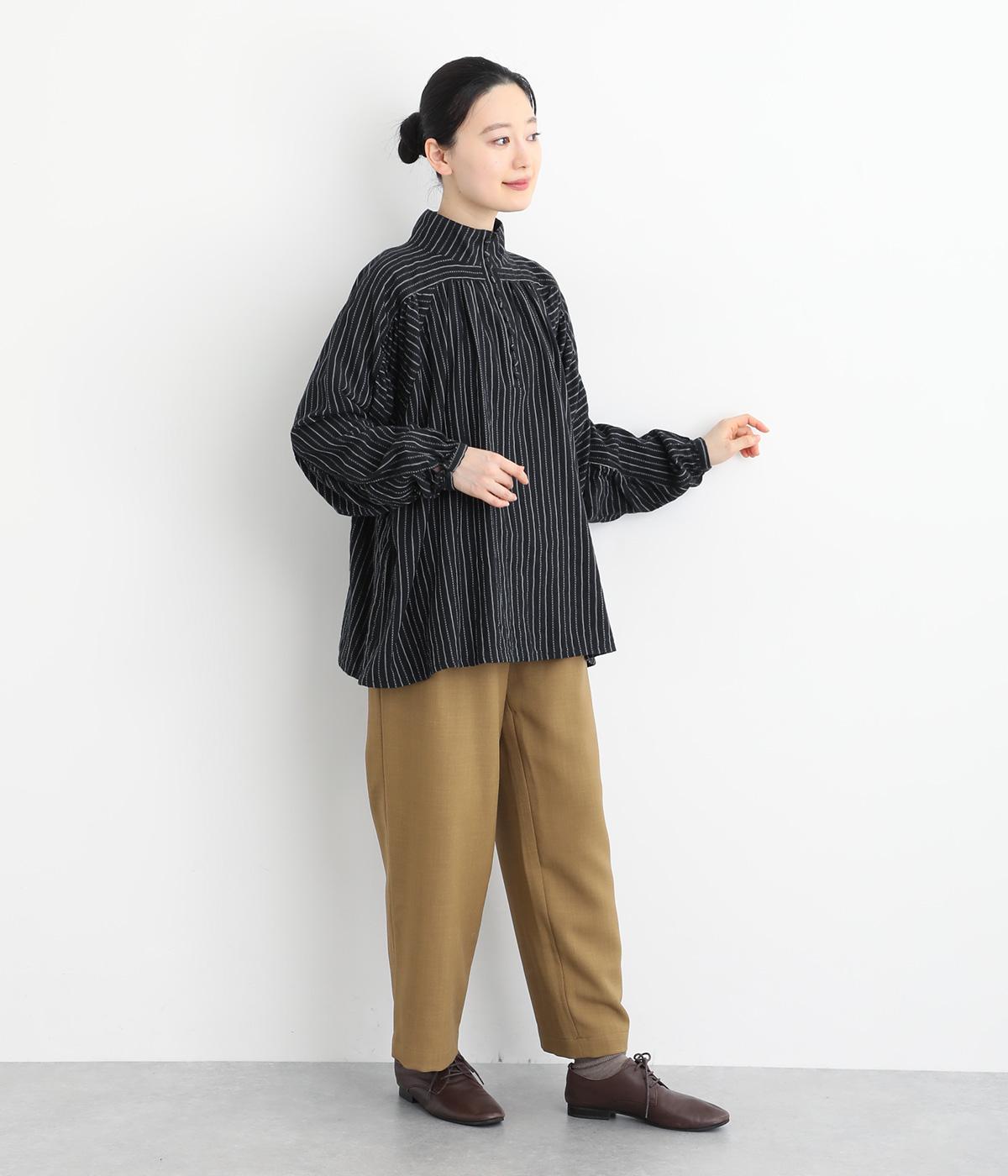 ナチュラルな雰囲気のなかに、クラシカルなムードを添えるストライプシャツ。高めのネックはボタンをはずして襟のように折ってもかわいく、着こなしに変化をつけられます。袖口や身頃にはシャーリングを施し、ほどよいボリュームと表情のあるシルエットに。フロントにならべた、小さなくるみボタンがアクセントです。