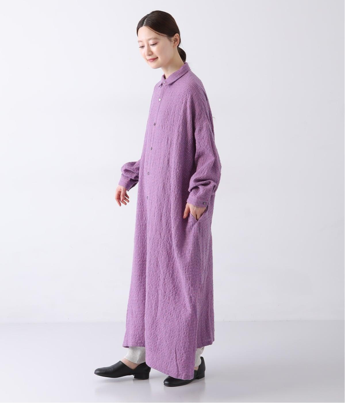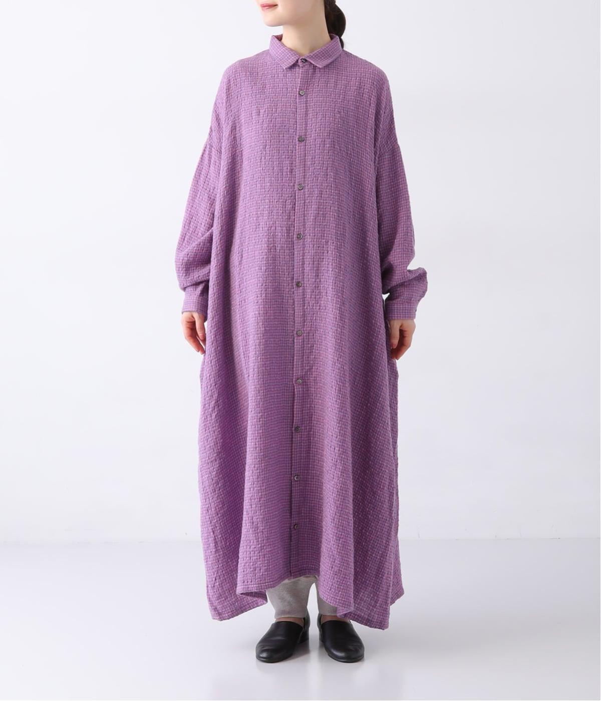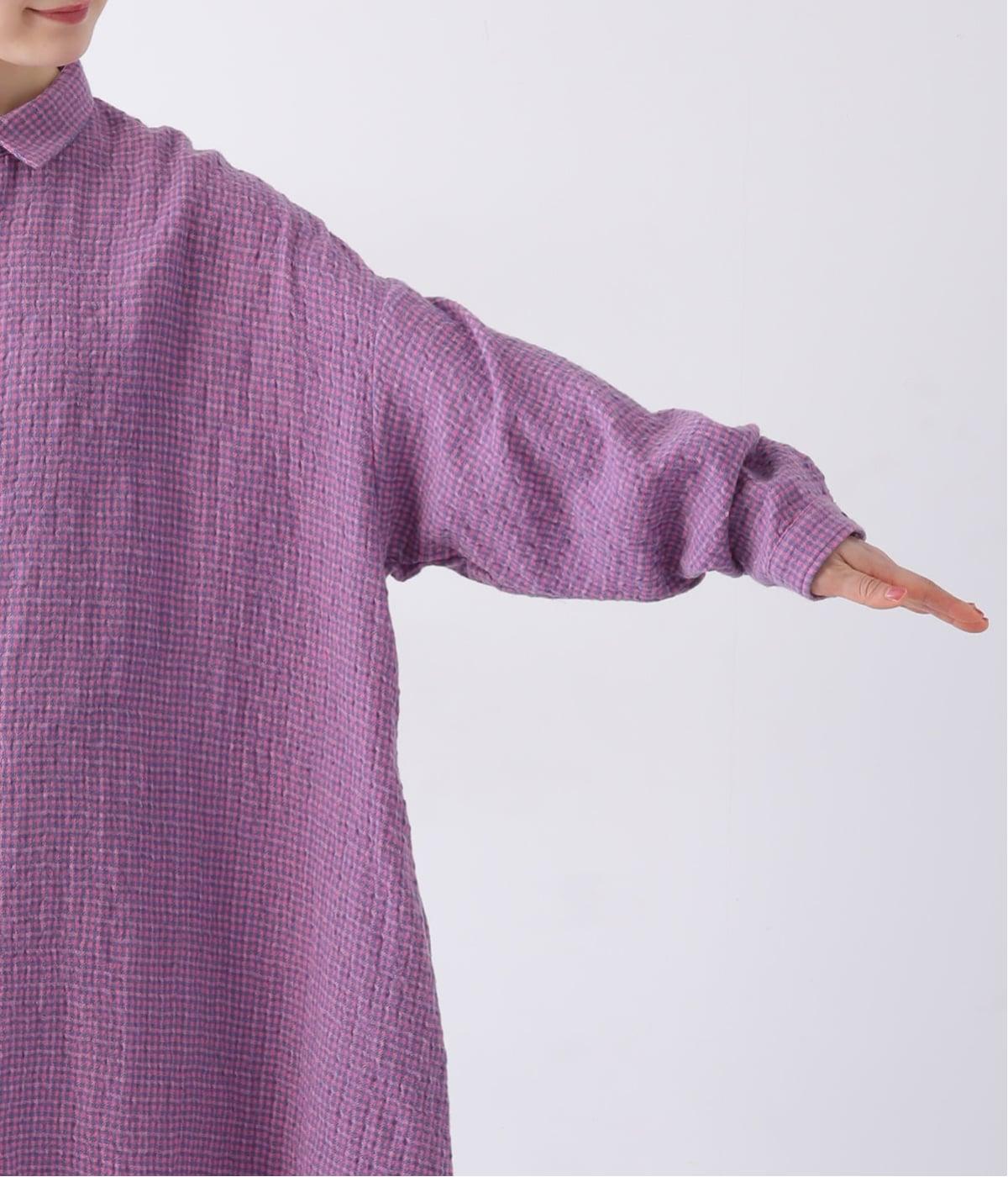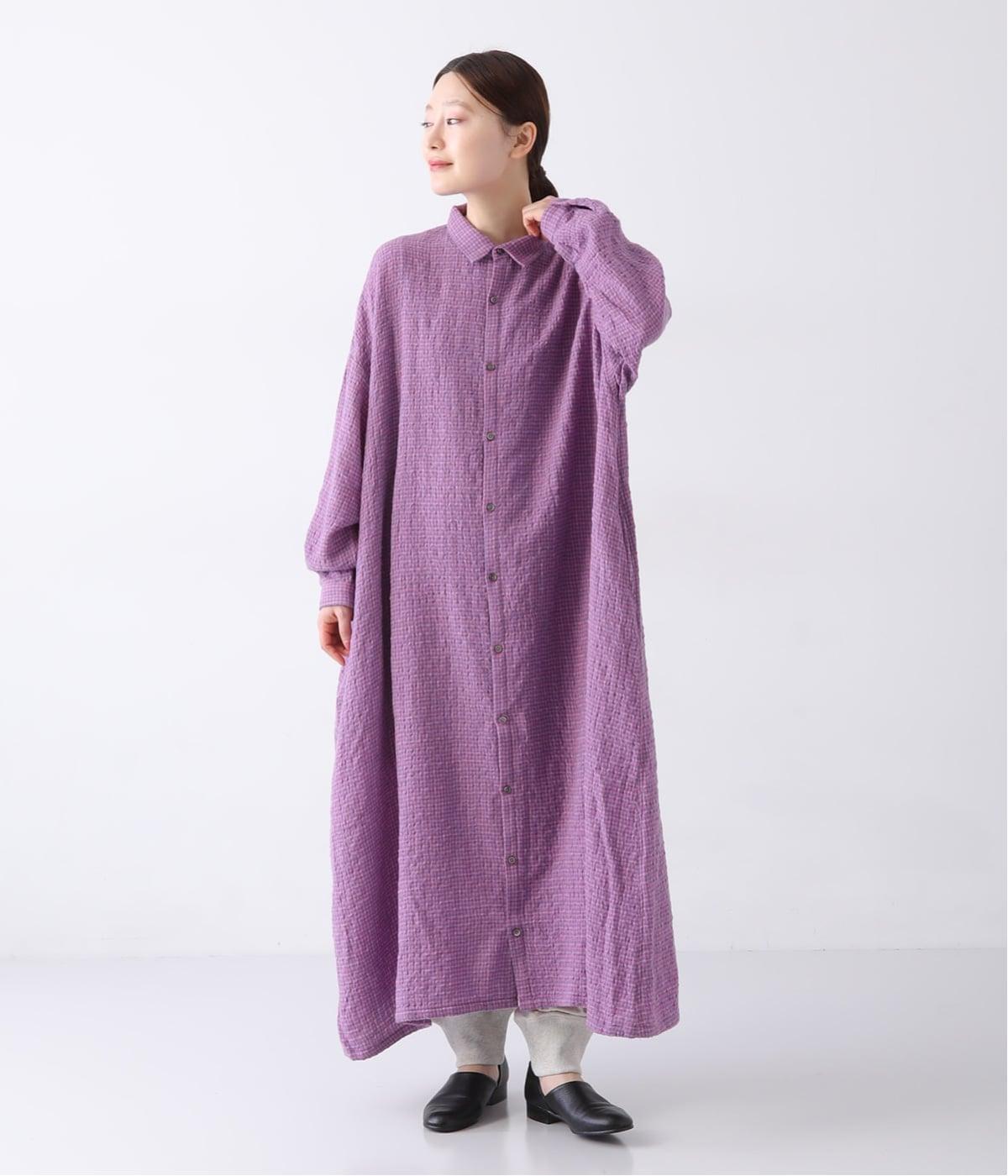 体が泳ぐゆったりとしたサイズ感に仕上げたシャツワンピース。細かなチェック柄と独特な生地の表情が、コーディネートに奥行きを与えてくれます。一枚着はもちろん、パンツとのレイヤードスタイルもおすすめです。