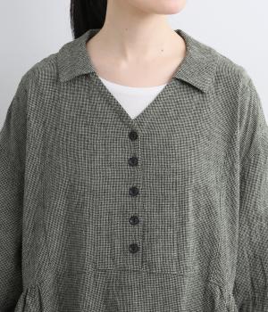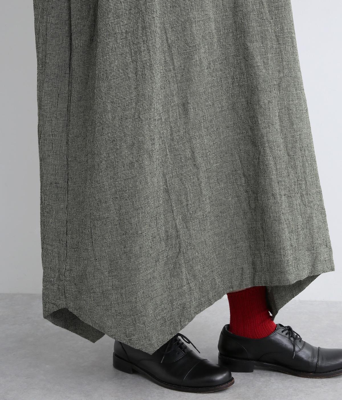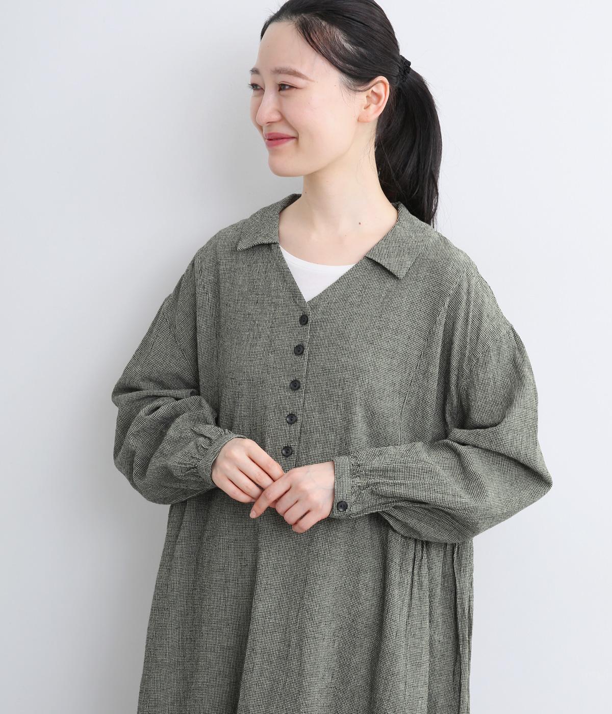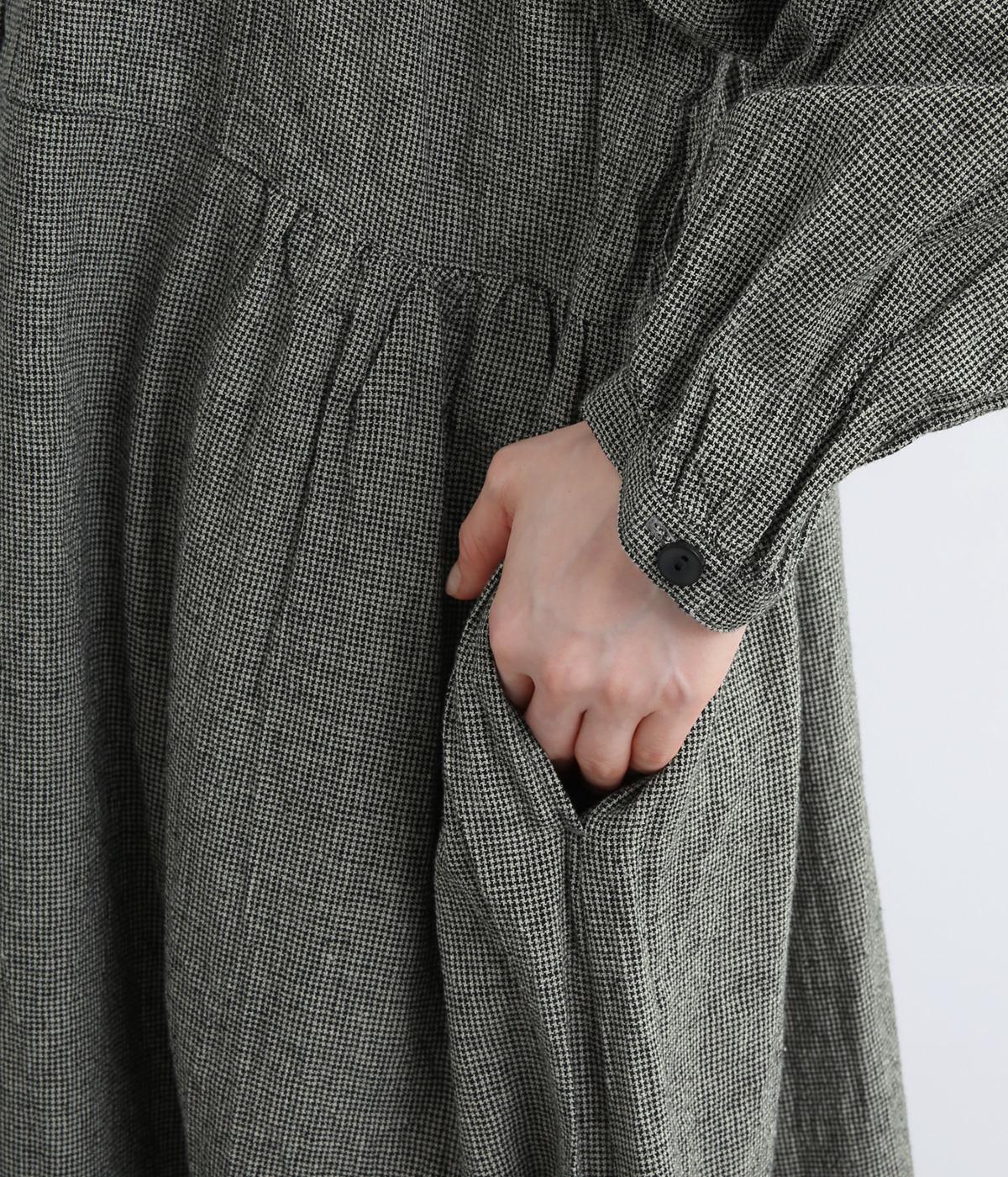 シボ感のあるナチュラルな雰囲気の素材感。さらりとドライな手ざわりとほどよいハリが特徴です。千鳥格子の柄がクラシカルで落ち着いた印象の生地です。