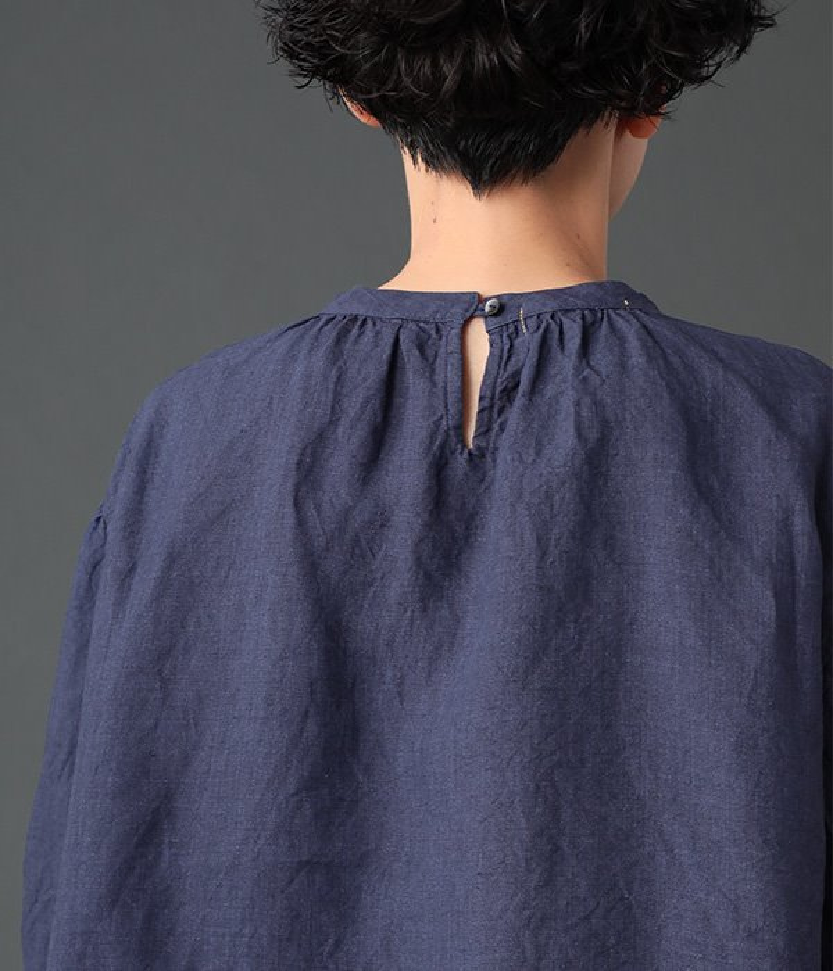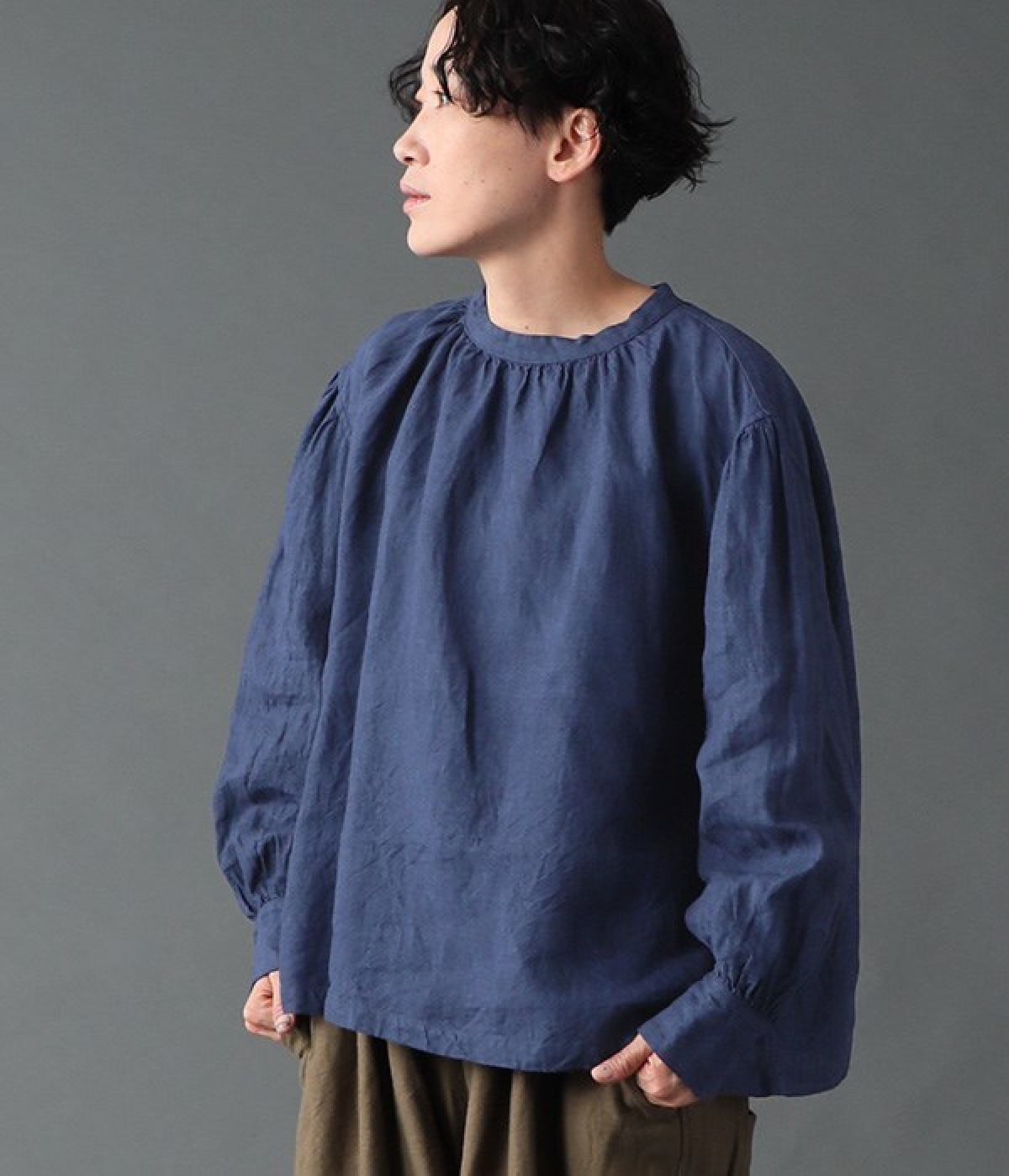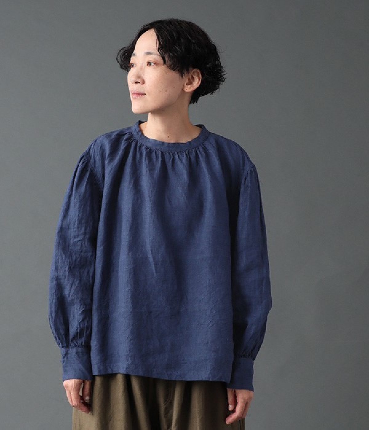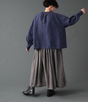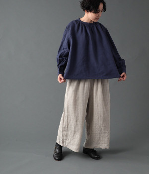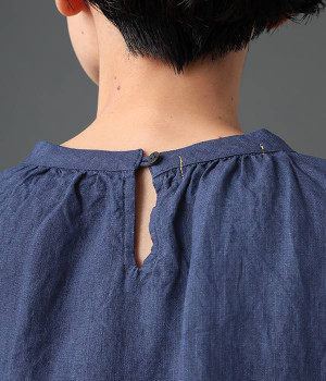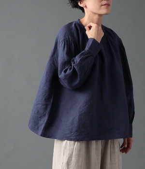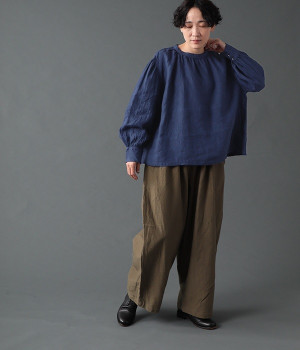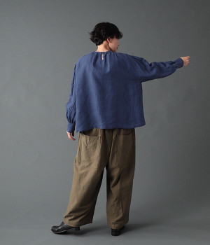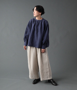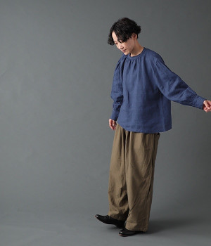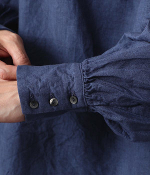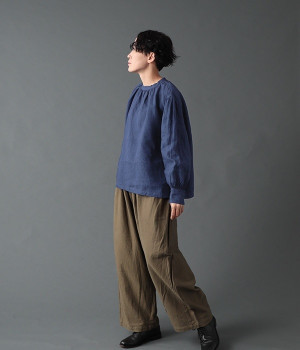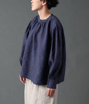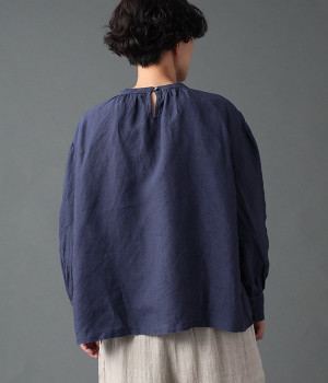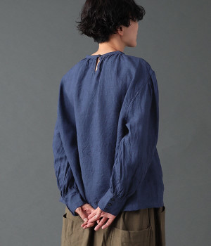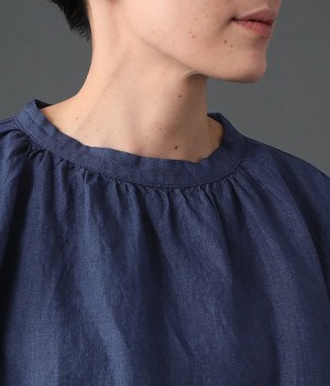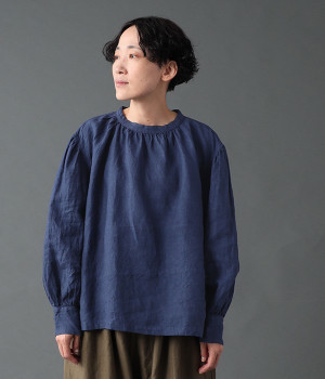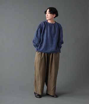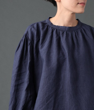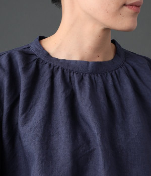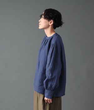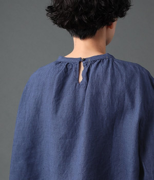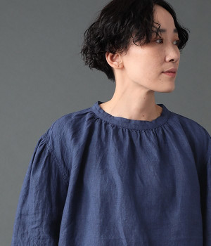 上質なリネンを使用したプルオーバーです。インディゴ染めならではの深い色合いが美しく、着れば着るほどにやわらかくなじみ愛着が増していきます。袖口カフスのブラウスのようなディテールで、カジュアルな雰囲気と品のよさを両立。襟ぐりや袖にきかせたギャザーが、ふわりとしたシルエットを描きます。パンツにもスカートにもバランスがよく、合わせるボトムを選ばない万能なアイテムです。