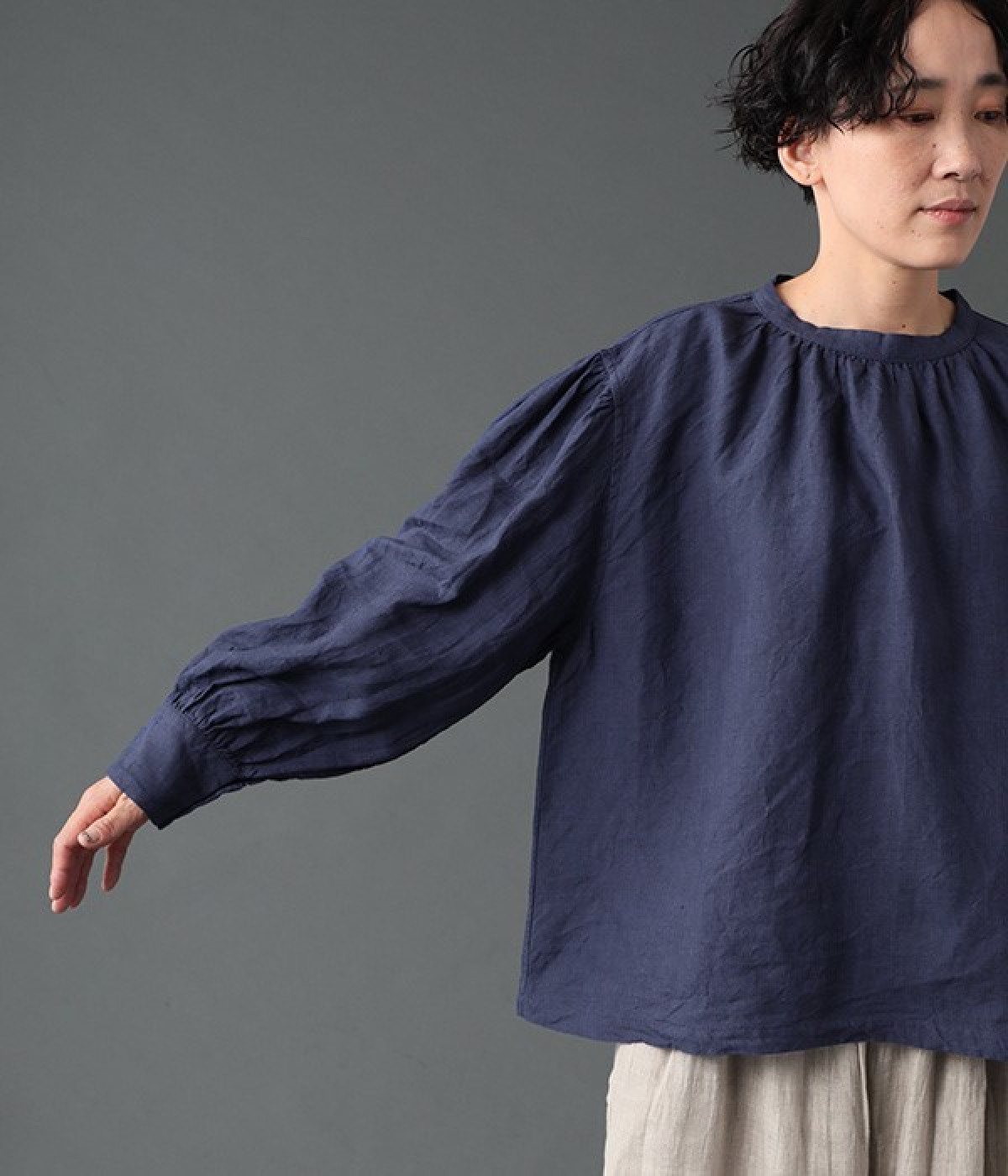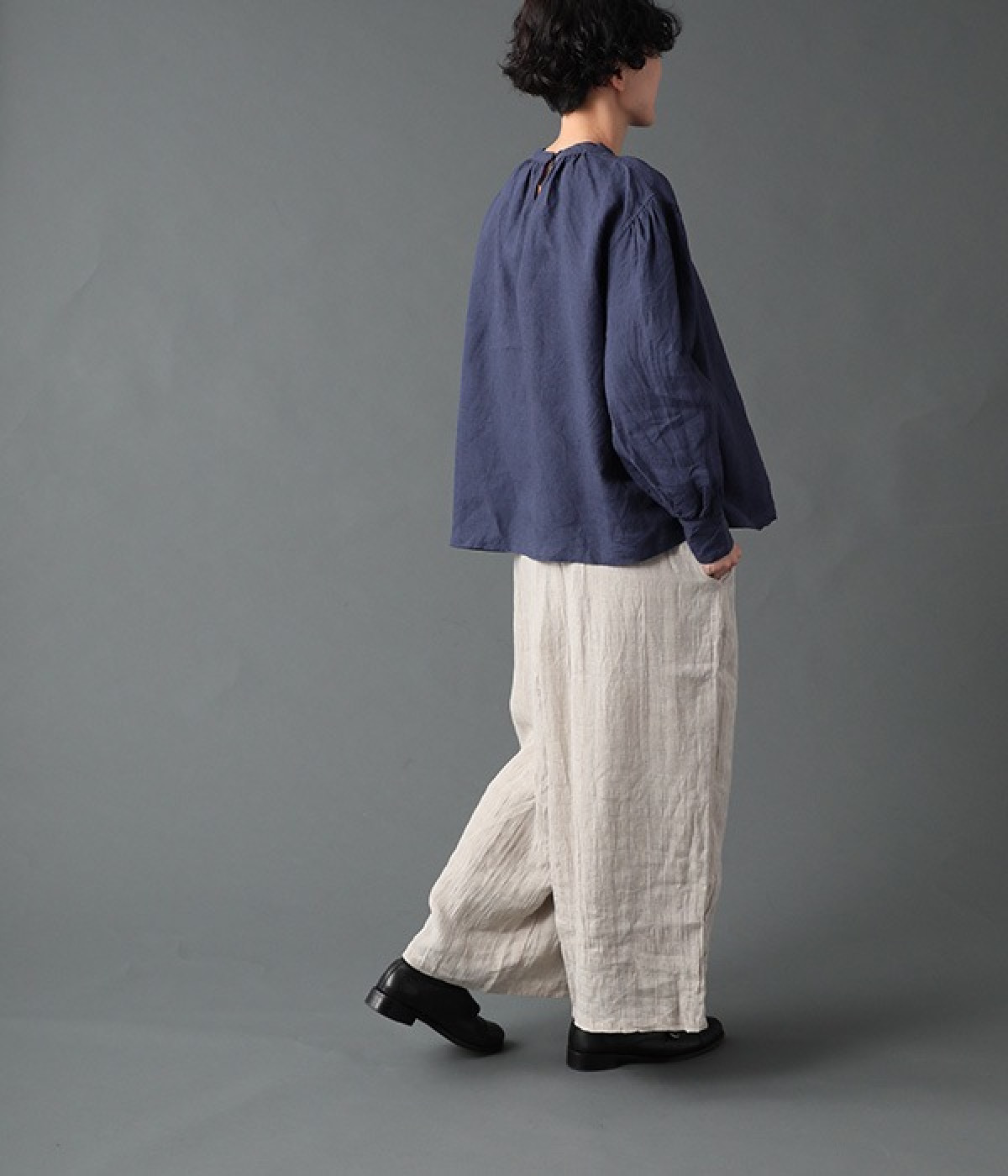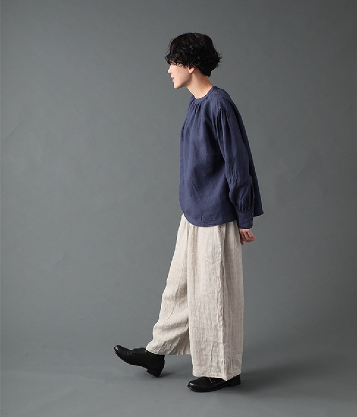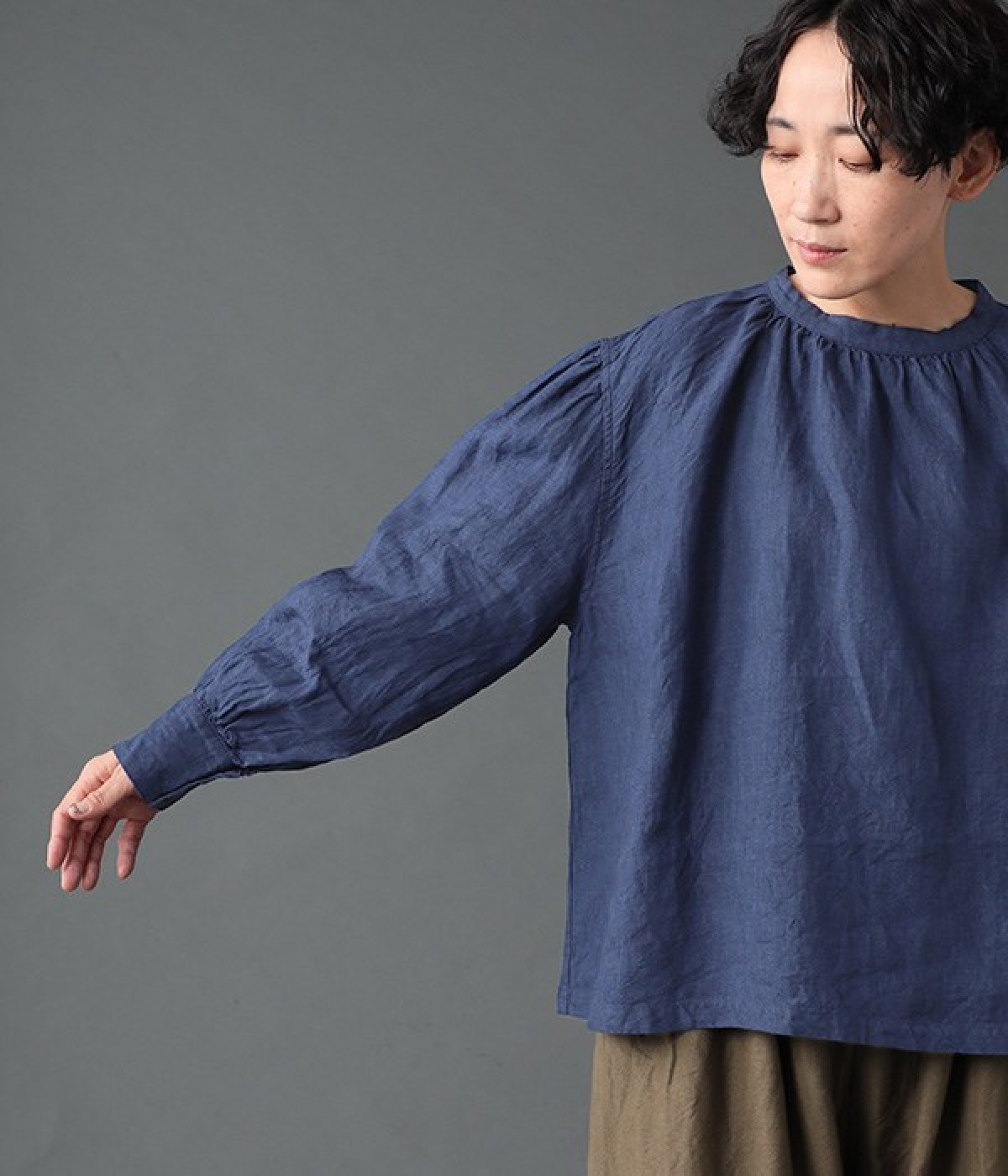 上質なリネンを使用したプルオーバーです。インディゴ染めならではの深い色合いが美しく、着れば着るほどにやわらかくなじみ愛着が増していきます。袖口カフスのブラウスのようなディテールで、カジュアルな雰囲気と品のよさを両立。襟ぐりや袖にきかせたギャザーが、ふわりとしたシルエットを描きます。パンツにもスカートにもバランスがよく、合わせるボトムを選ばない万能なアイテムです。