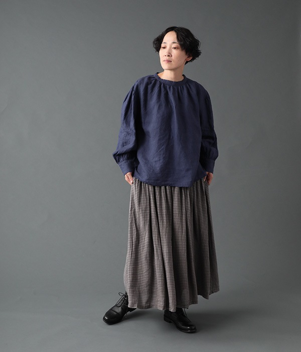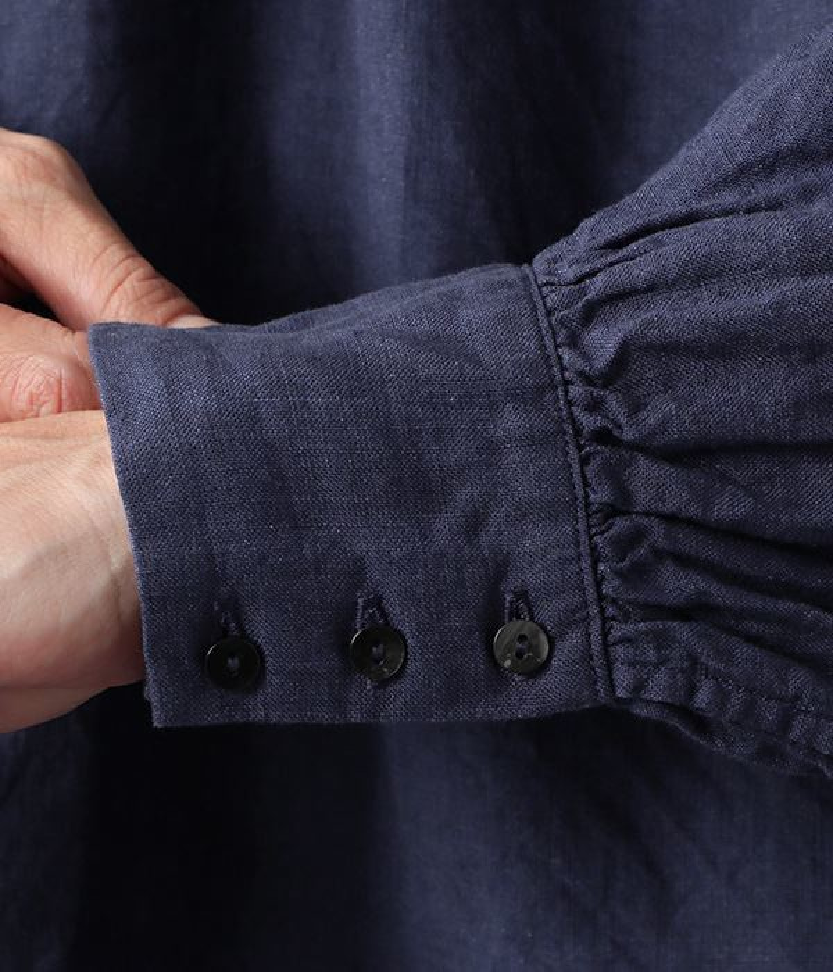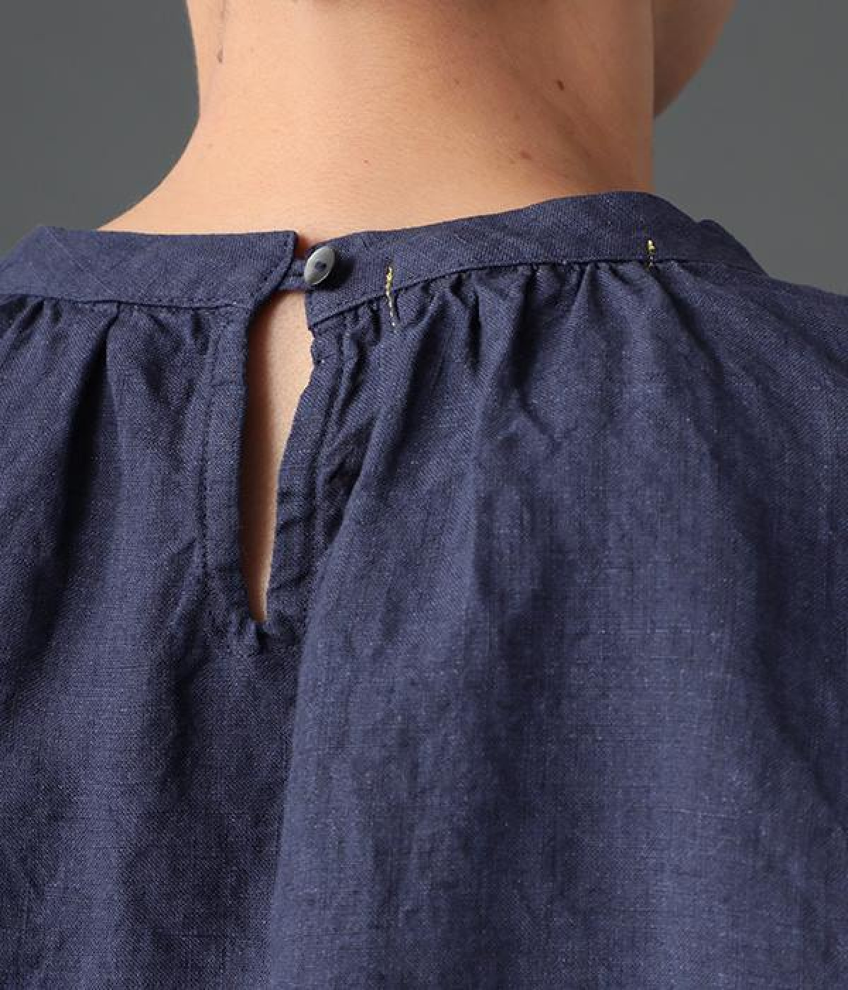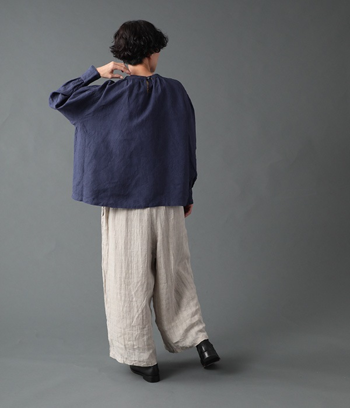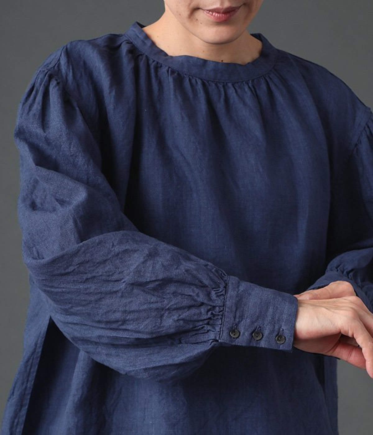 上質なリネンを使用したプルオーバーです。インディゴ染めならではの深い色合いが美しく、着れば着るほどにやわらかくなじみ愛着が増していきます。袖口カフスのブラウスのようなディテールで、カジュアルな雰囲気と品のよさを両立。襟ぐりや袖にきかせたギャザーが、ふわりとしたシルエットを描きます。パンツにもスカートにもバランスがよく、合わせるボトムを選ばない万能なアイテムです。