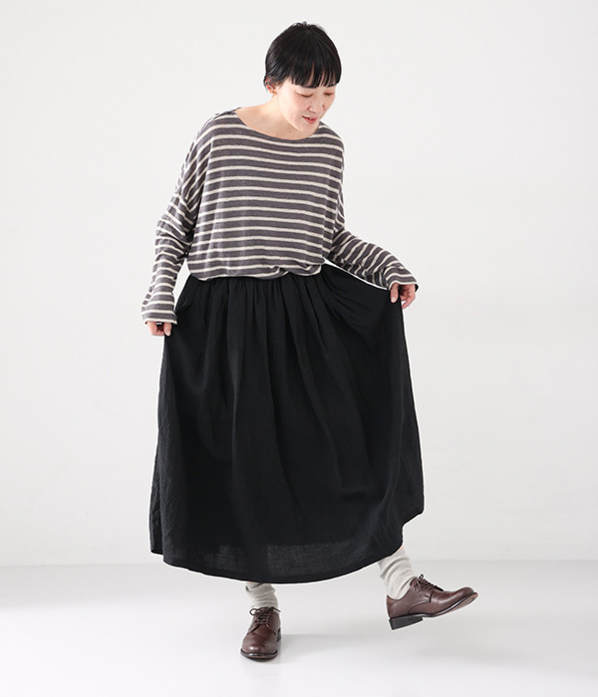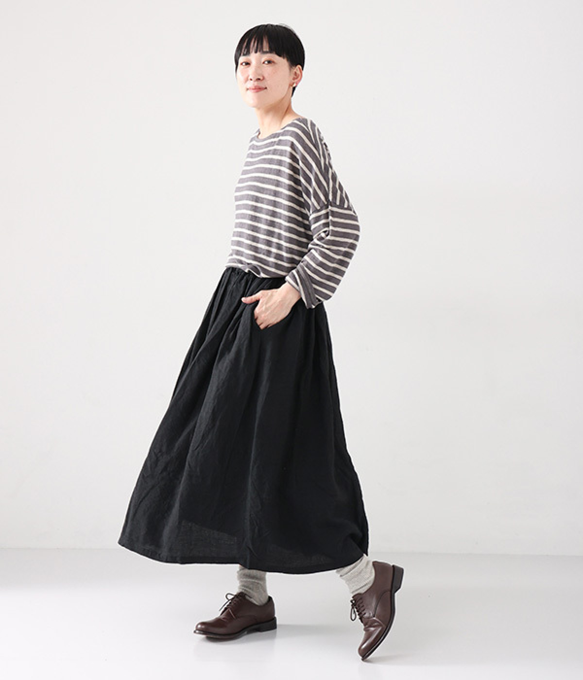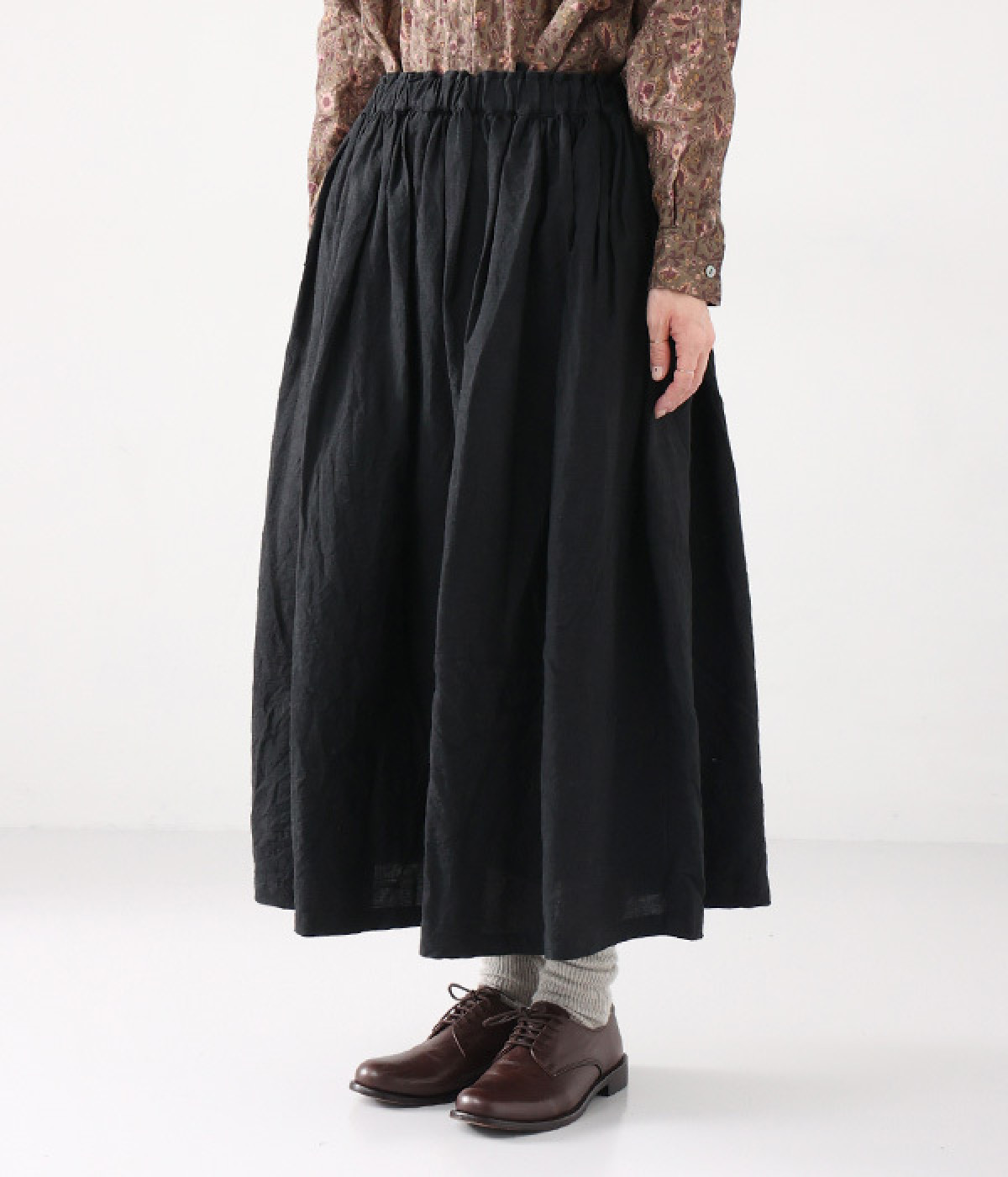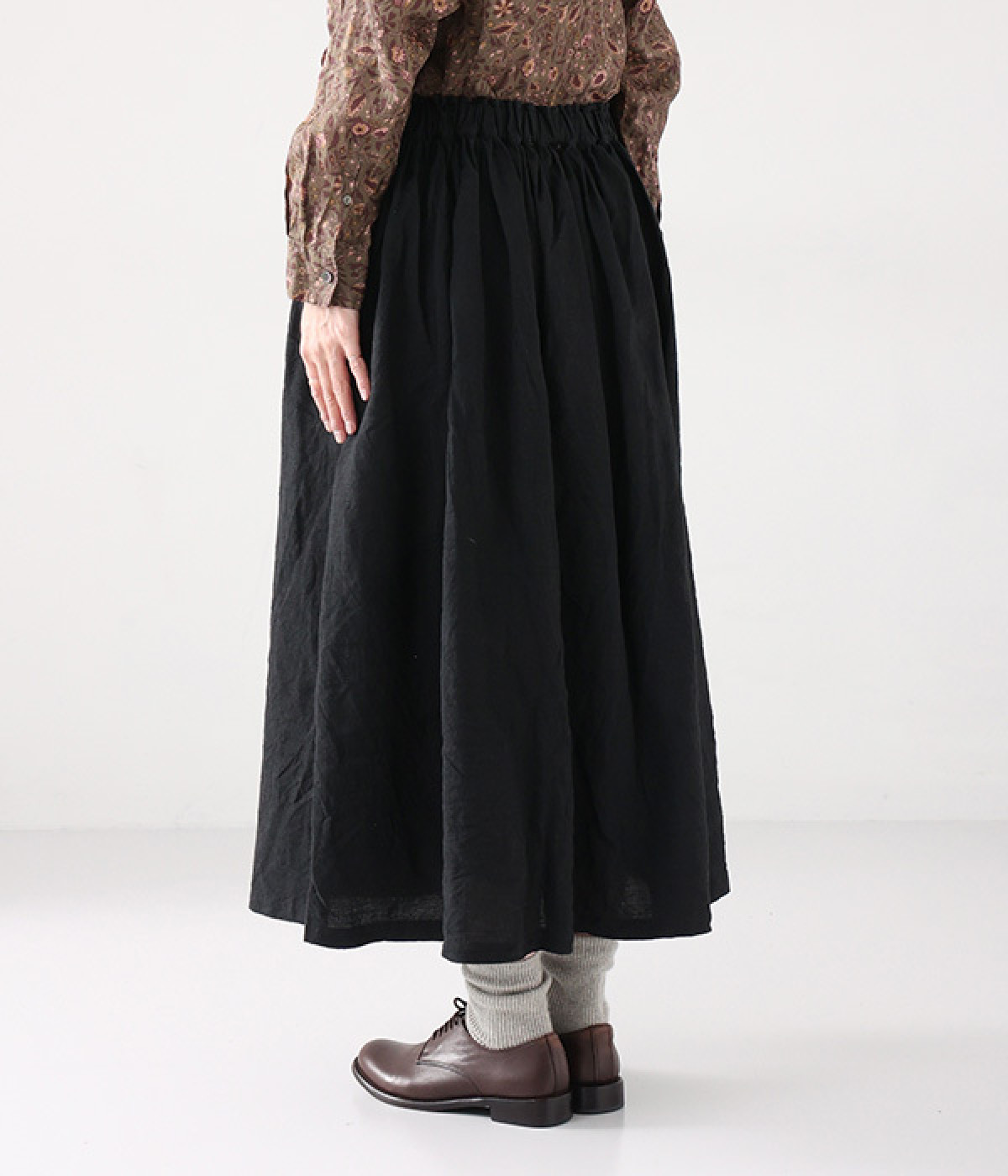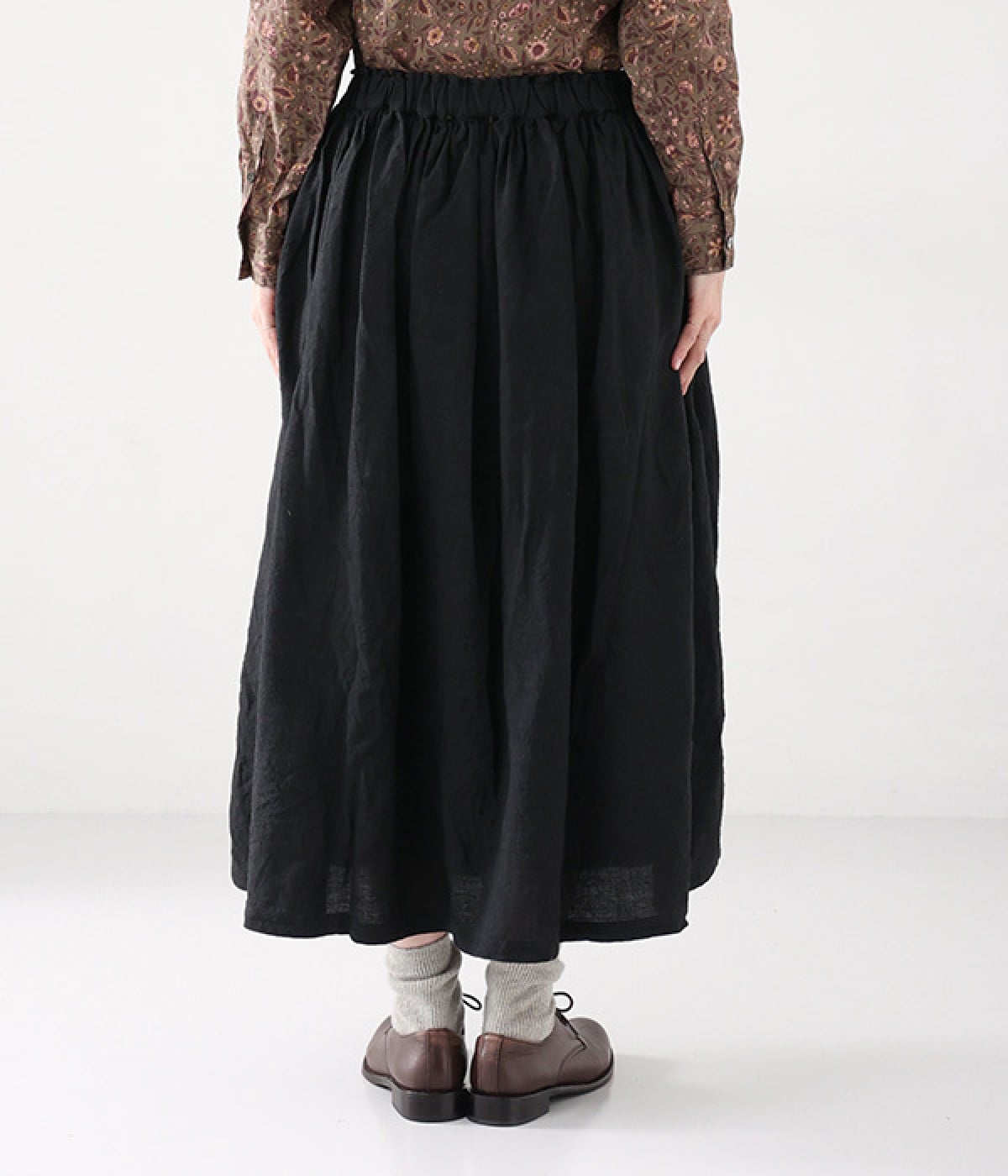 天然素材ならではのざっくりとナチュラルな手ざわりを堪能できるリネンスカート。強めのハリ&シャリをもっているため、ふんわりとしたシルエットがキープされます。腰まわりにはギャザーゴム&タックを入れているので、トップスインでコンパクトに着こなして引き立てるのも◎。透けや肌あたりにも気を配り、薄手のコットン裏地をセットしています。